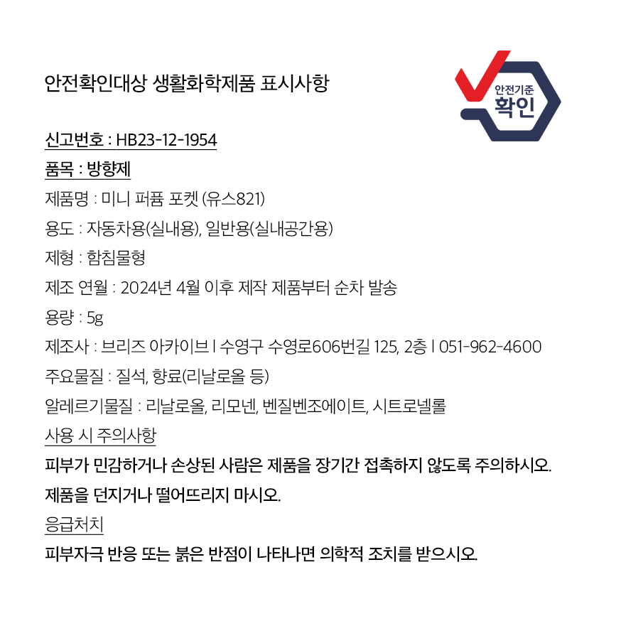 5그램의 샤쉐가 머금을 수 있는 최대치의 향을 첨가하여 제작되었습니다. (발향 기간 : 약 1개월)