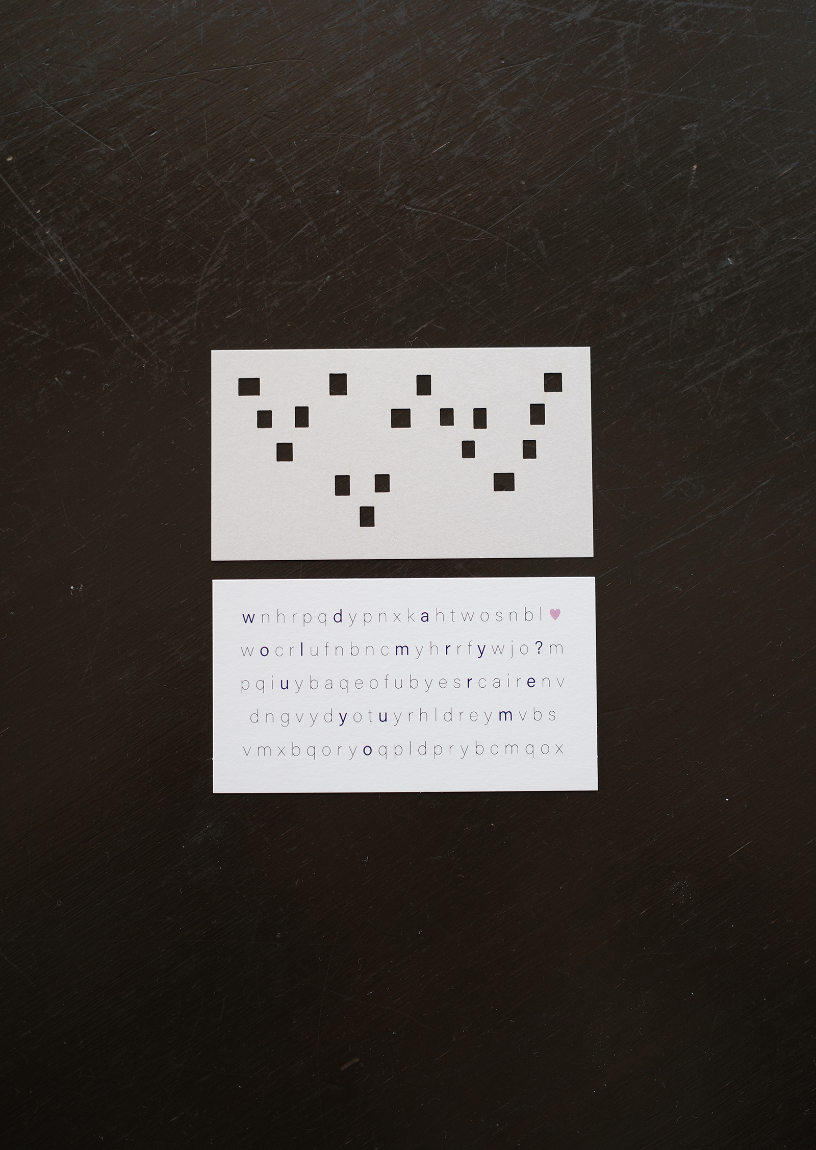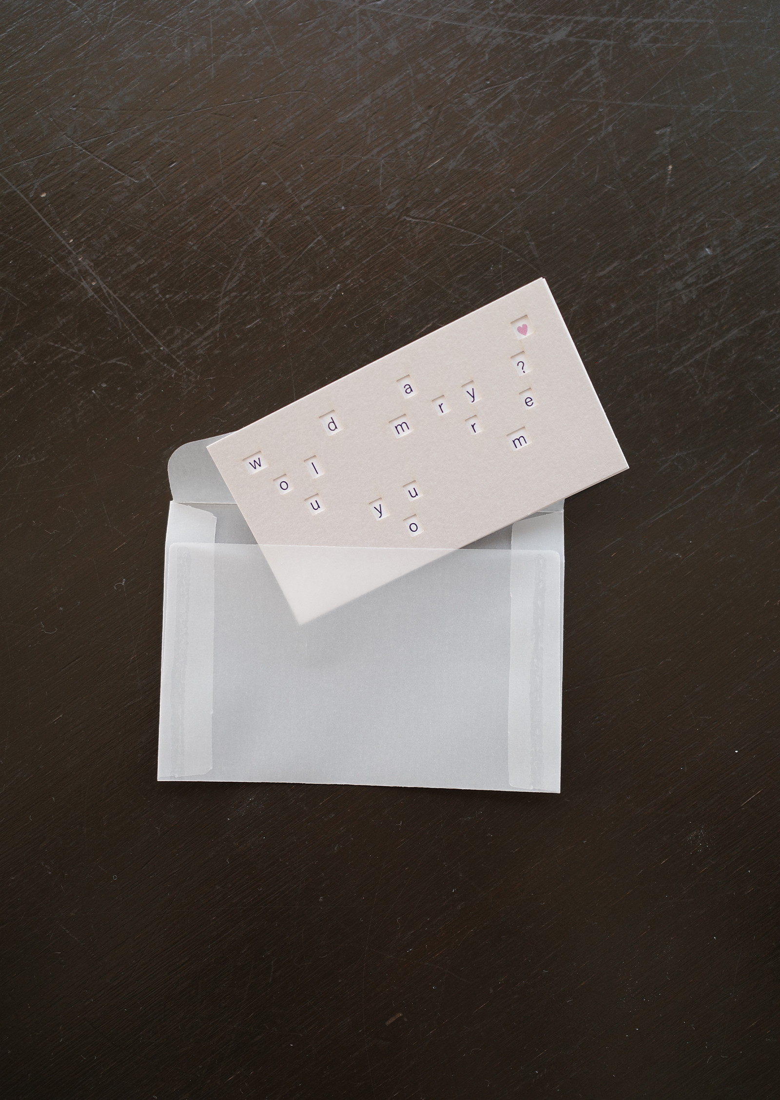 암호처럼 쓰인 알파벳 카드 위에 카드를 겹치면 Would you marry me? 💞 글자가 나타납니다.