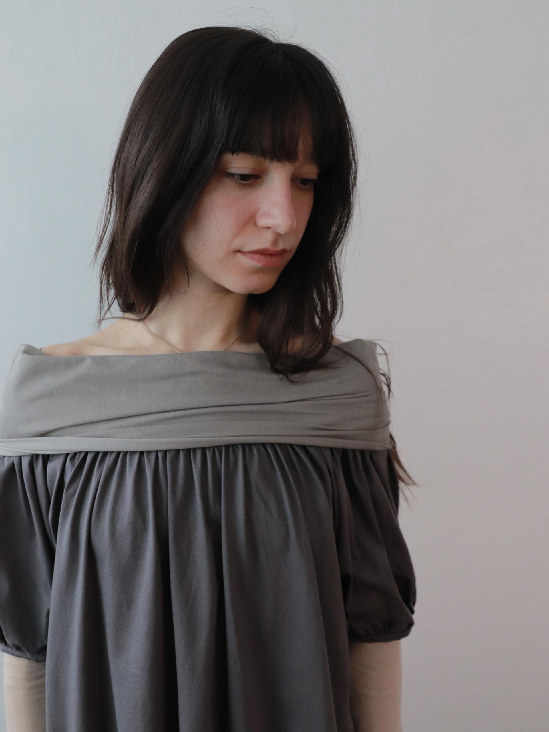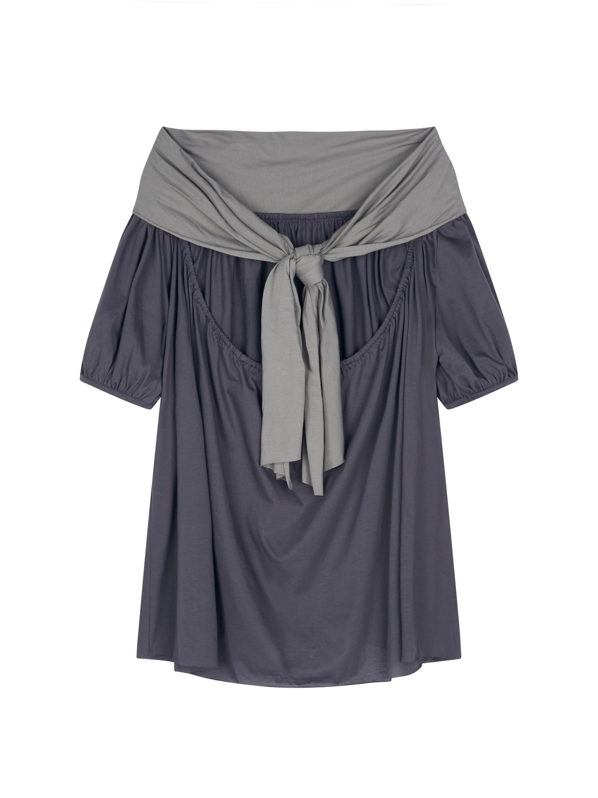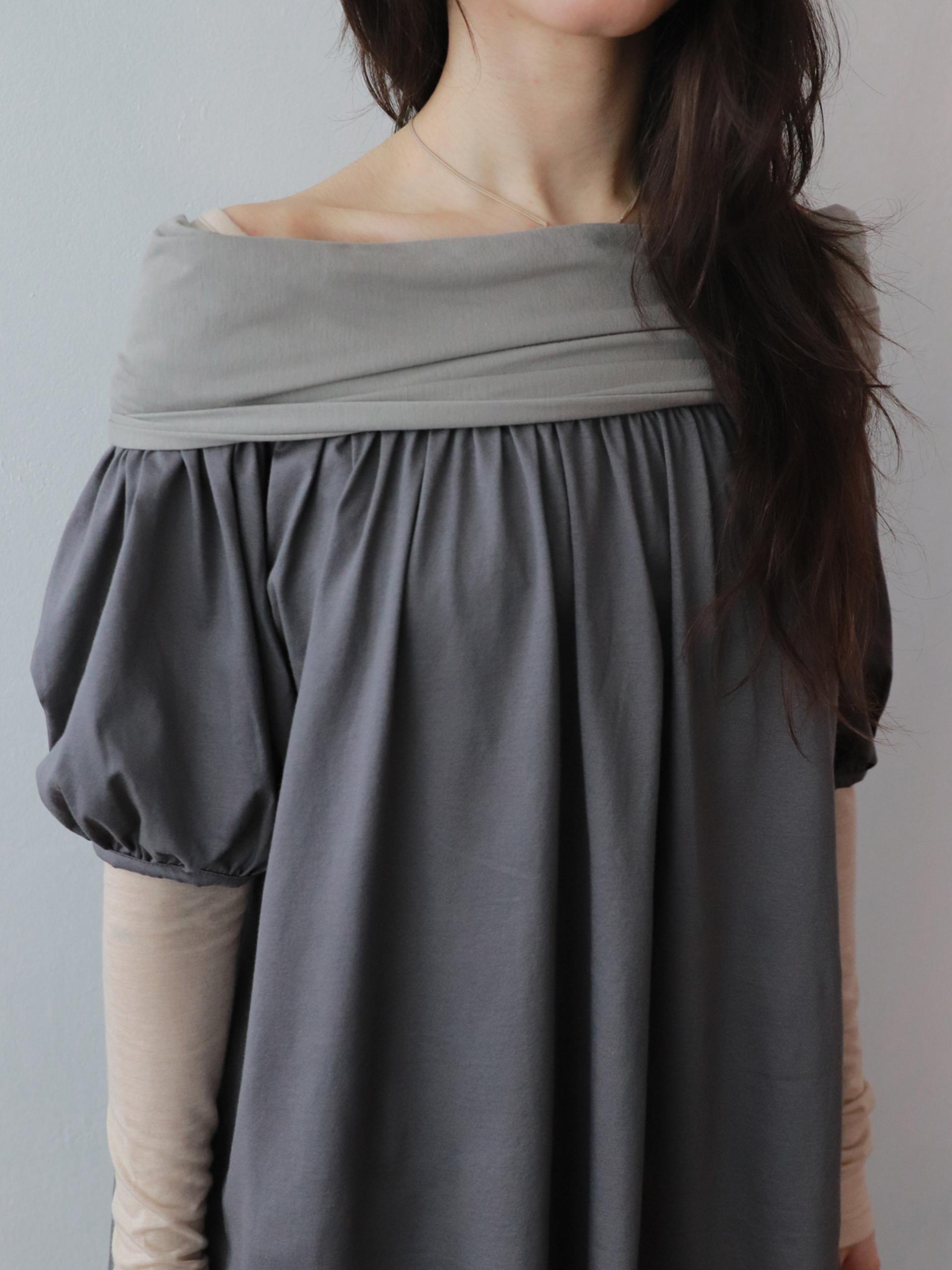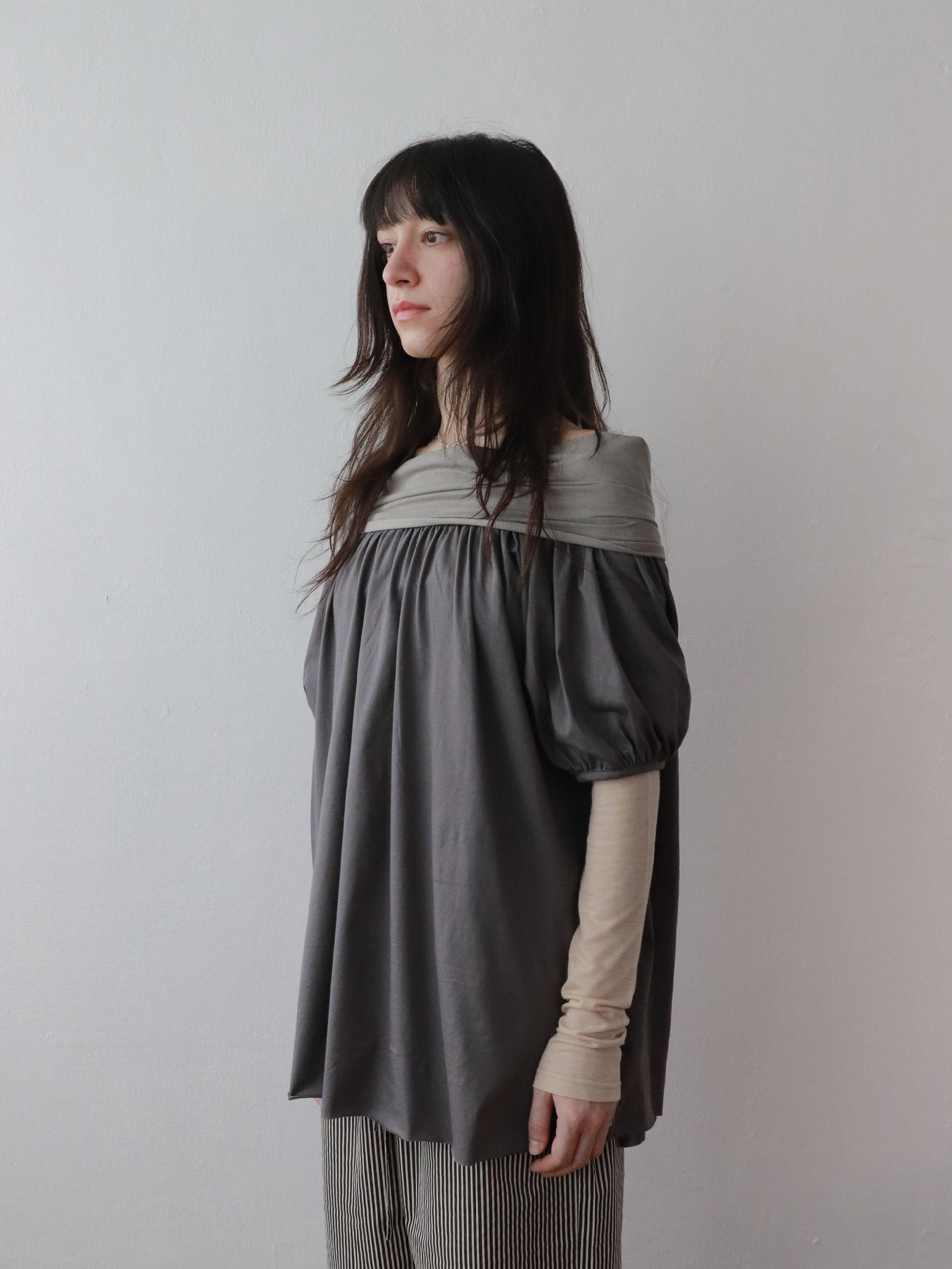 빈티지한 무드의 배색 그레이 오프숄더 탑입니다.