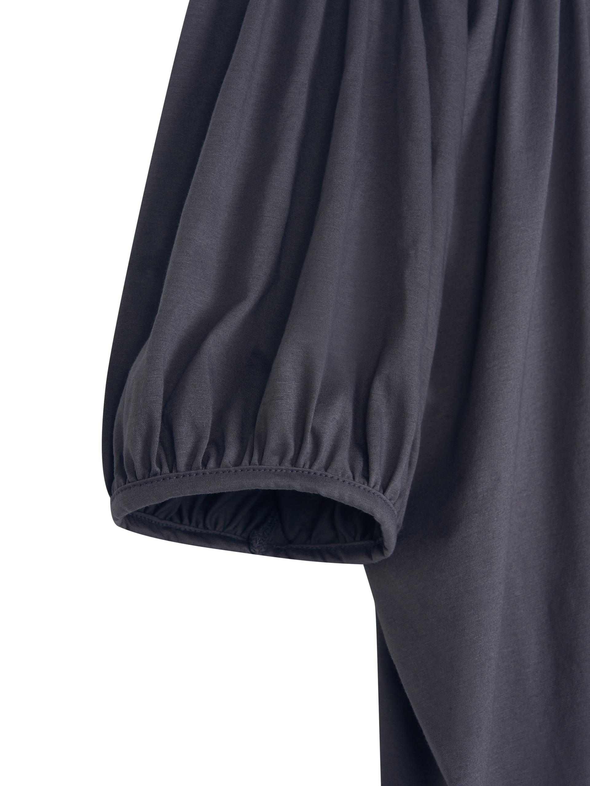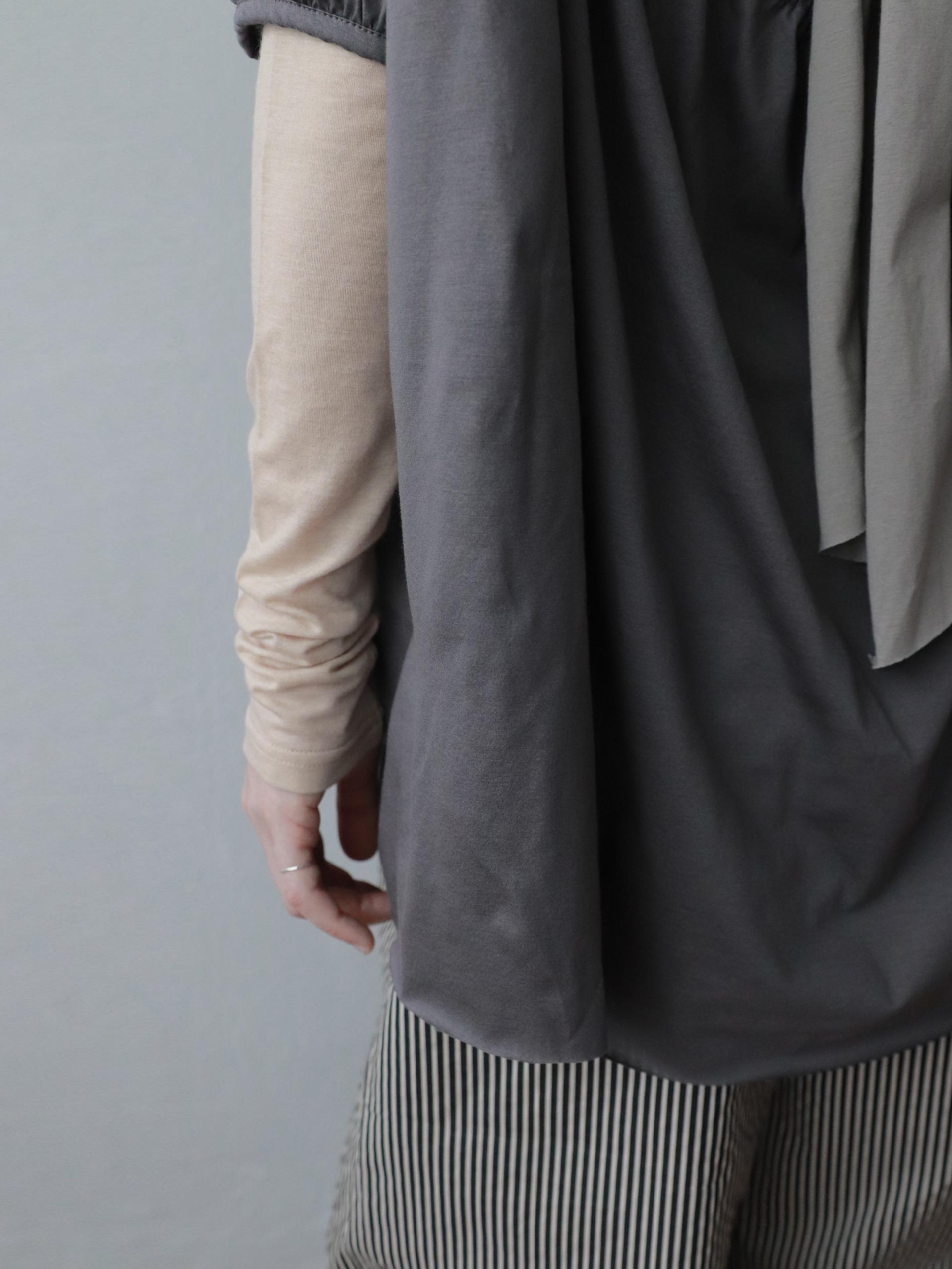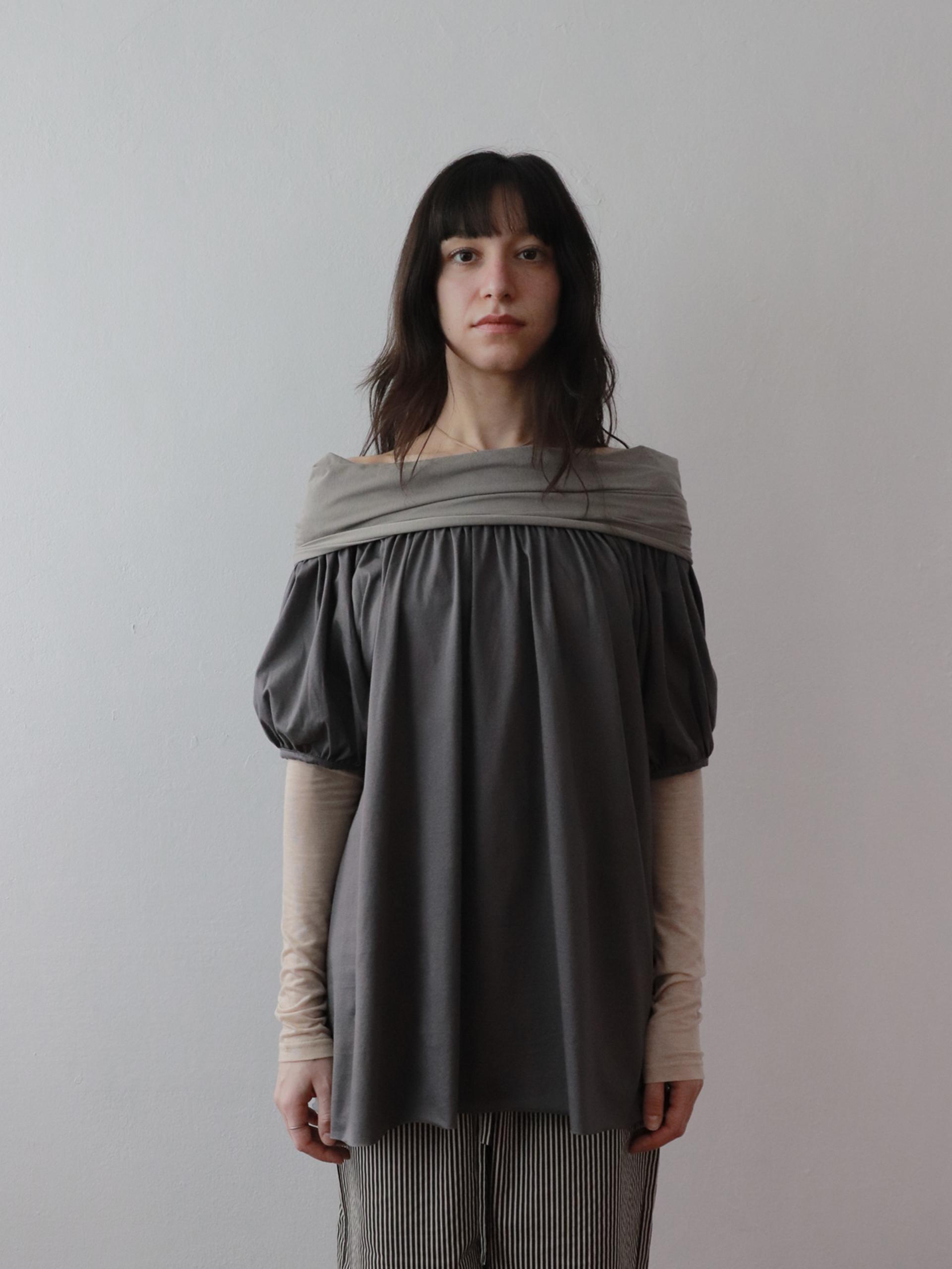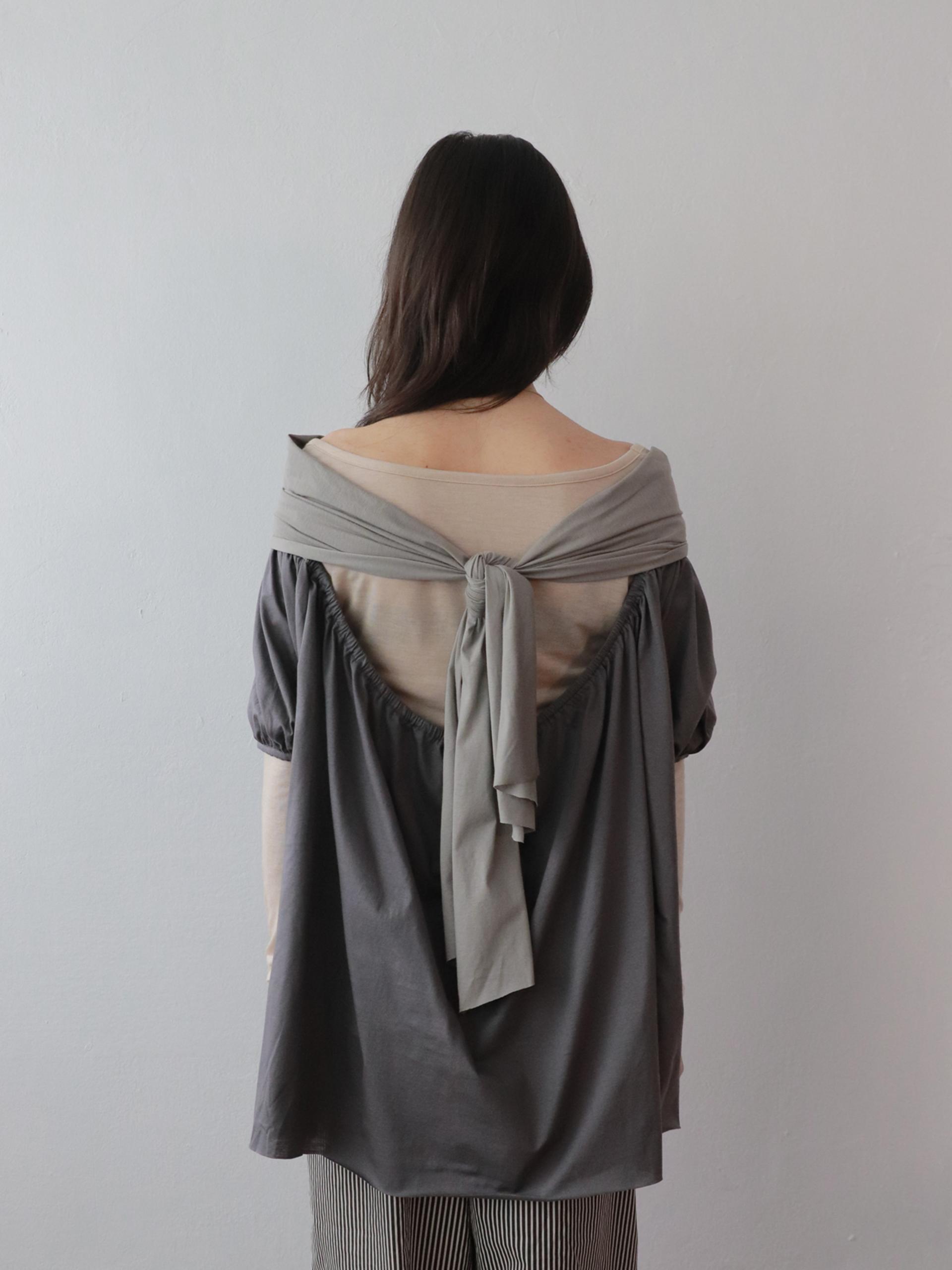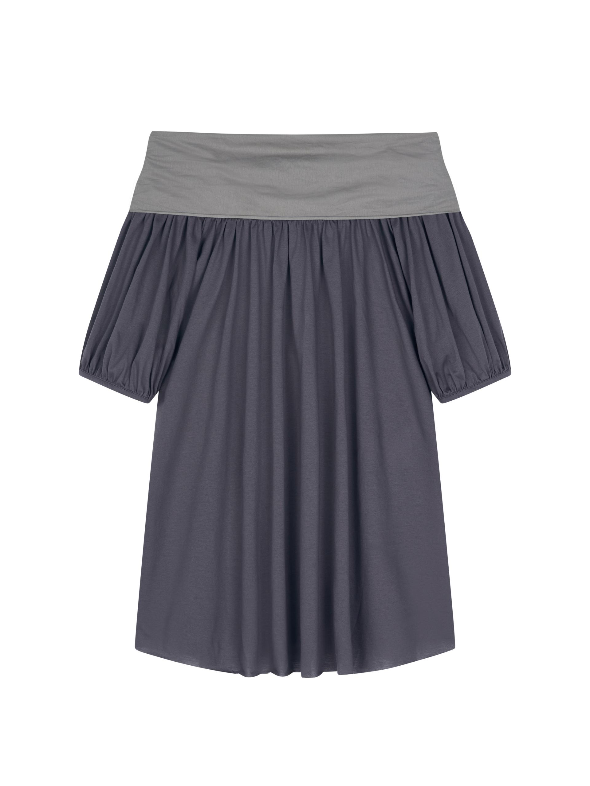 빈티지한 무드의 배색 그레이 오프숄더 탑입니다.