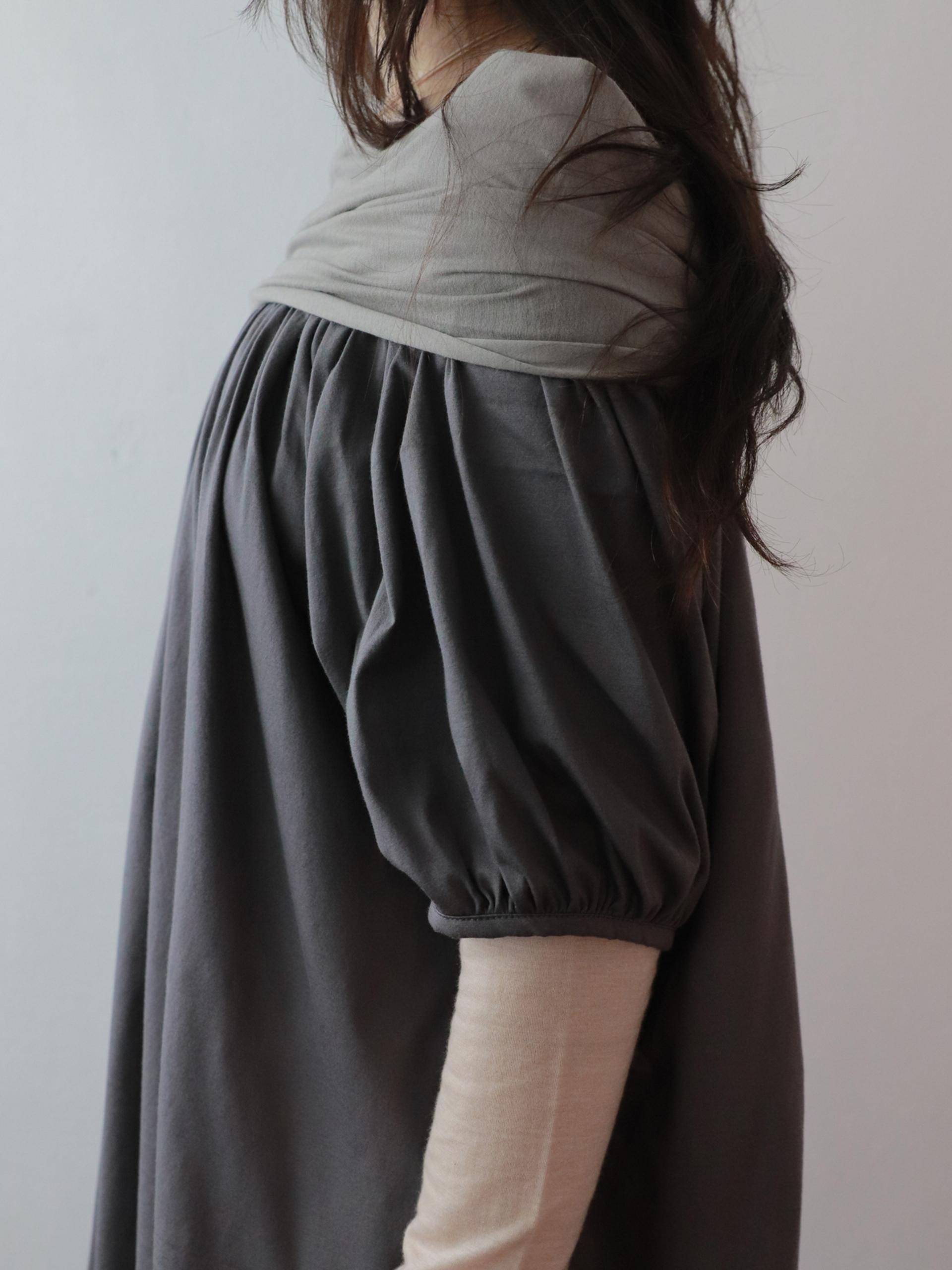 가슴부터 등까지 이어지는 밴딩셔링이 밑단까지 자연스럽게 퍼지는 주름을 자아내며 한층 더 러블리한 무드를 전달합니다.