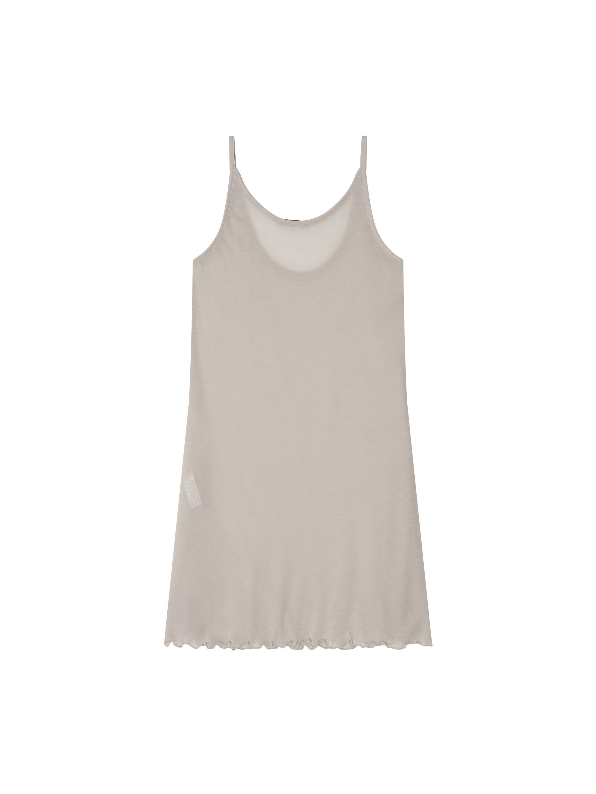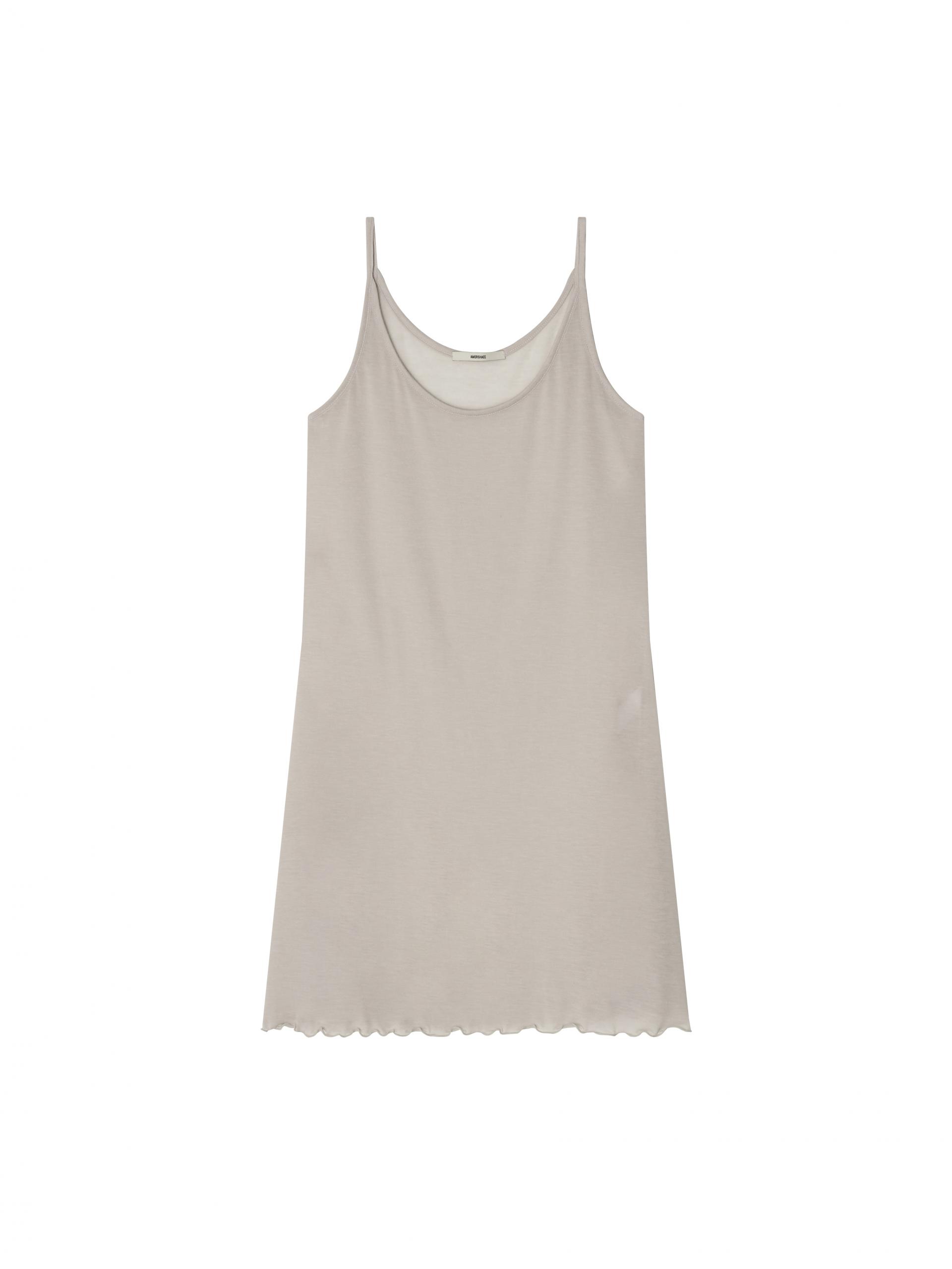 부드러운 회색의 드레스는 텐셀 원단을 사용하여 착용감이 매우 좋고 부드럽습니다.