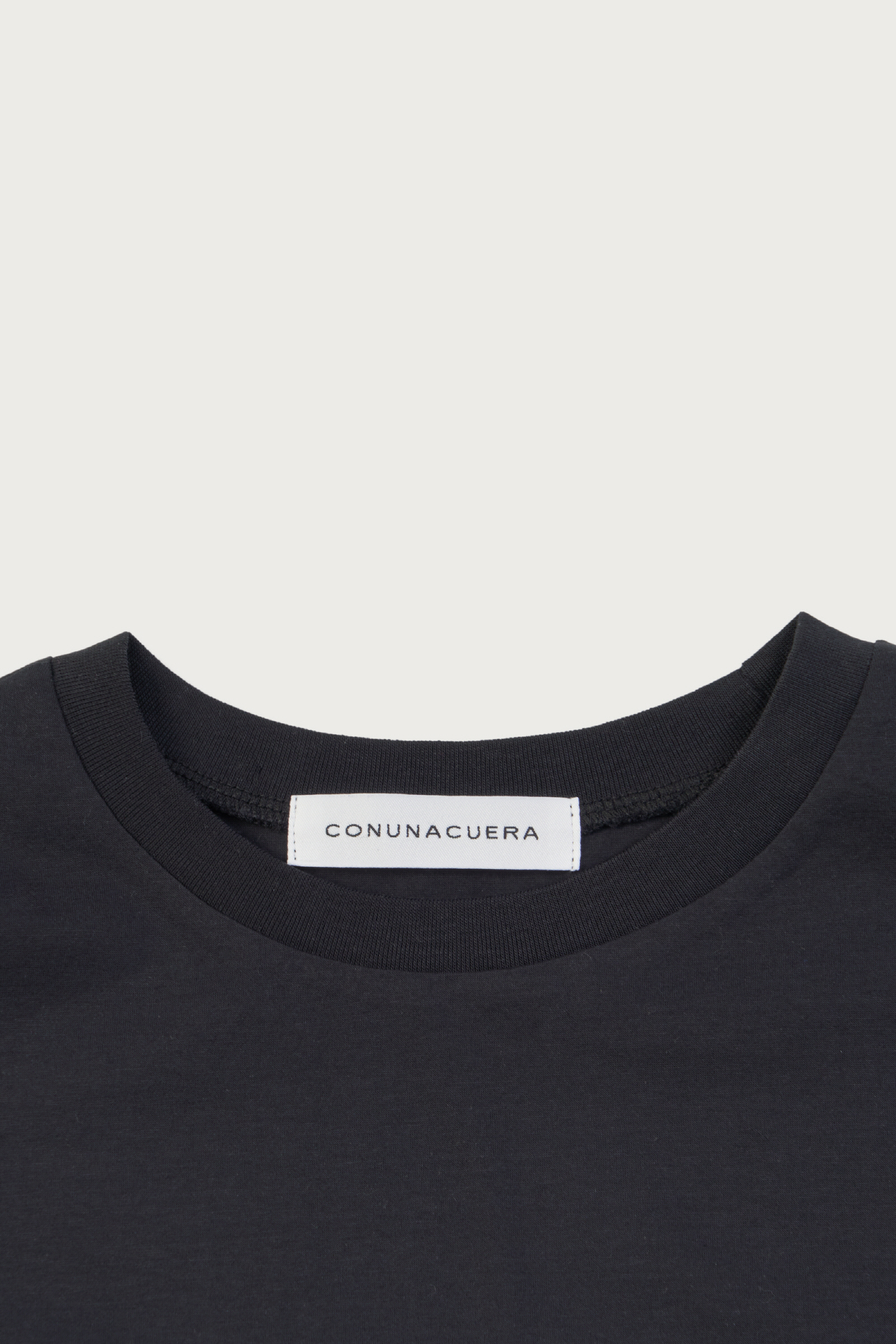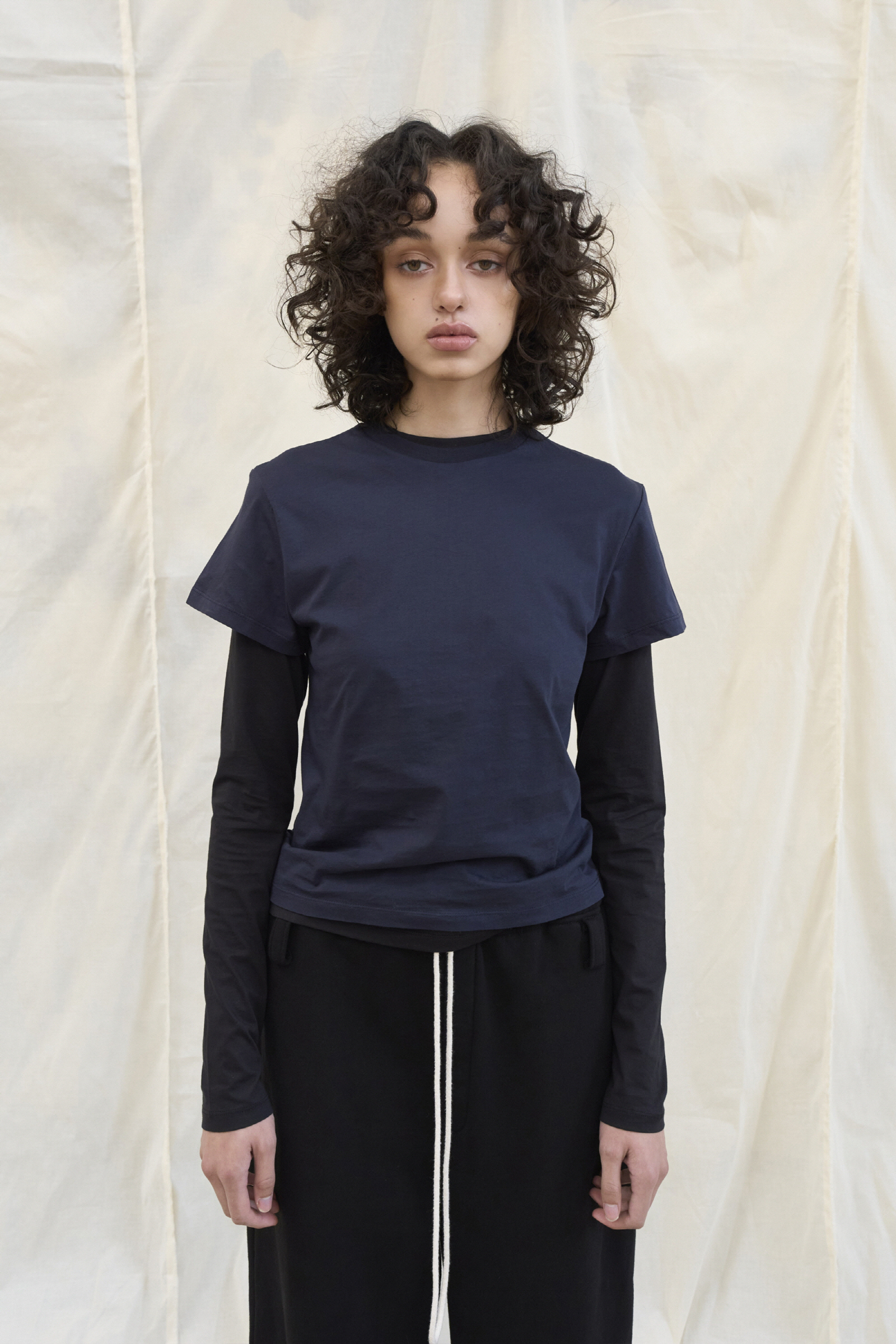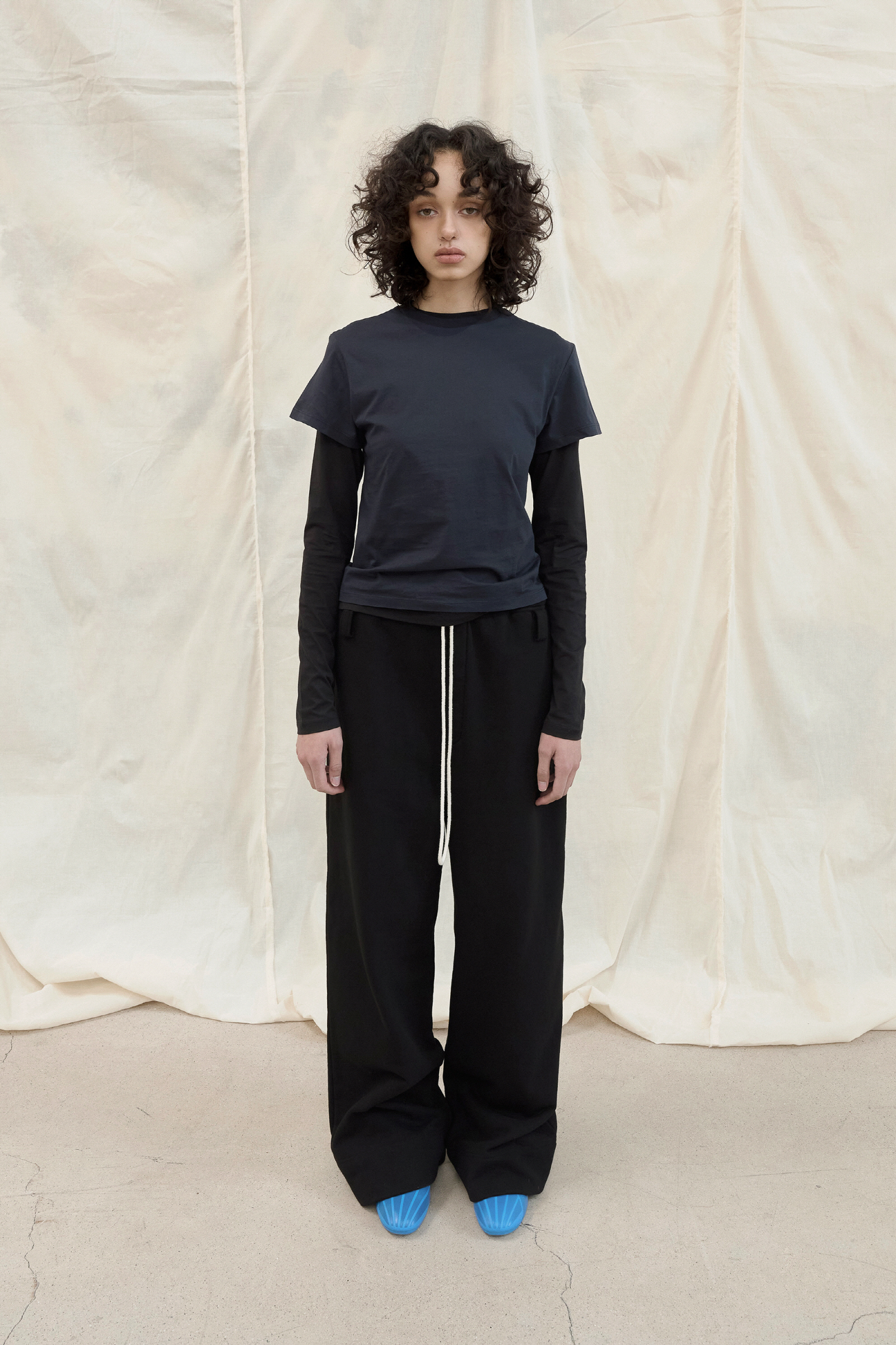 같은 소재의 크루넥 티셔츠와 레이어드하여 스타일링할 수 있습니다.