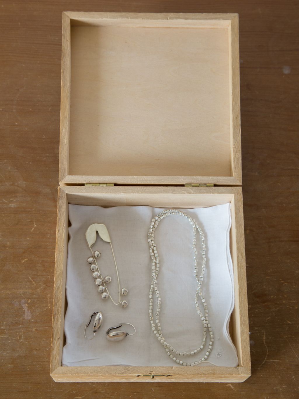 실버로 도금된 비즈를 실크 실로 손수 엮었습니다.