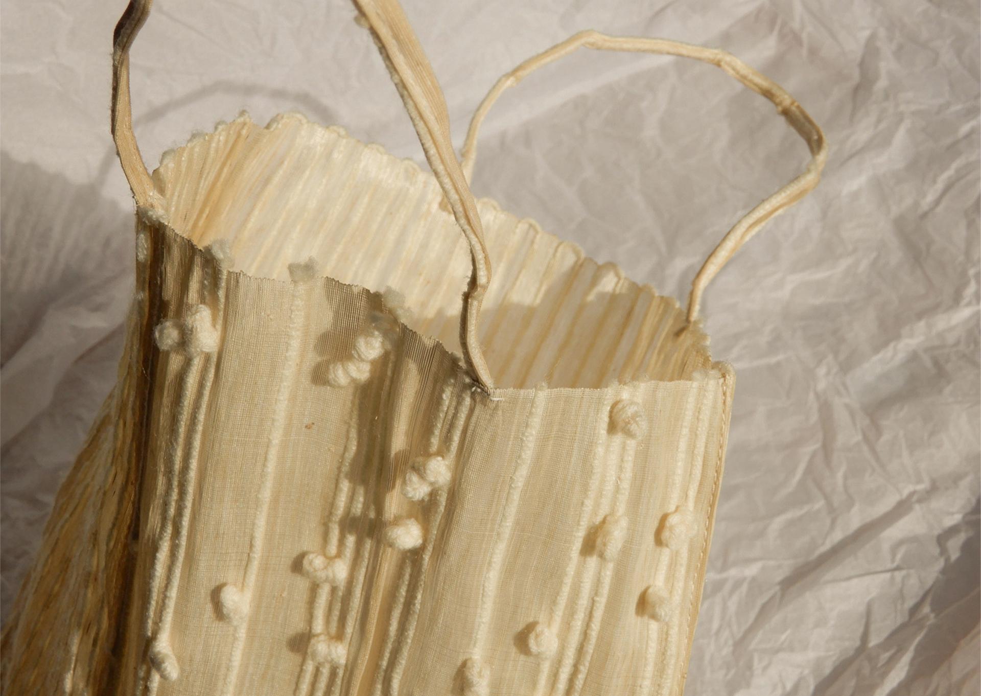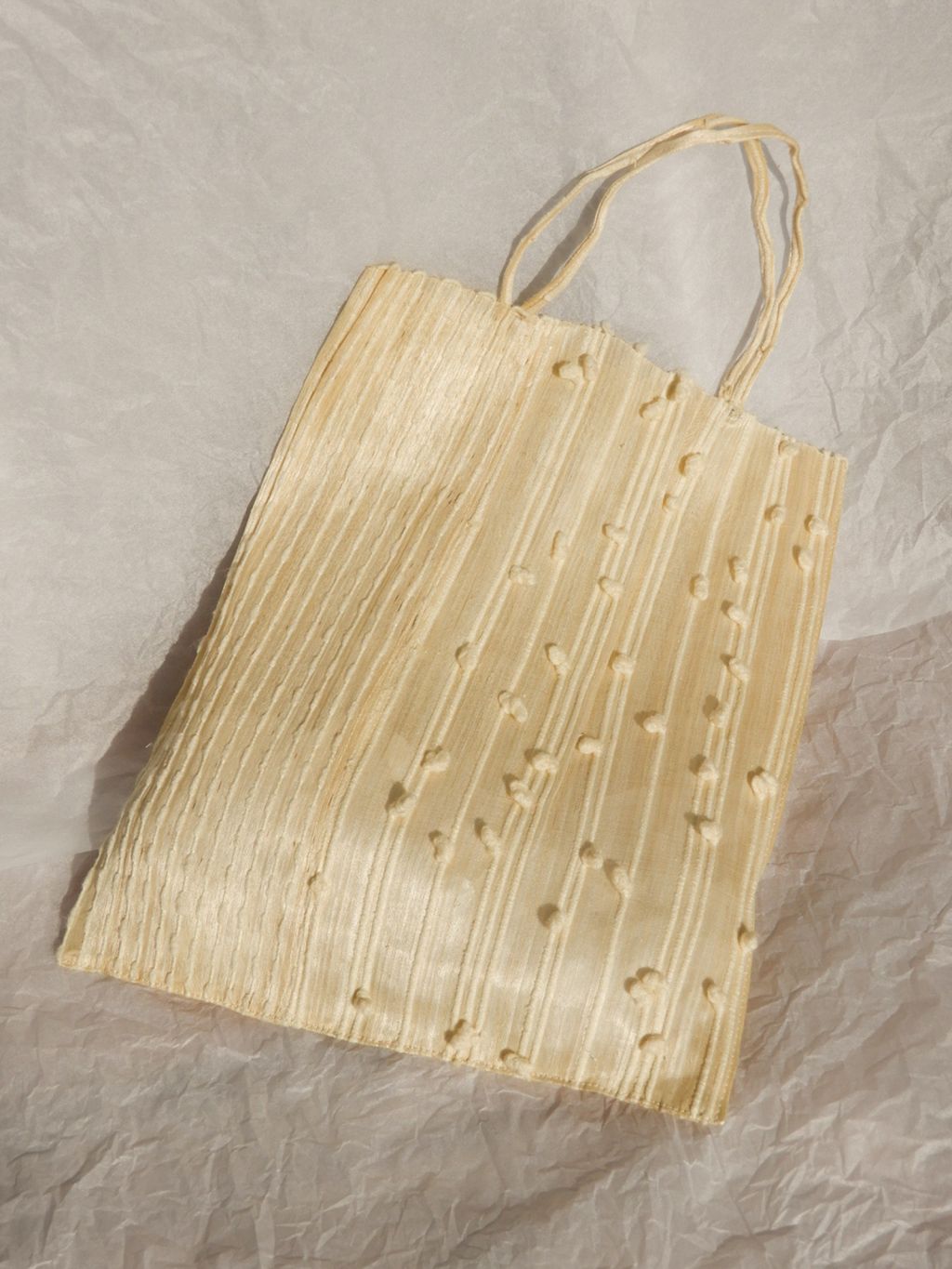 필리핀 아클란에서 염색되지 않은 아바카와 실크, 실을 섞어 손으로 짜여진 직물을 이용하여 만들어진 가방입니다. 이 중 아바카는 필리핀 원산의 바나나 식물로 만들어진 섬유로 가방에 광택을 더해주는데요.