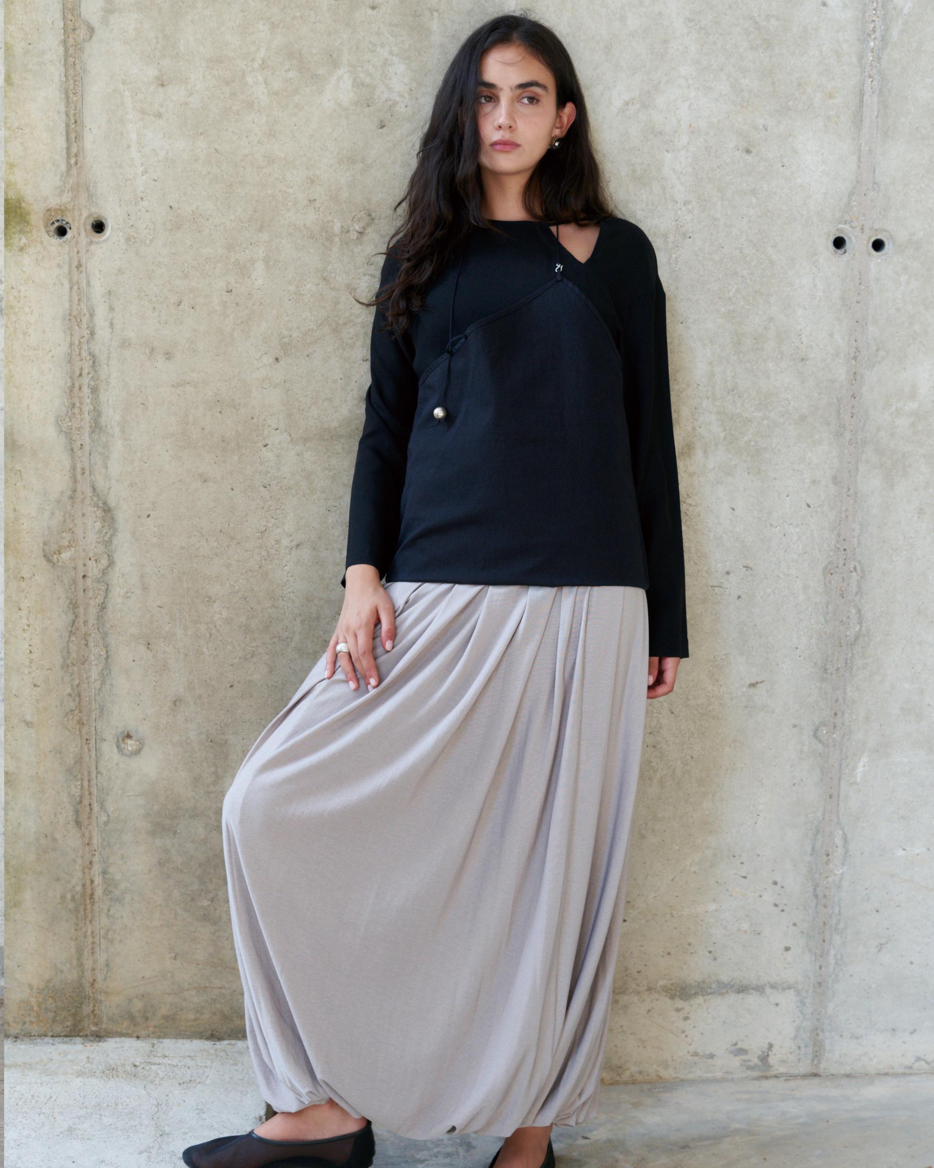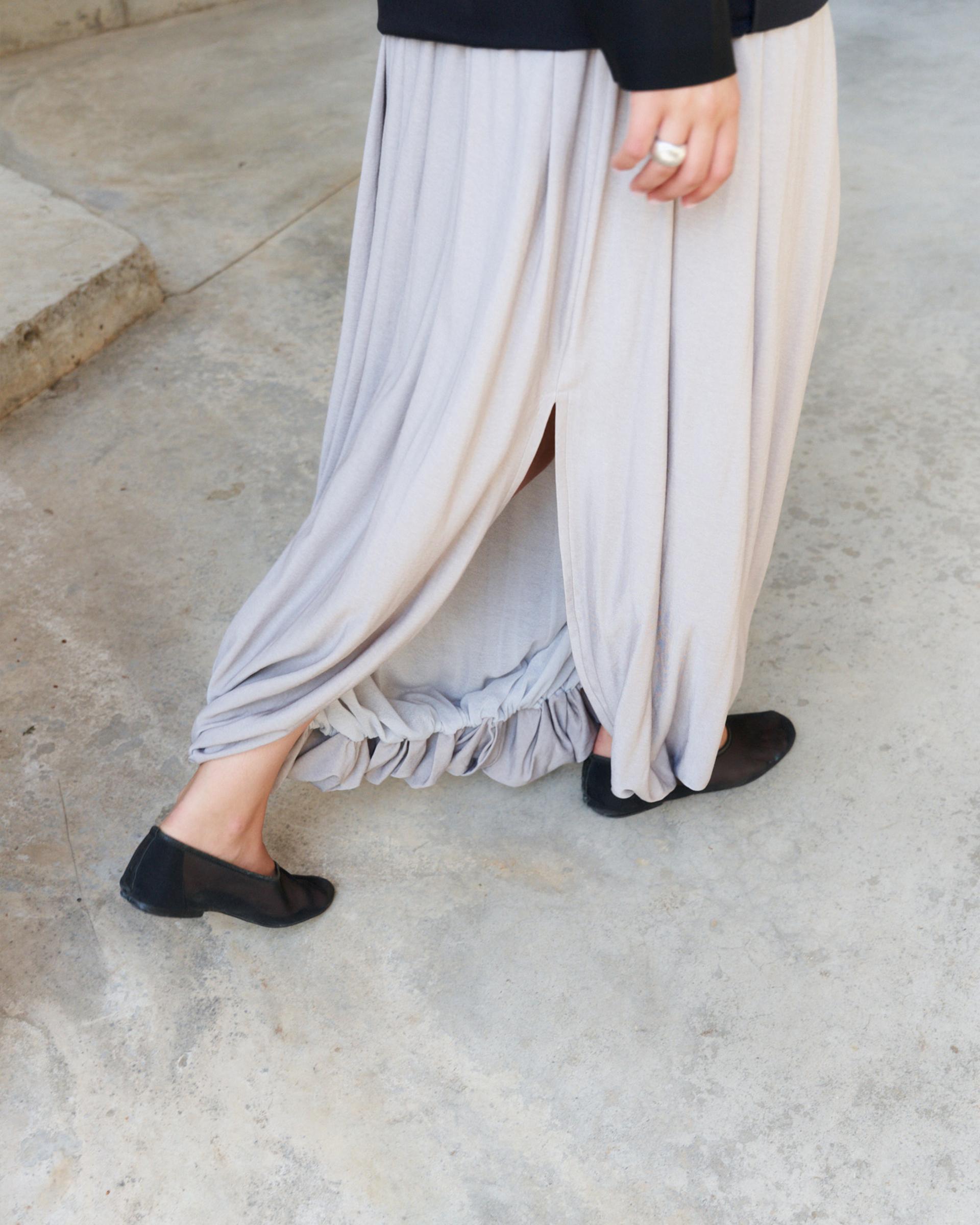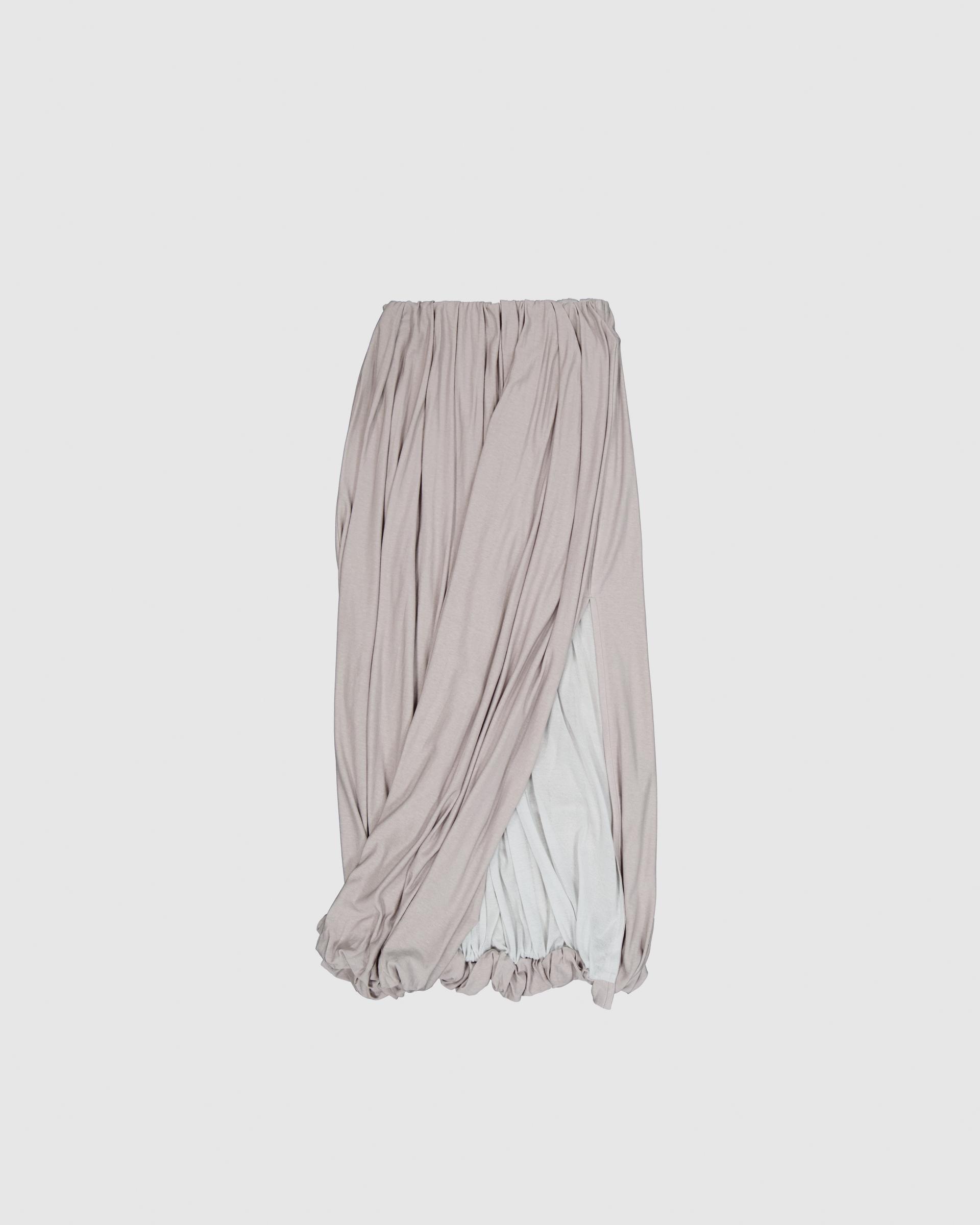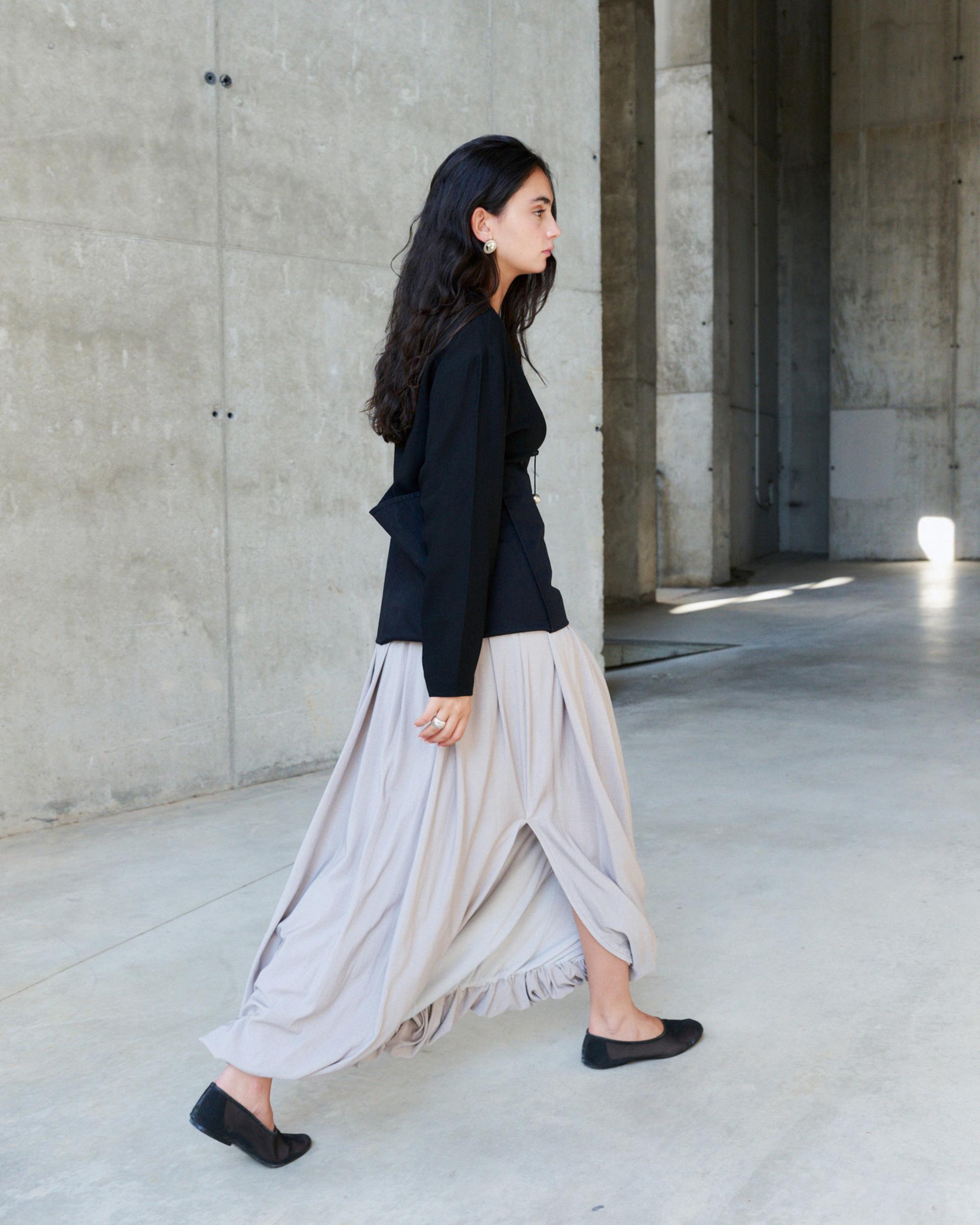 코쿤 실루엣의 주름이 들어간 풀 기장 밴딩 스커트