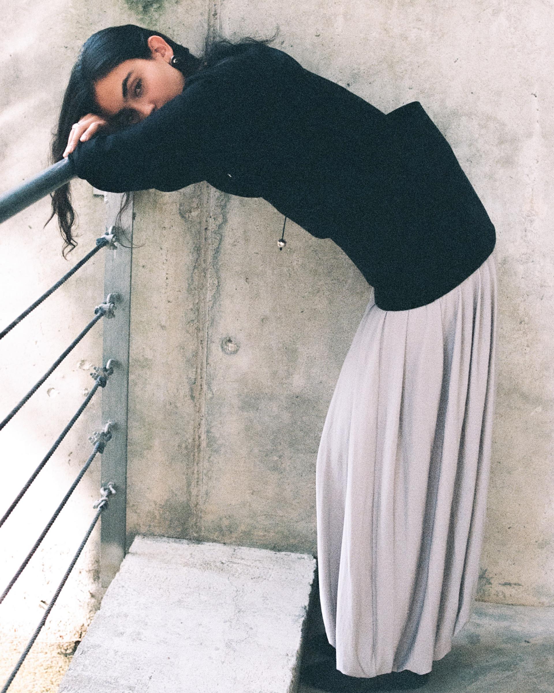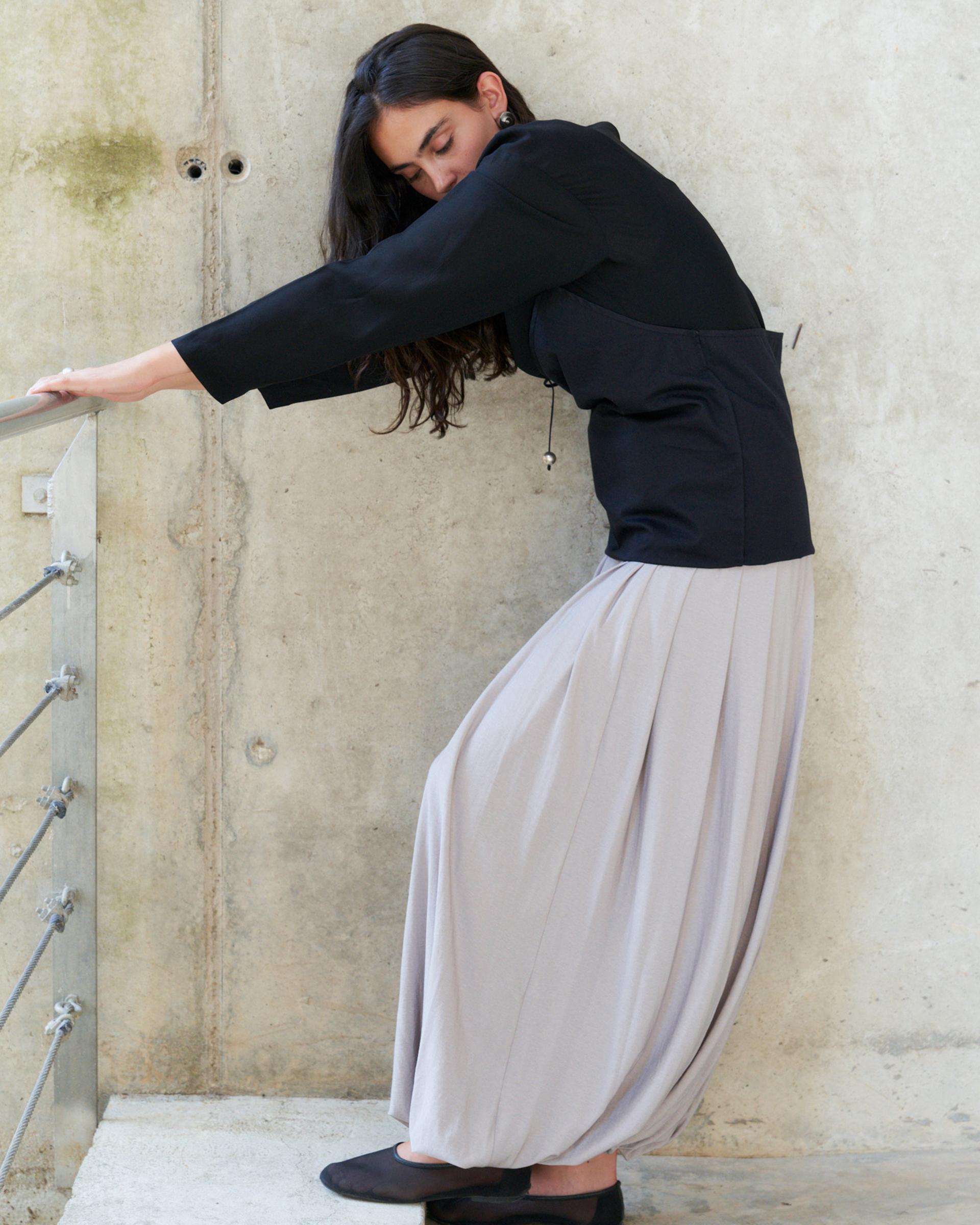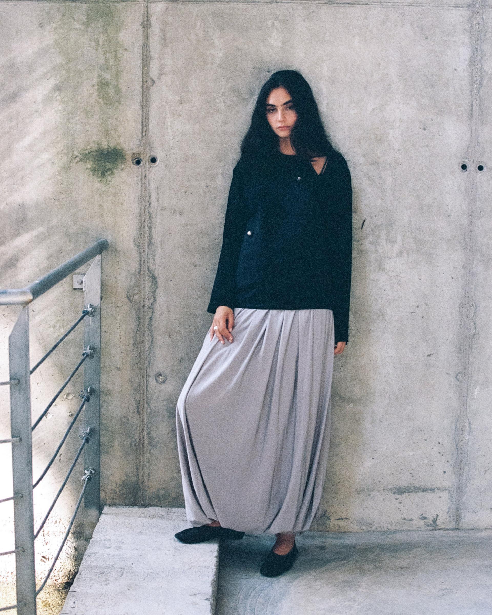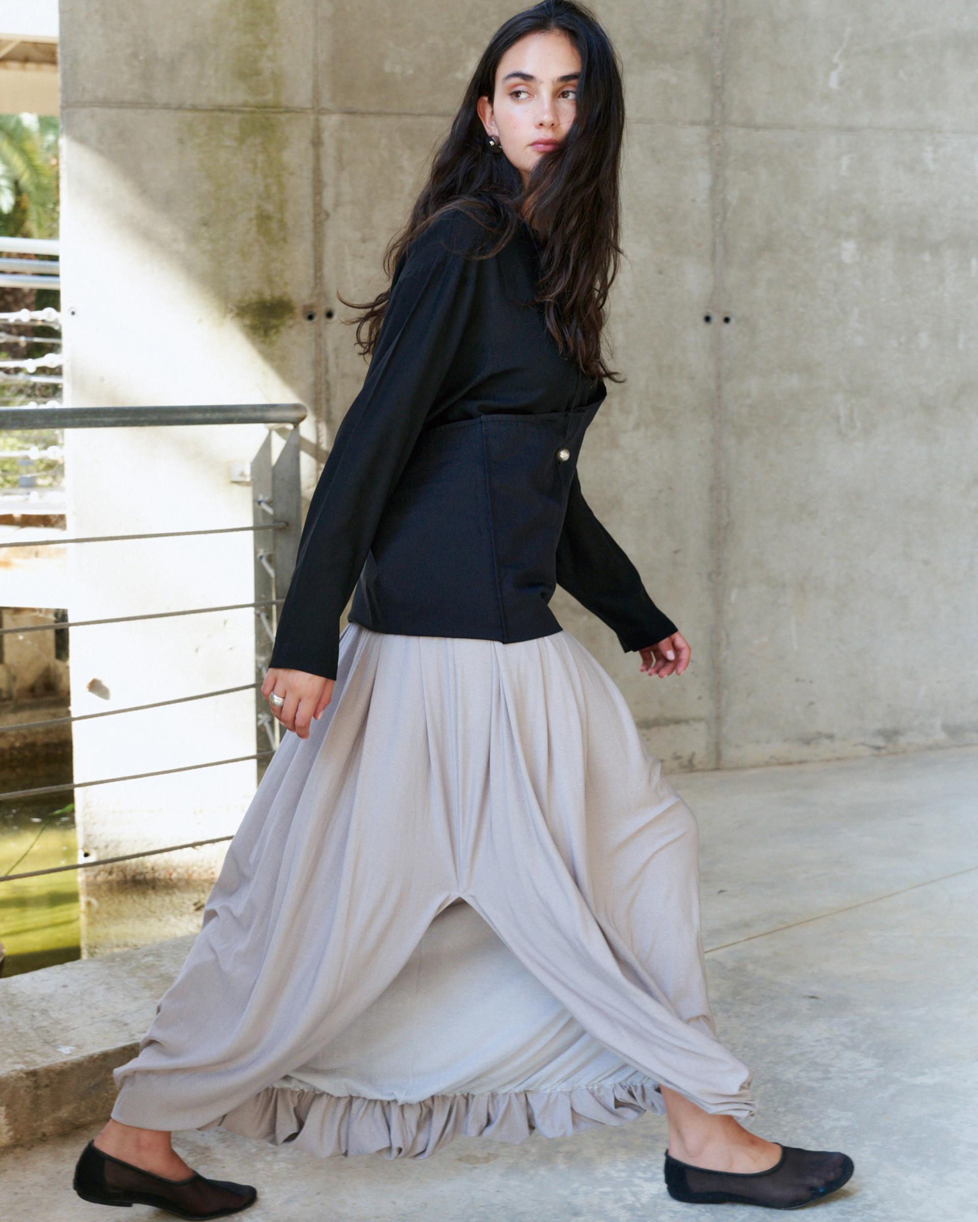 코쿤 실루엣의 주름이 들어간 풀 기장 밴딩 스커트