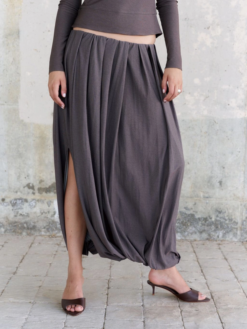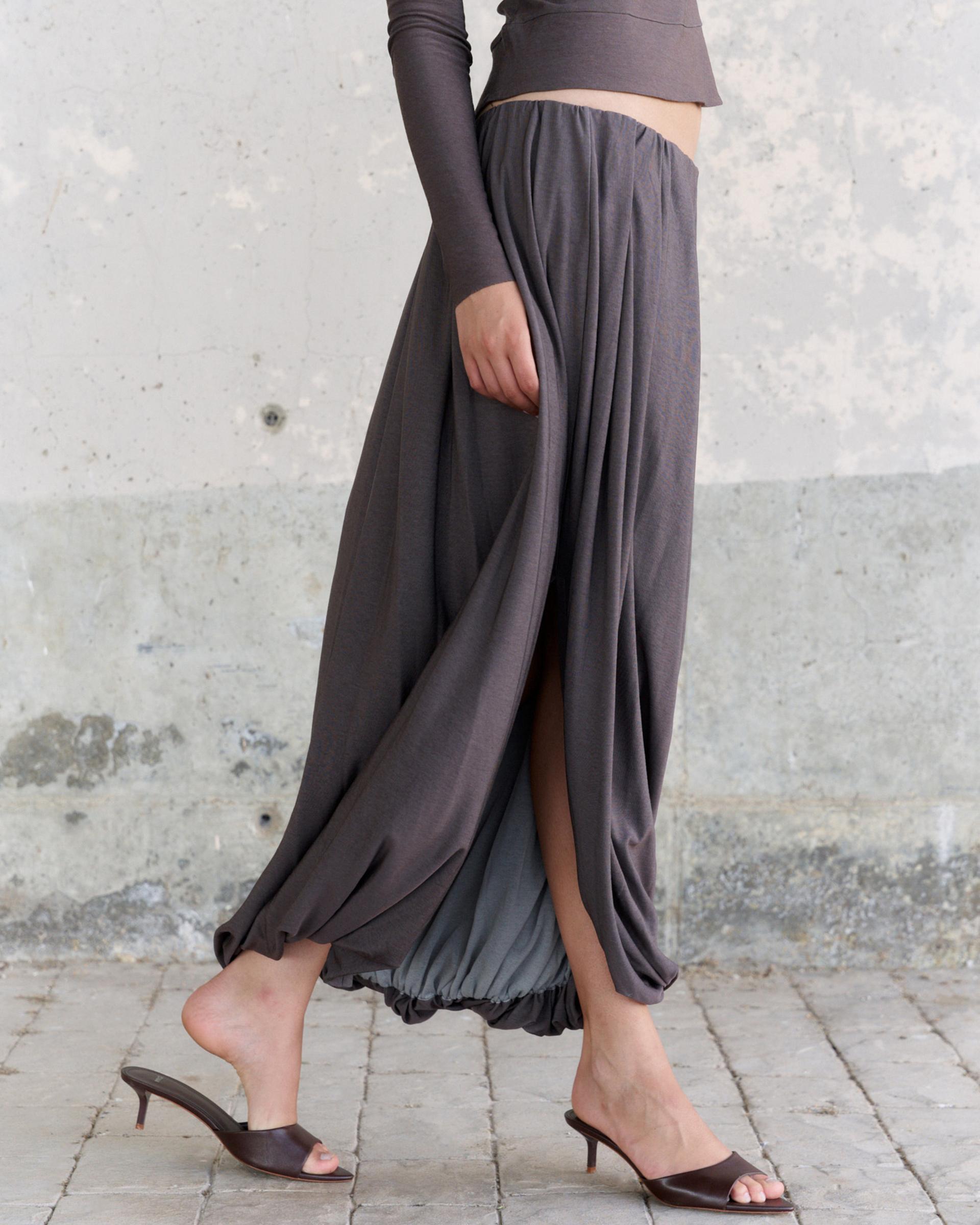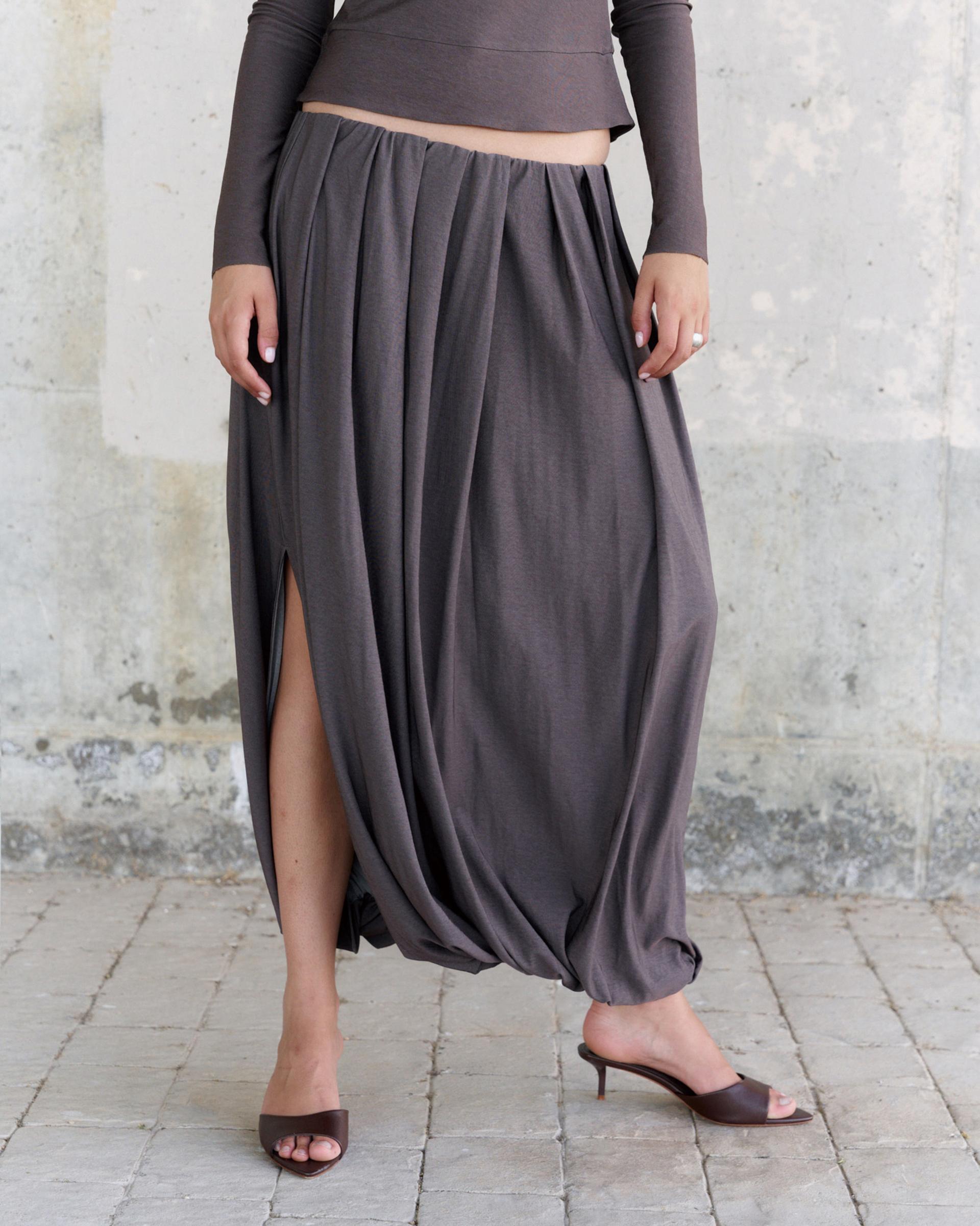 코쿤 실루엣의 주름이 들어간 풀 기장 밴딩 스커트