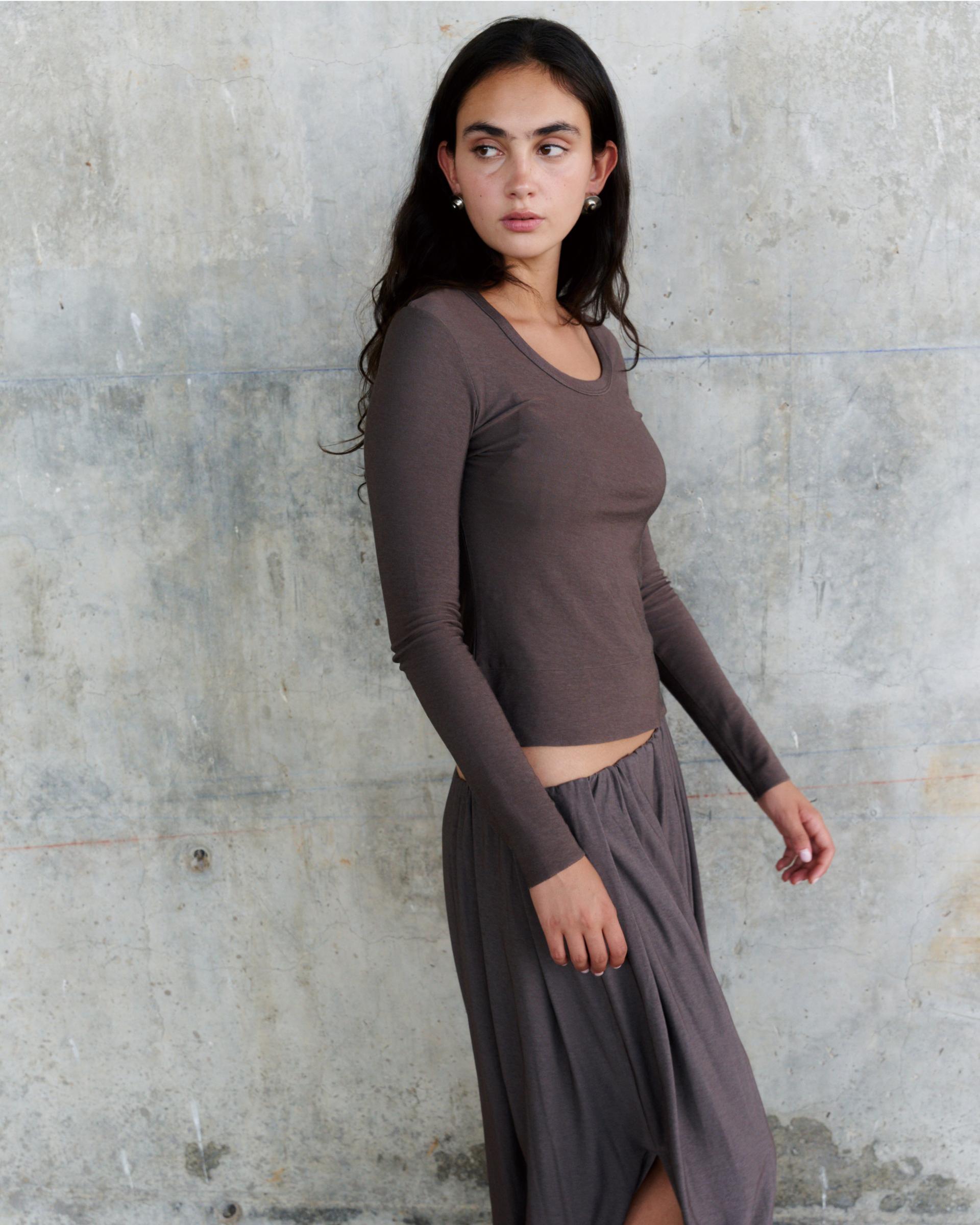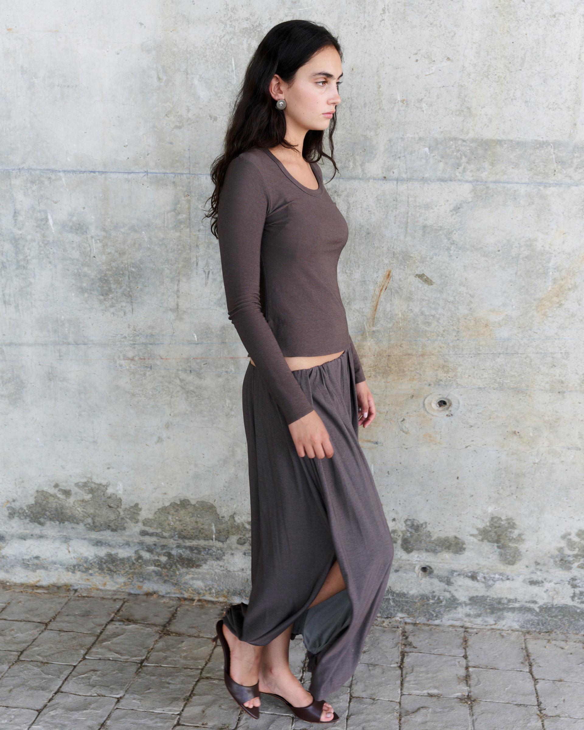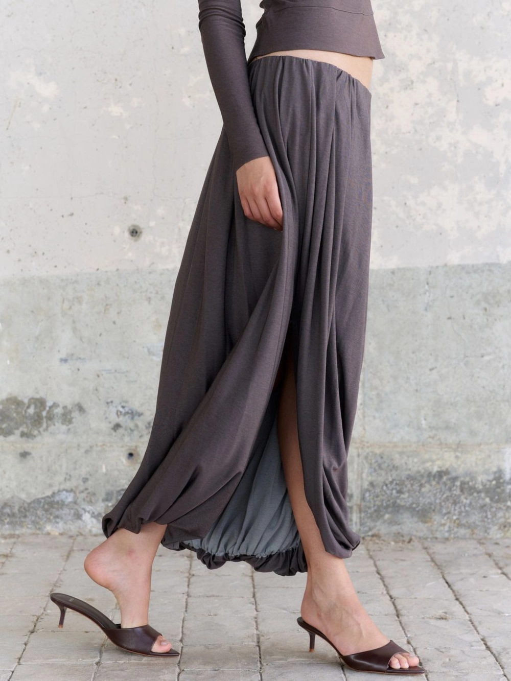 코쿤 실루엣의 주름이 들어간 풀 기장 밴딩 스커트