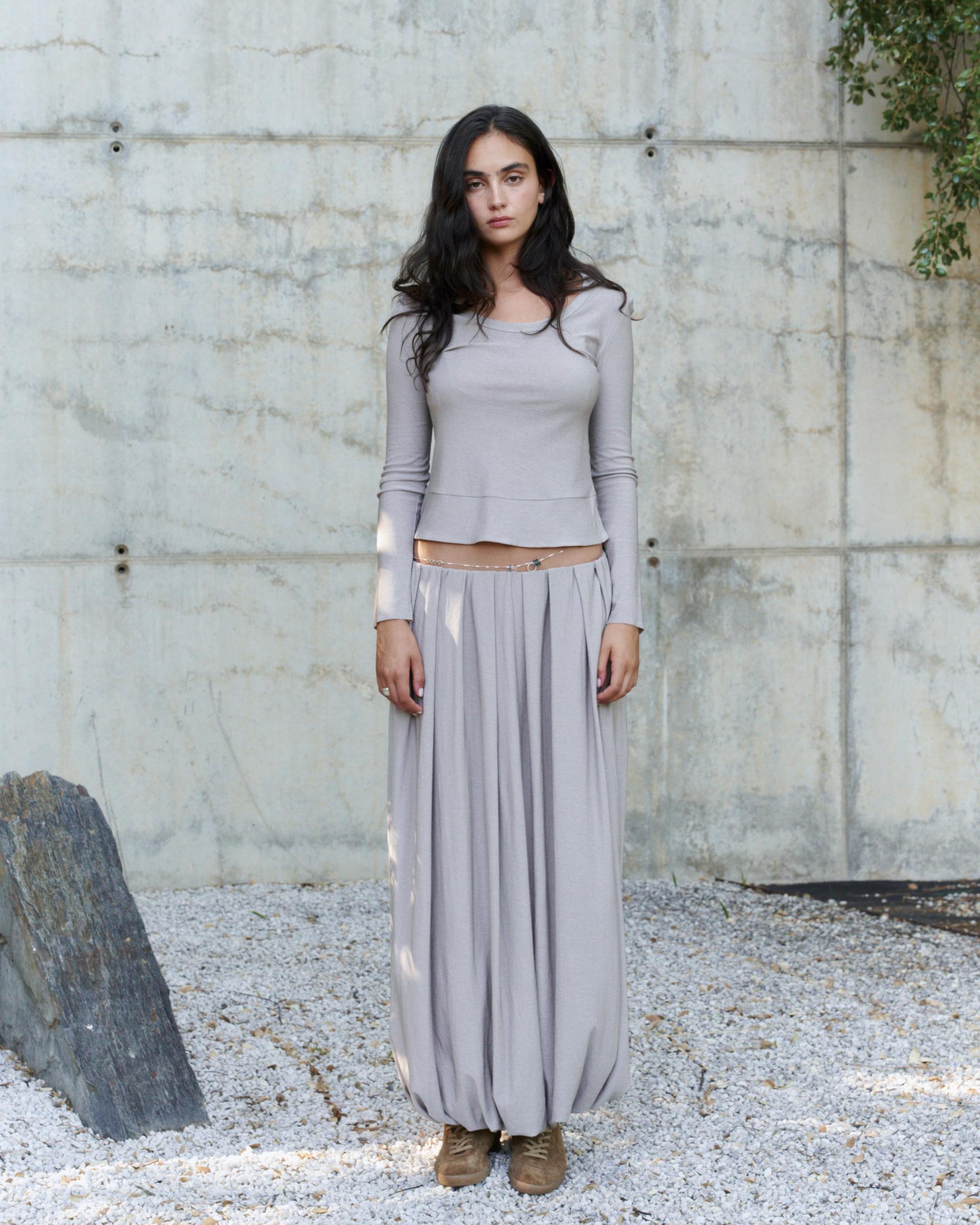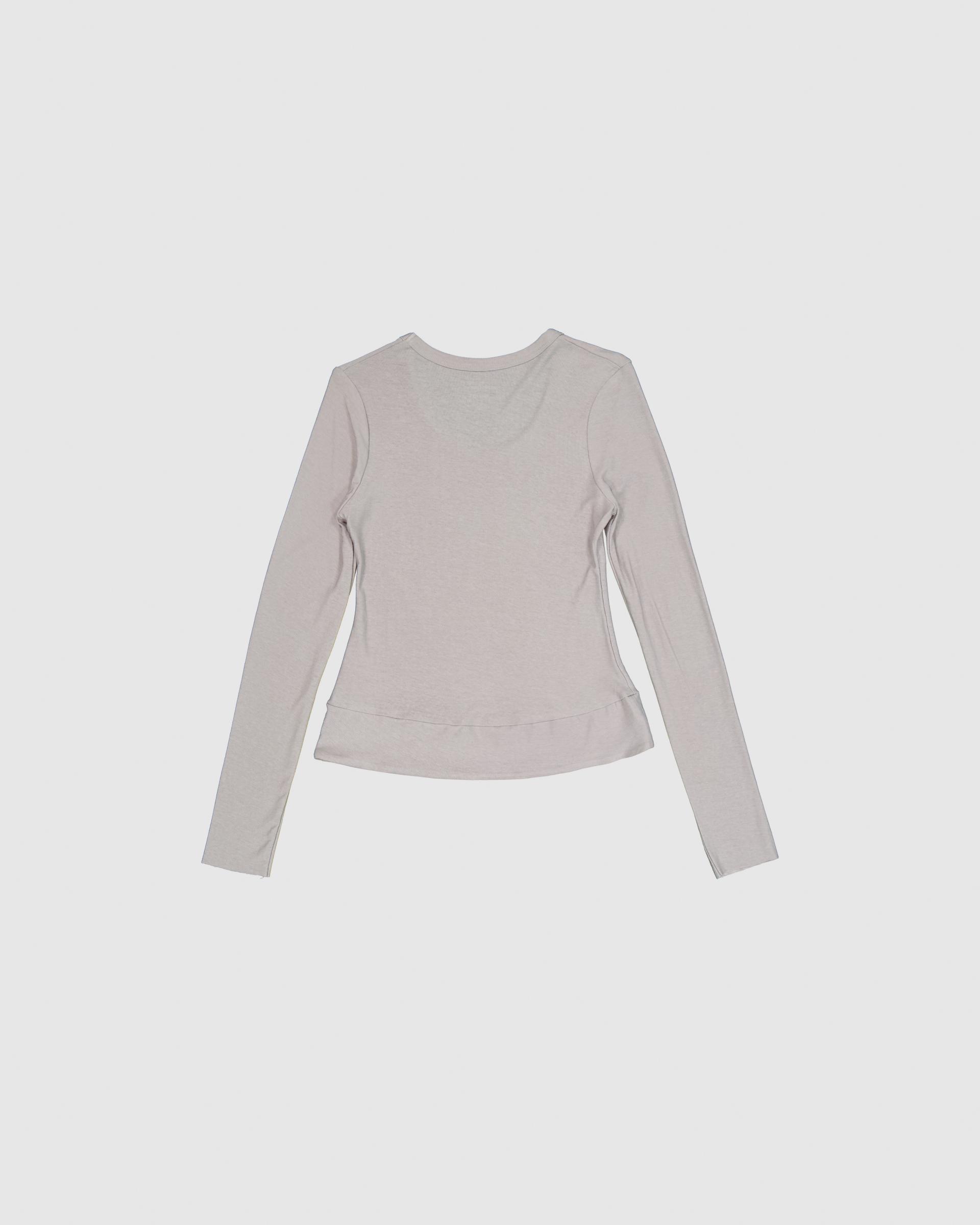 밑단 두겹의 블럭 패널이 특징인 라운드넥 긴팔 티셔츠