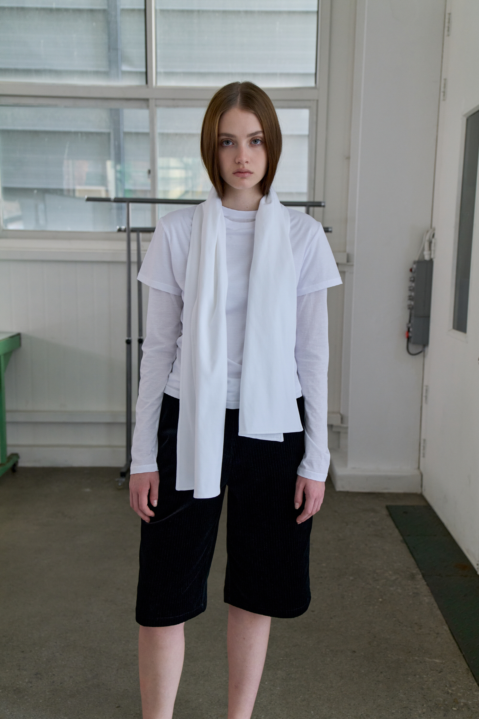 같은 소재의 크루넥 티셔츠와 레이어드하여 스타일링할 수 있습니다.