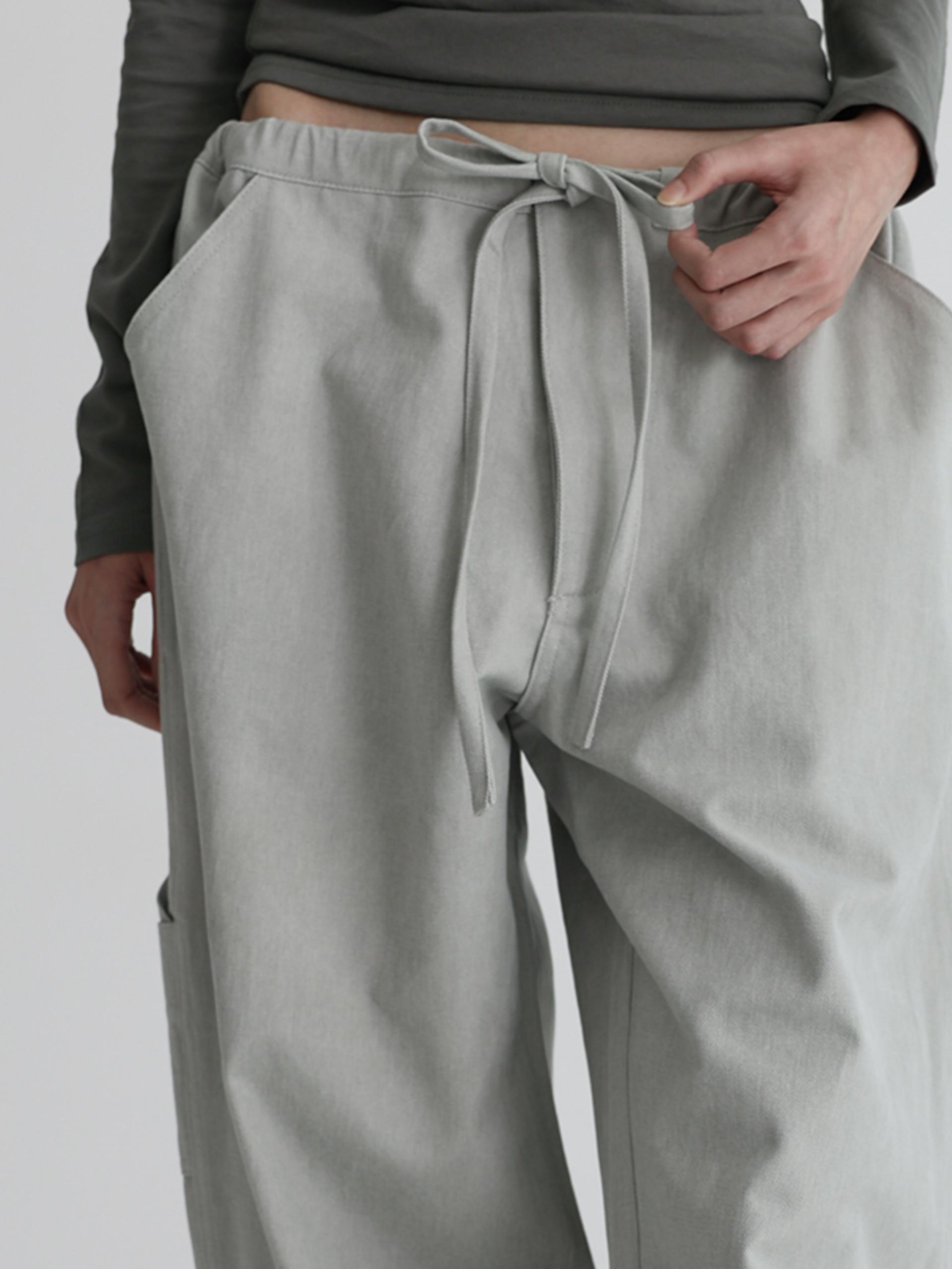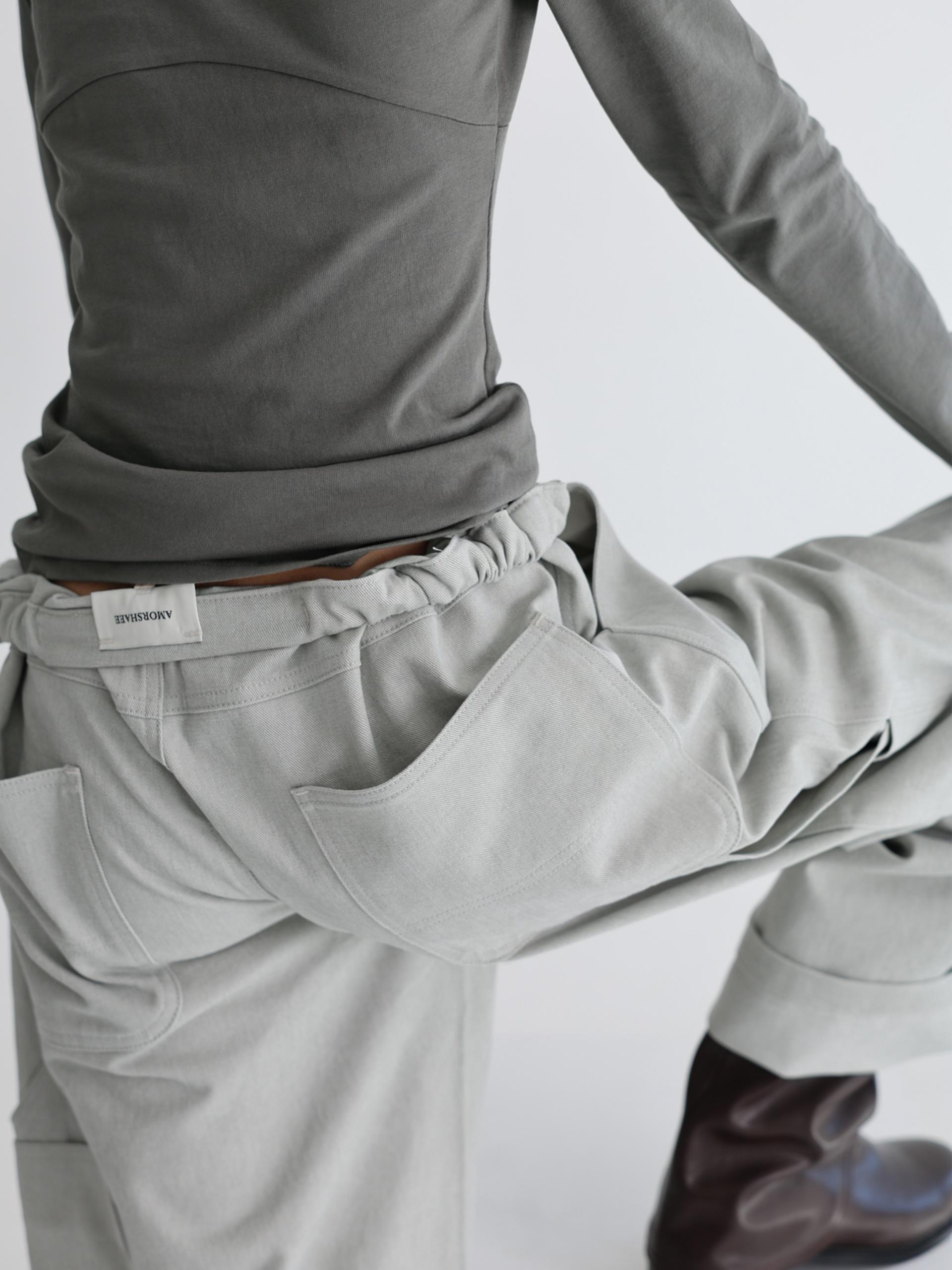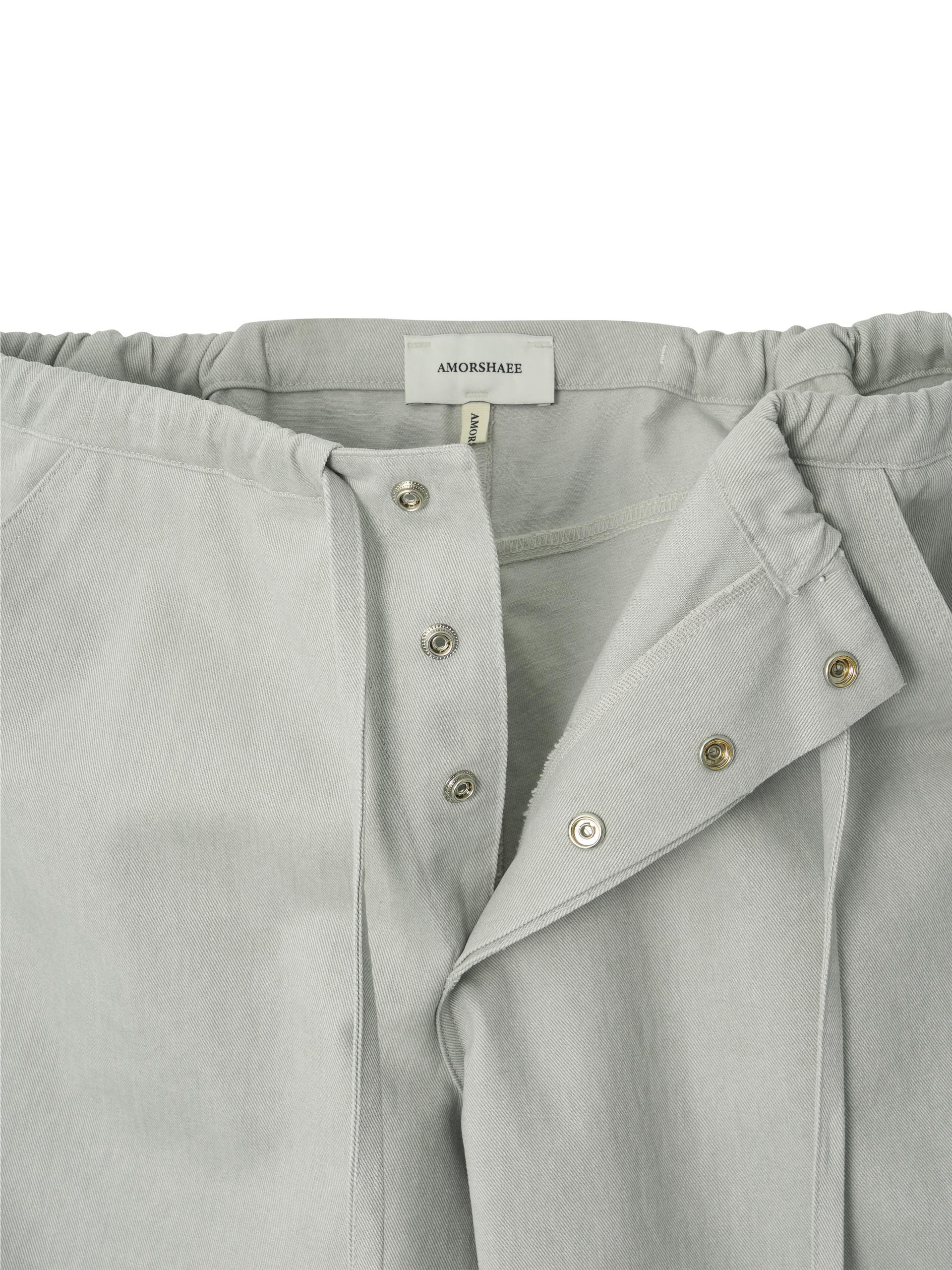 스트링으로 허리를 조여 착용자의 체형에 맞게 착용합니다. 조인 허리는 바깥으로 한 번 접어 자연스럽게 생기는 셔링 볼륨의 실루엣으로도 착용할 수 있습니다.