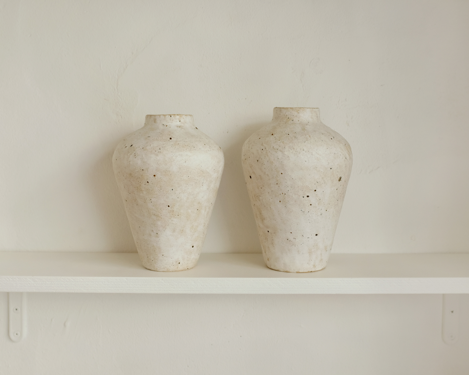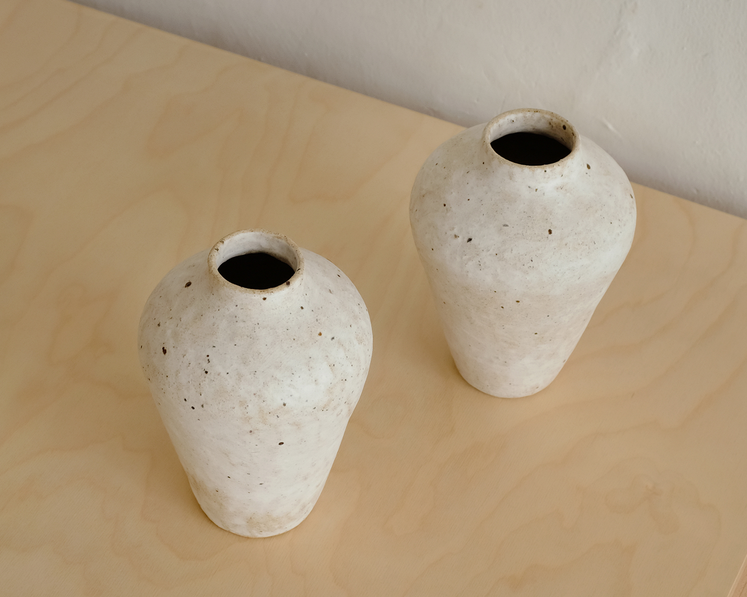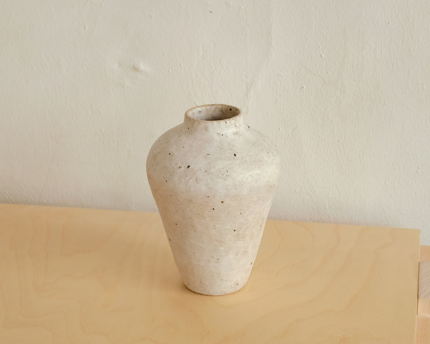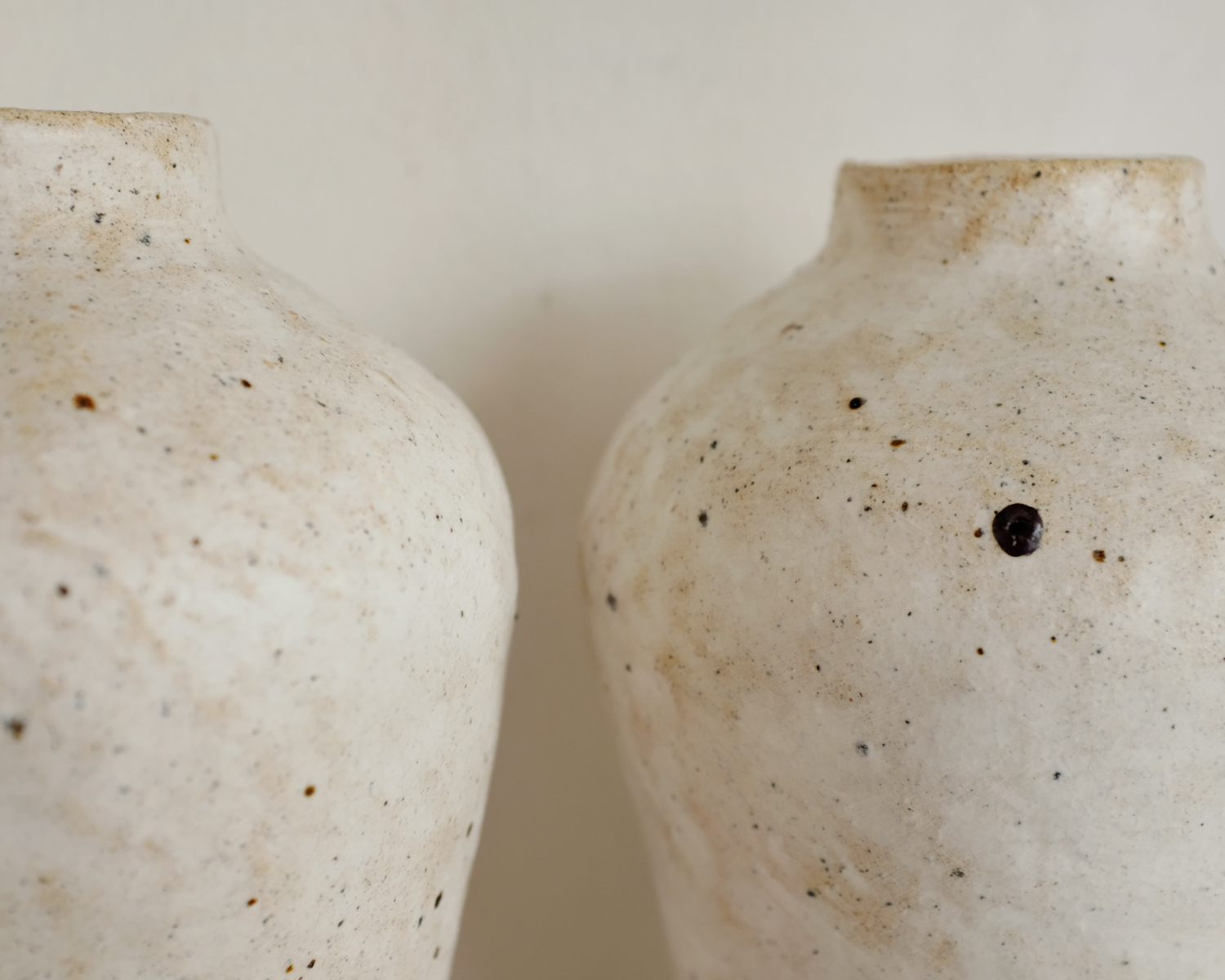 옅은 갈색의 몸통에 하얀 흙물을 발라 구우면 흙 안에 있던 검은 철 성분이 녹아 밖으로 터져 나오며 멋진 우연의 효과가 만들어집니다. 은은하게 빛나는 하얀 표면은 온갖 나무 사이에서 빛나는 고고하고 흰 자작나무가 연상됩니다.