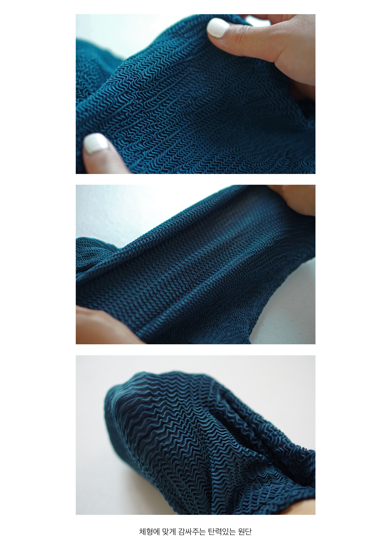 원단의 자글자글한 주름이 체형에 맞게 늘어났다가 줄어들며 입는 사람마다의 체형에 꼭 맞는 착용감을 선사하며 하나의 사이즈로 여러 체형을 커버할 정도로 신축성이 뛰어납니다.