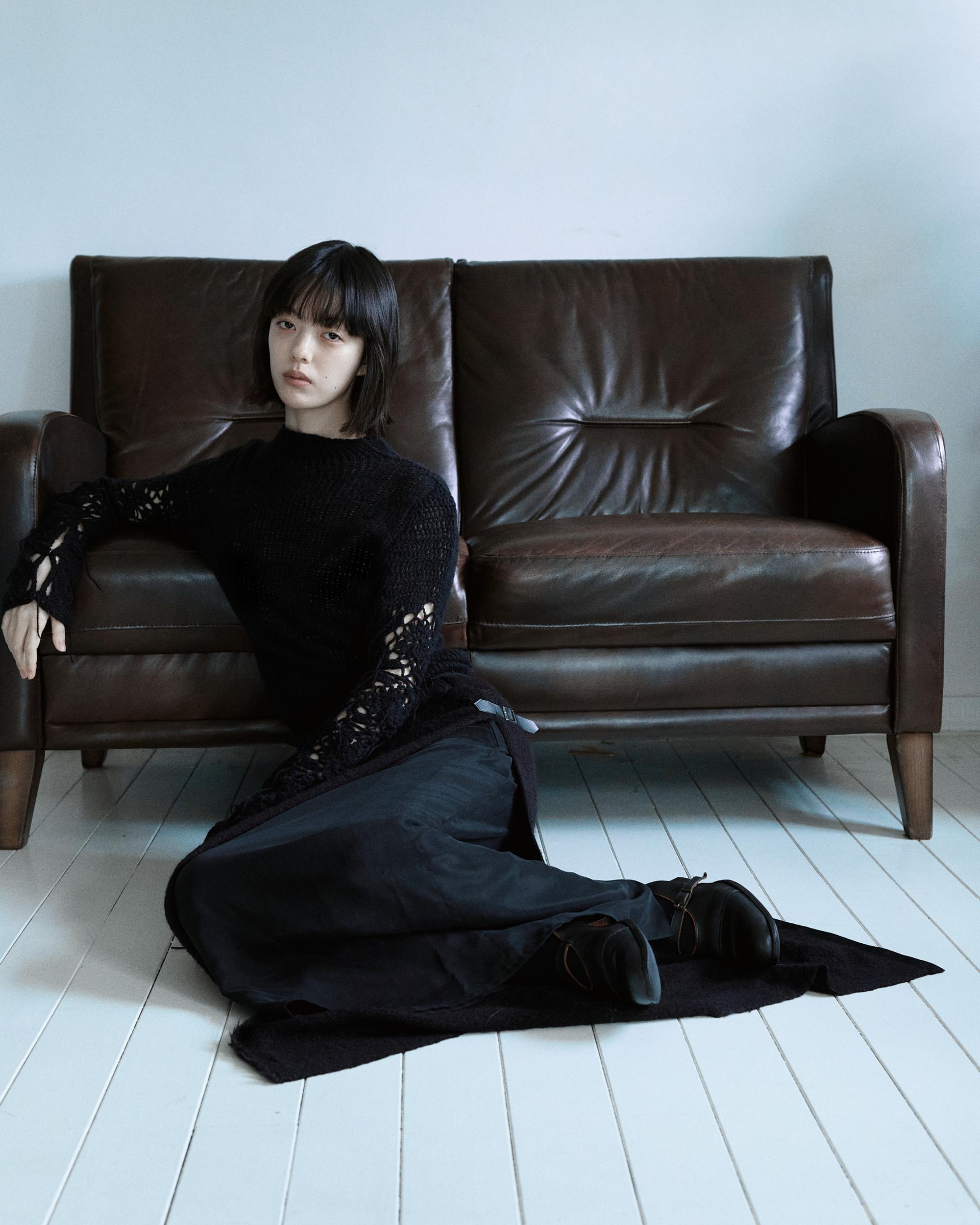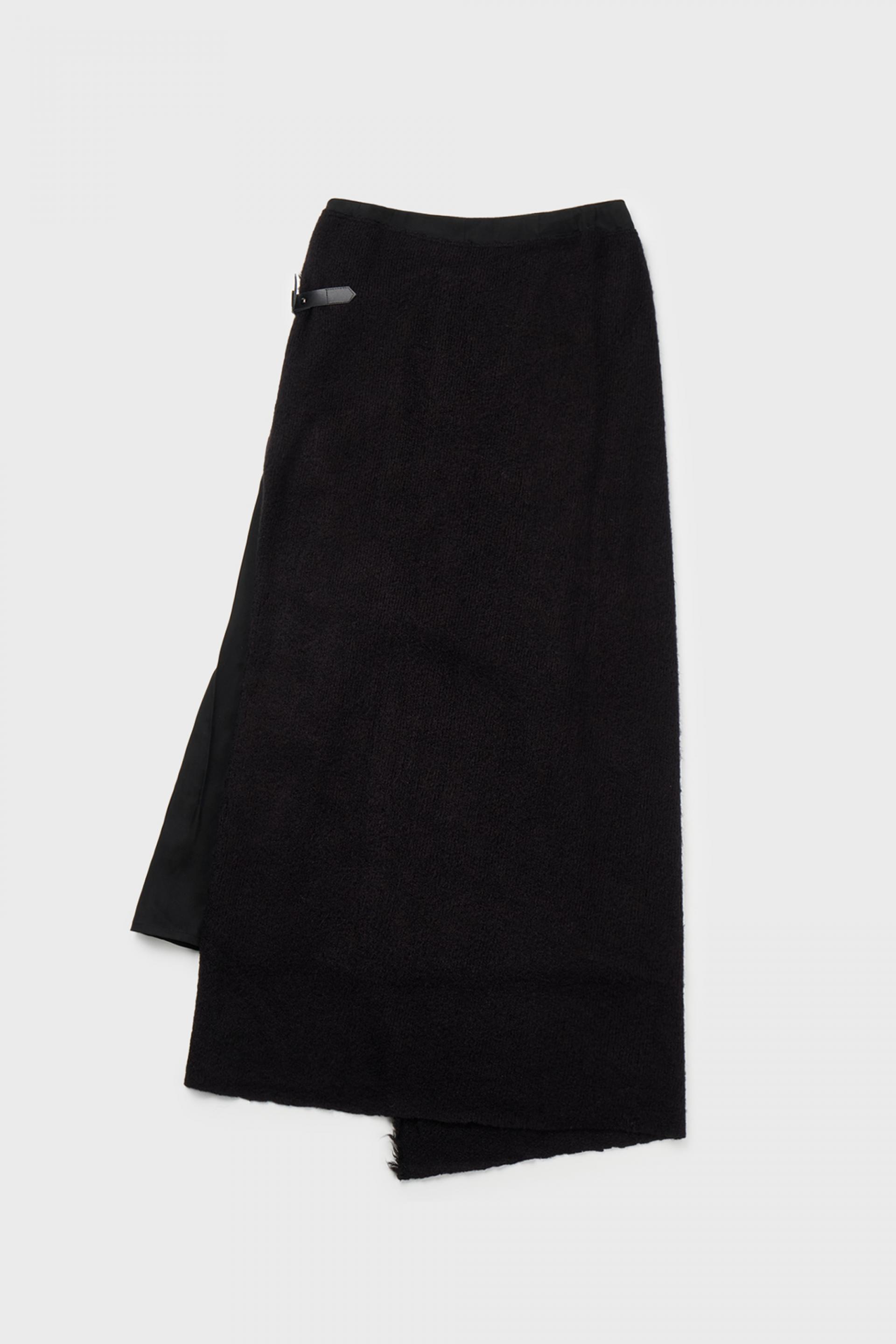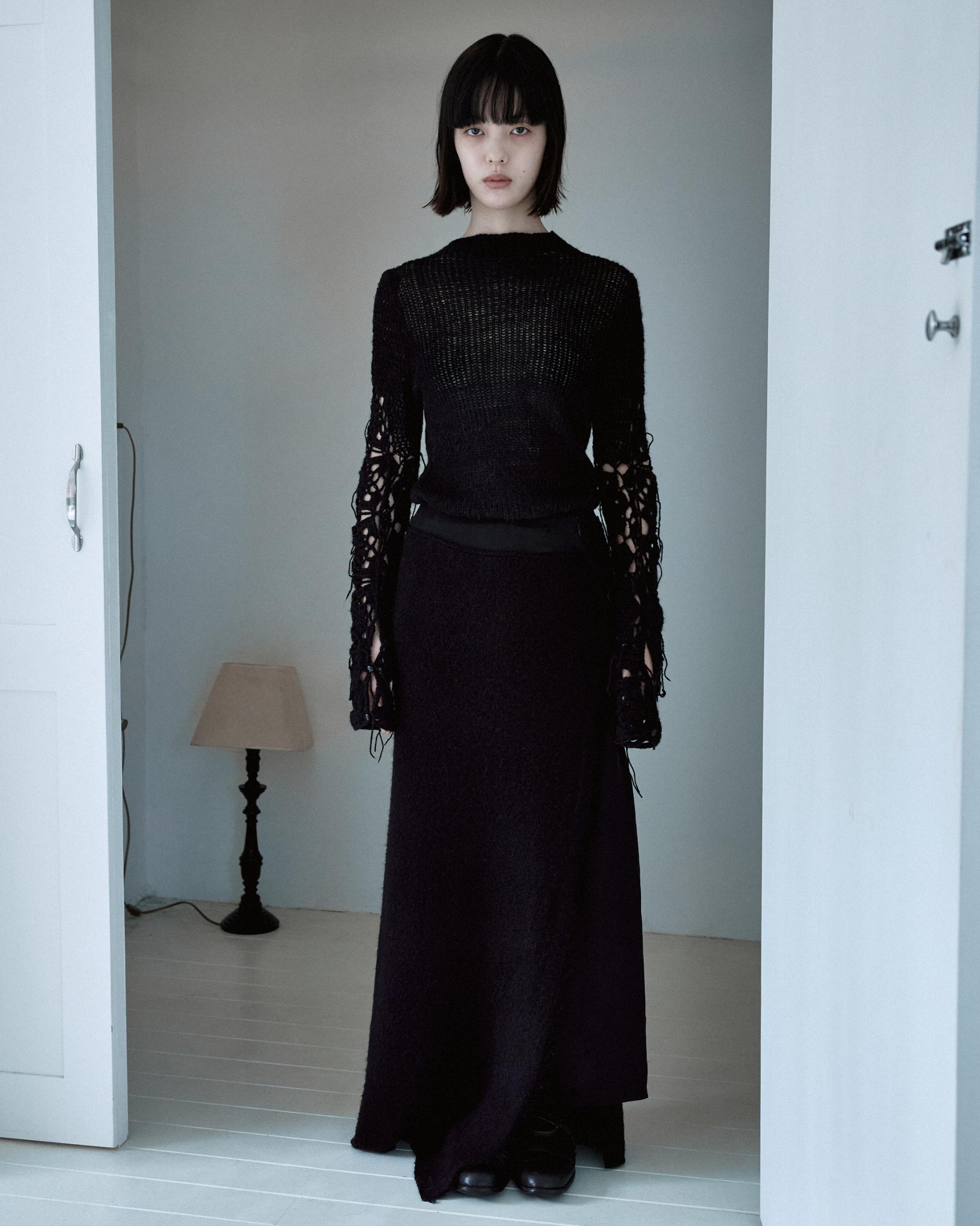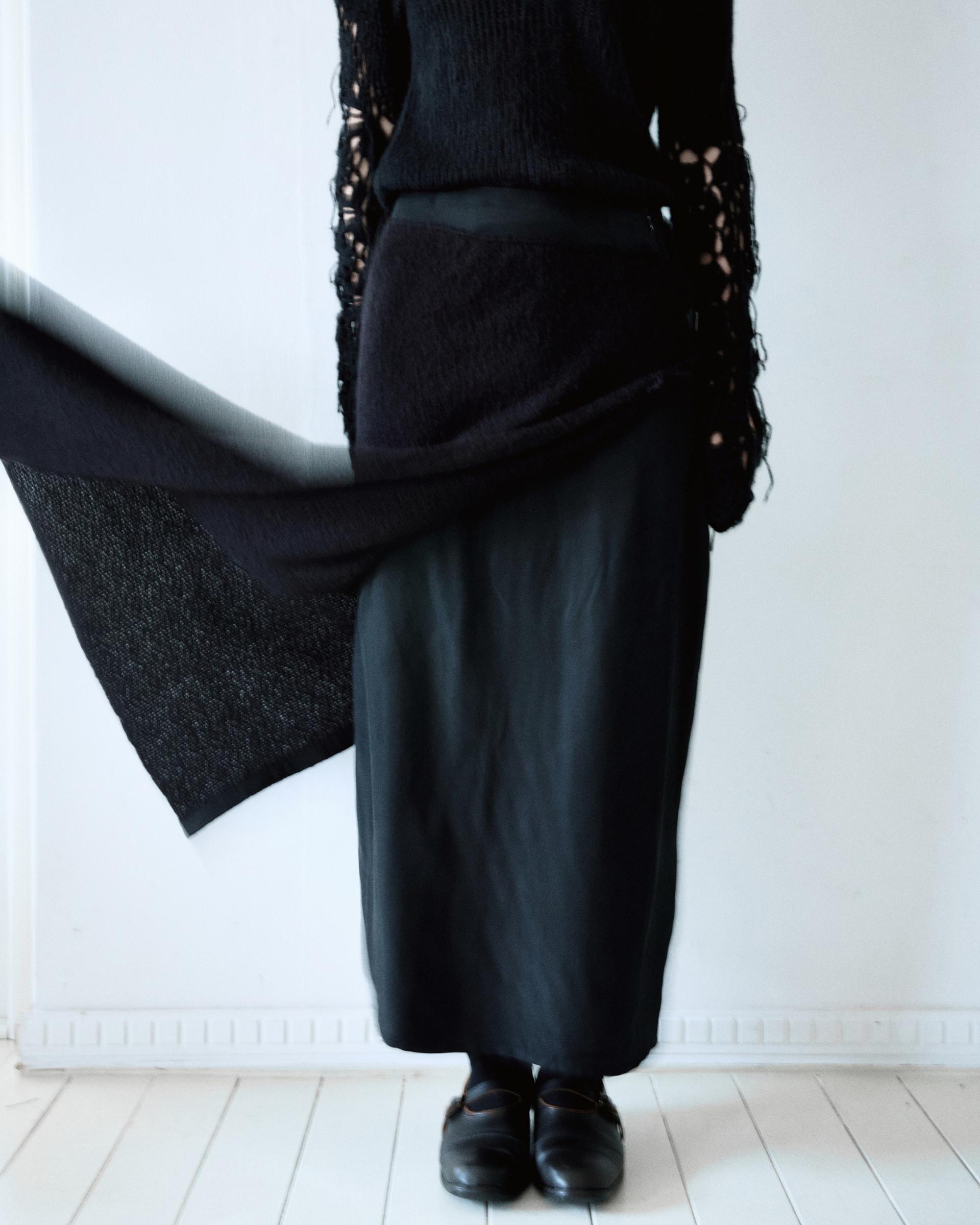 겉감의 니트 스커트의 앞면부가 자연스럽게 벌어지며 안쪽의 큐프라 스커트가 노출되는 것이 포인트입니다.