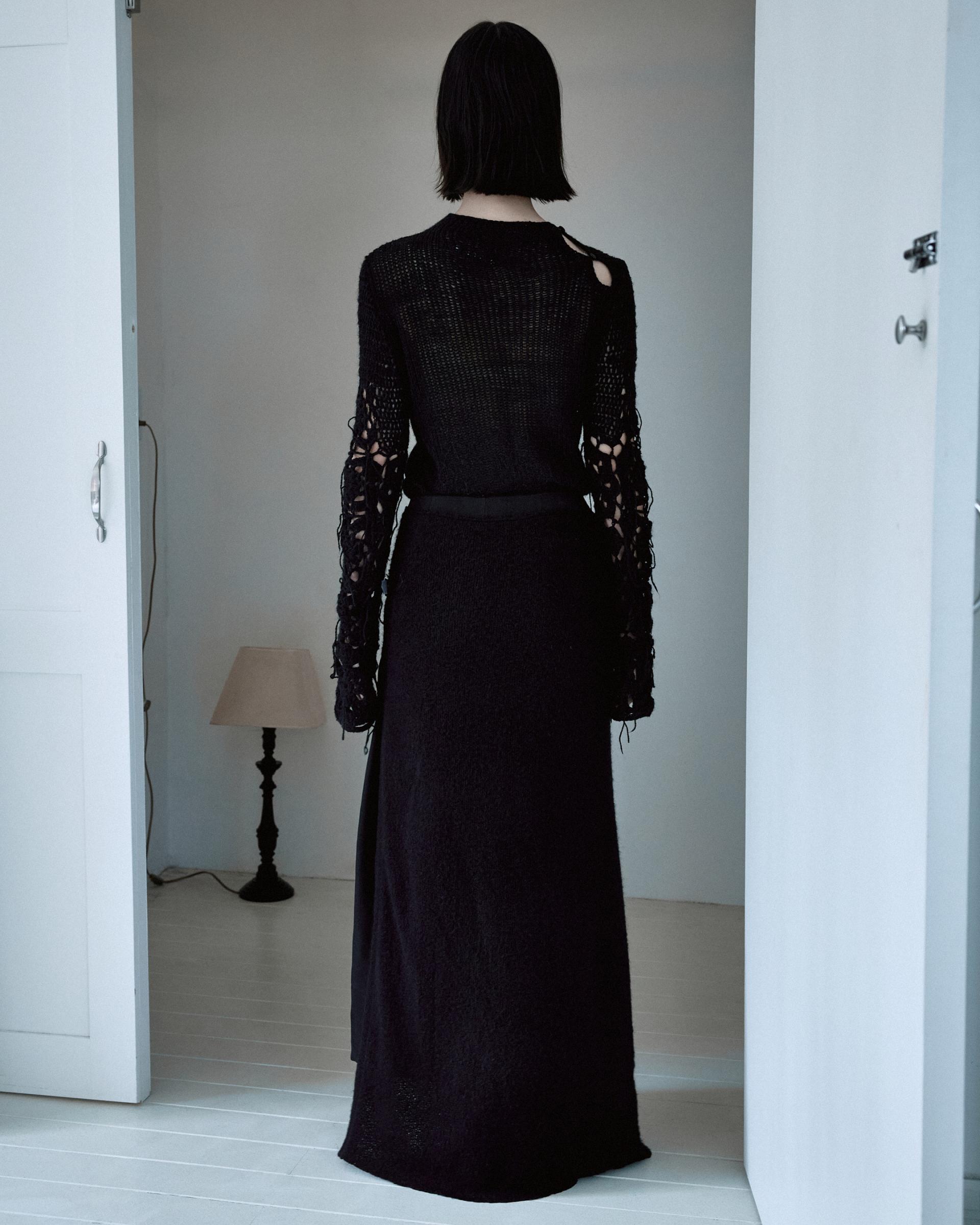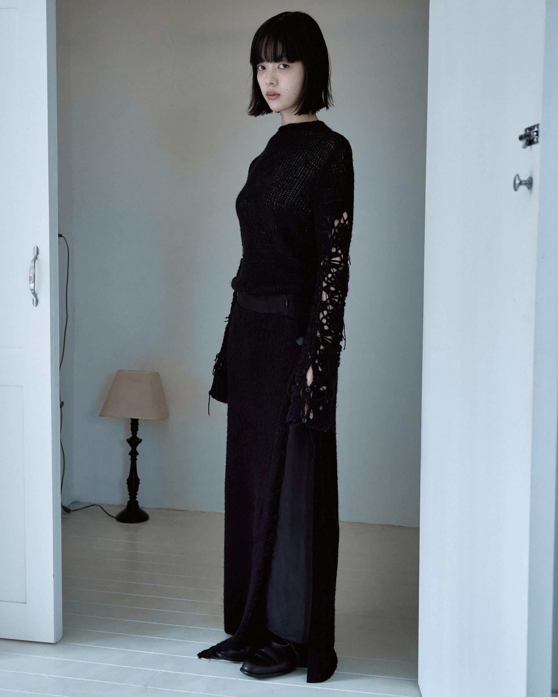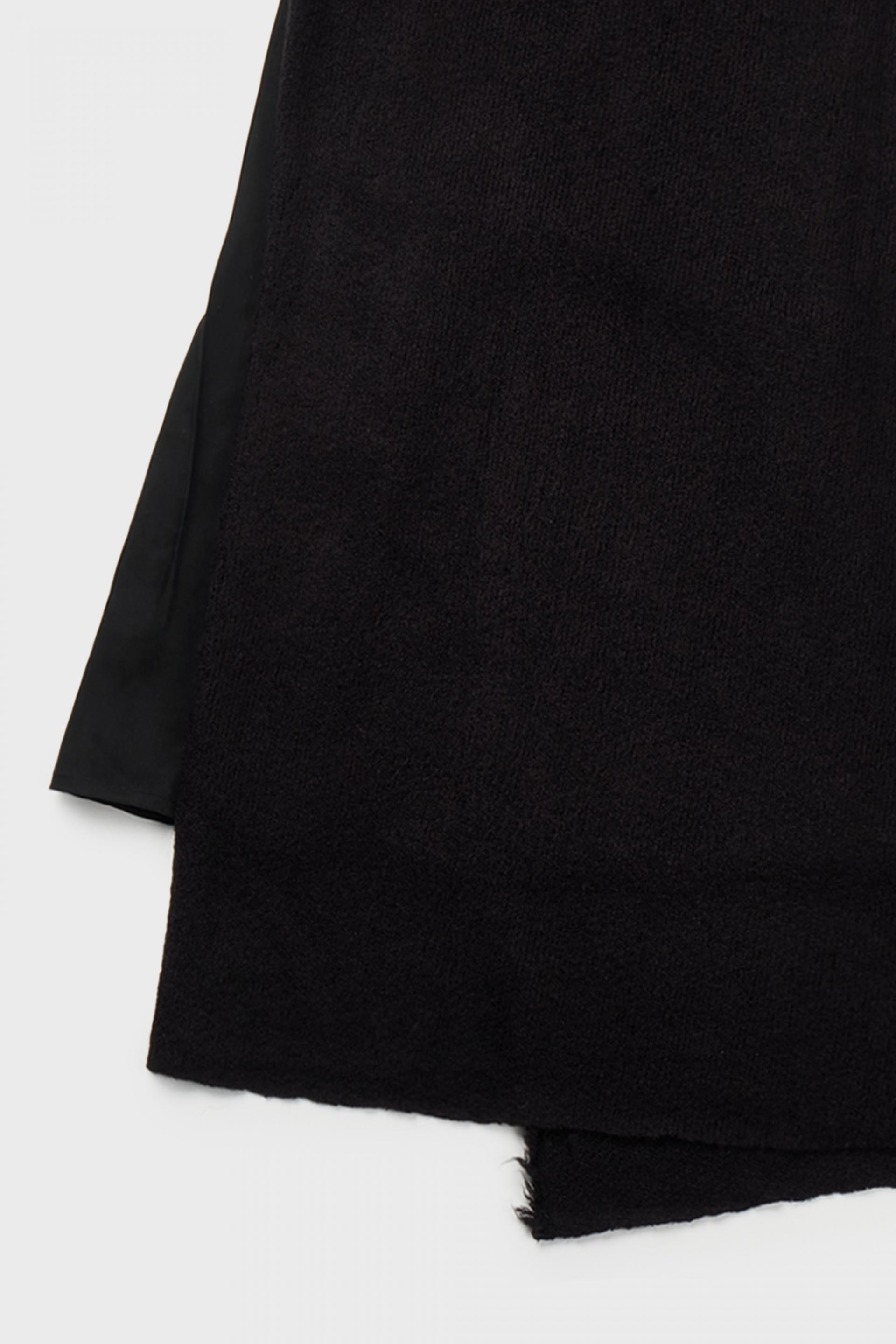겉감의 니트 스커트의 앞면부가 자연스럽게 벌어지며 안쪽의 큐프라 스커트가 노출되는 것이 포인트입니다.