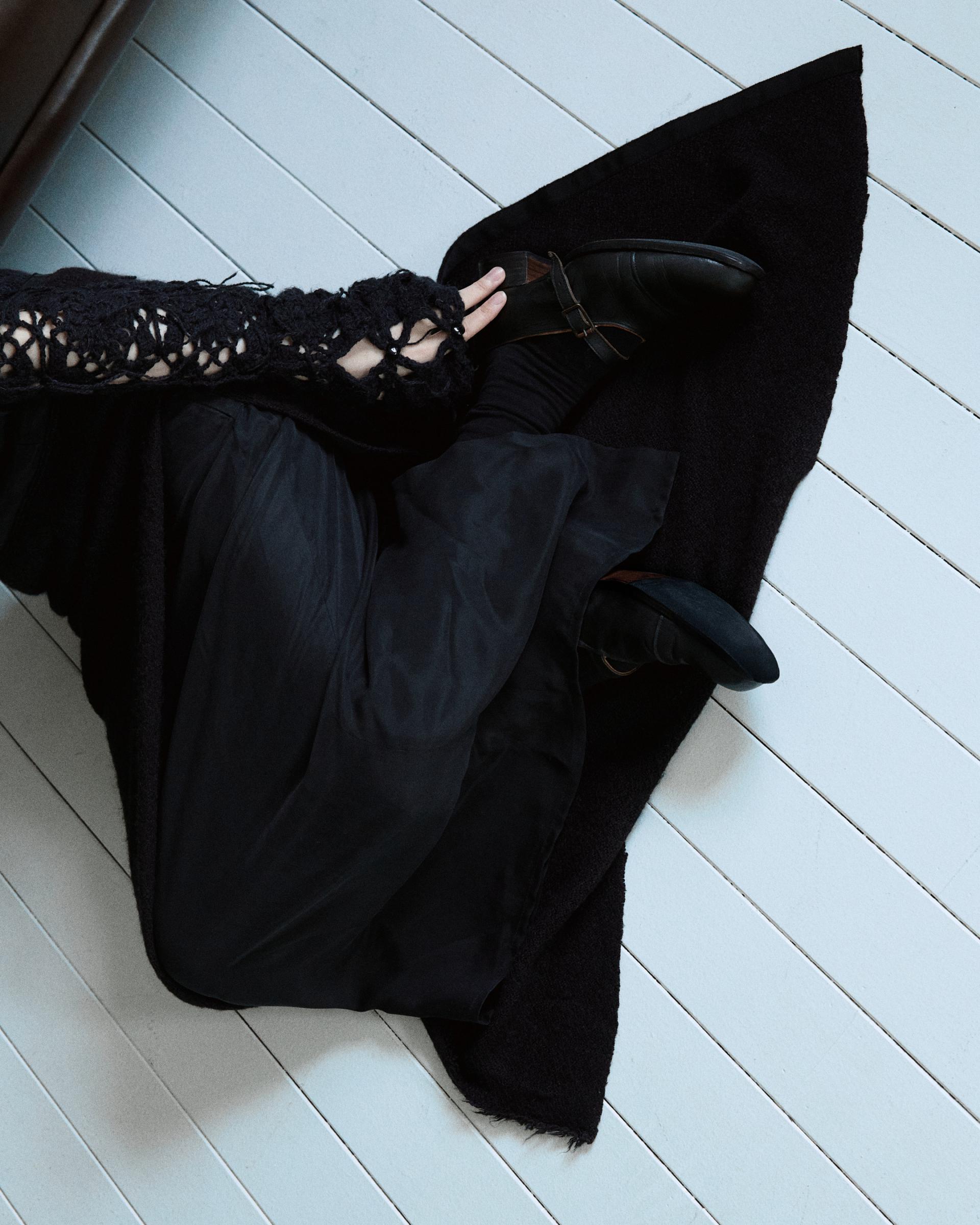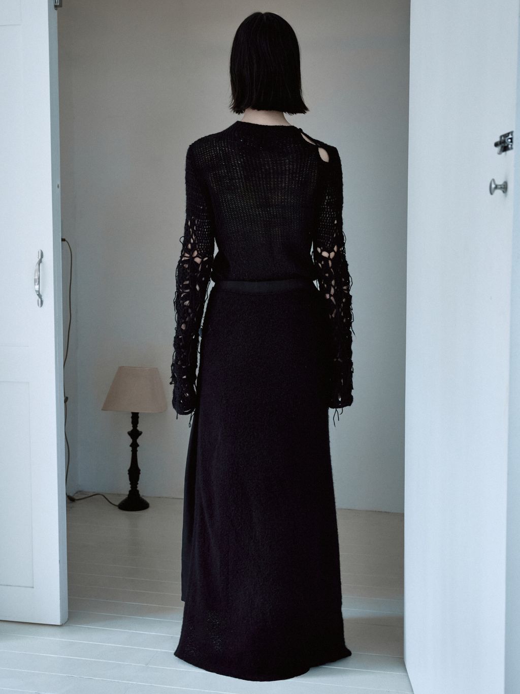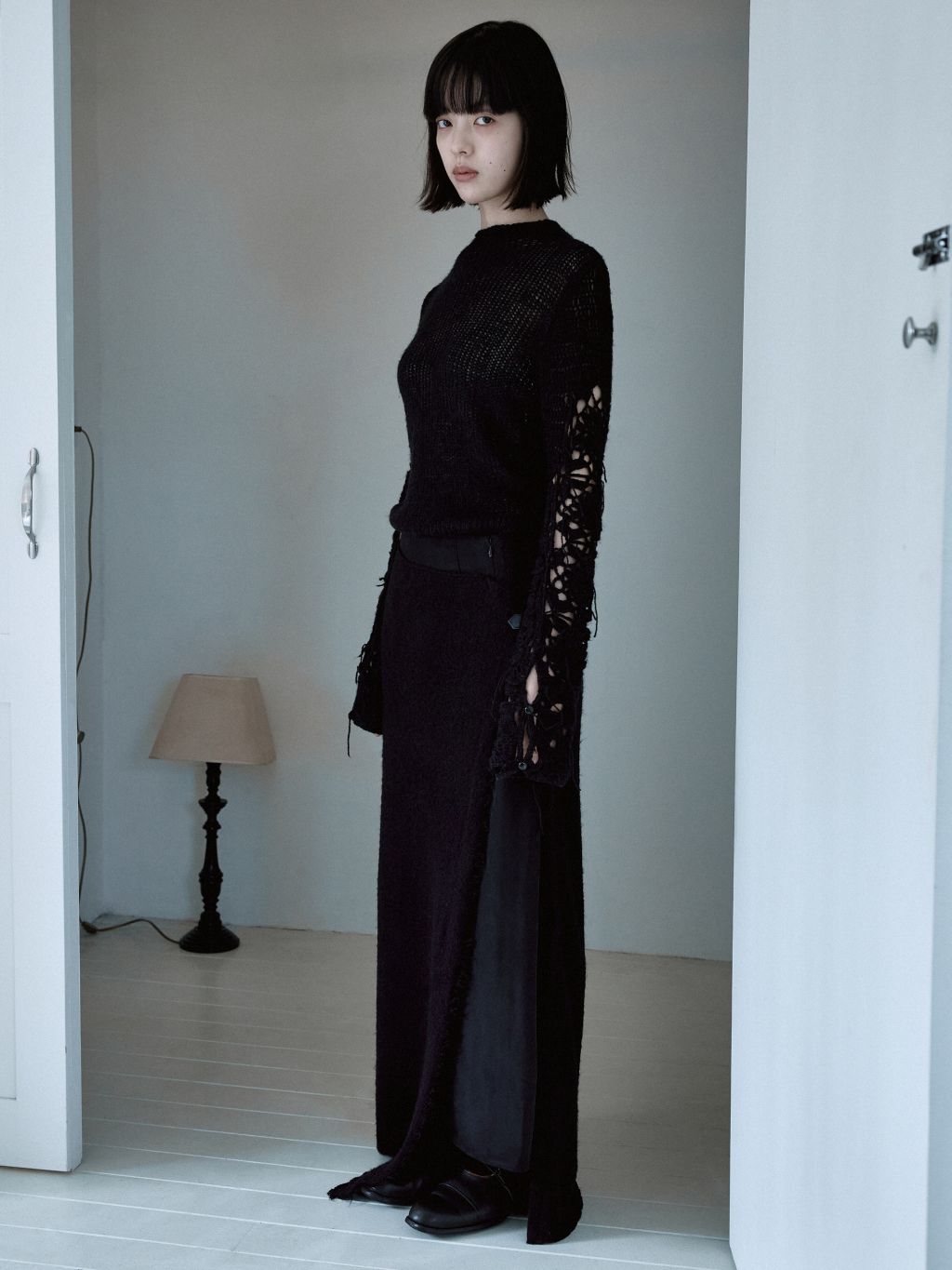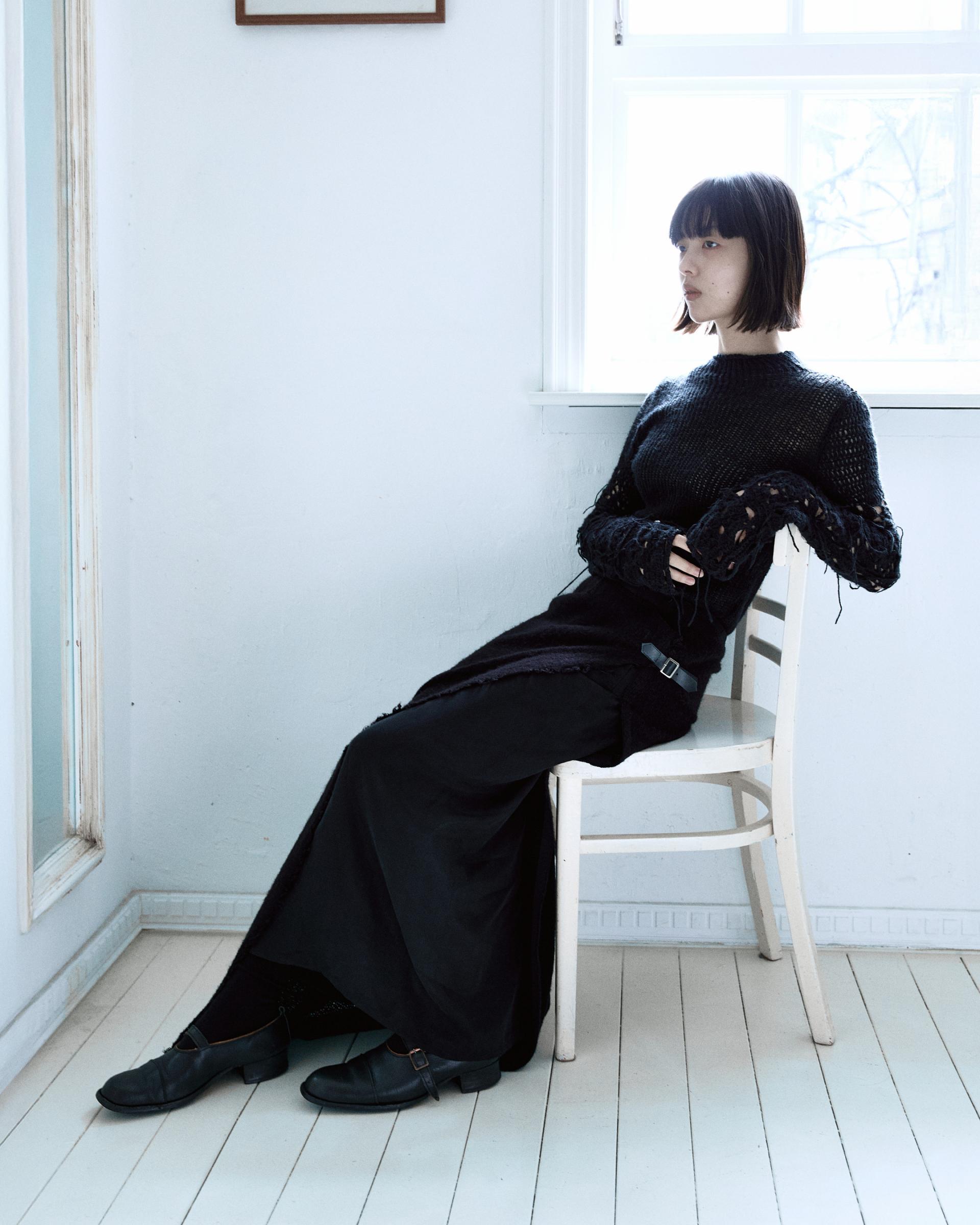 겉감의 니트 스커트의 앞면부가 자연스럽게 벌어지며 안쪽의 큐프라 스커트가 노출되는 것이 포인트입니다.
