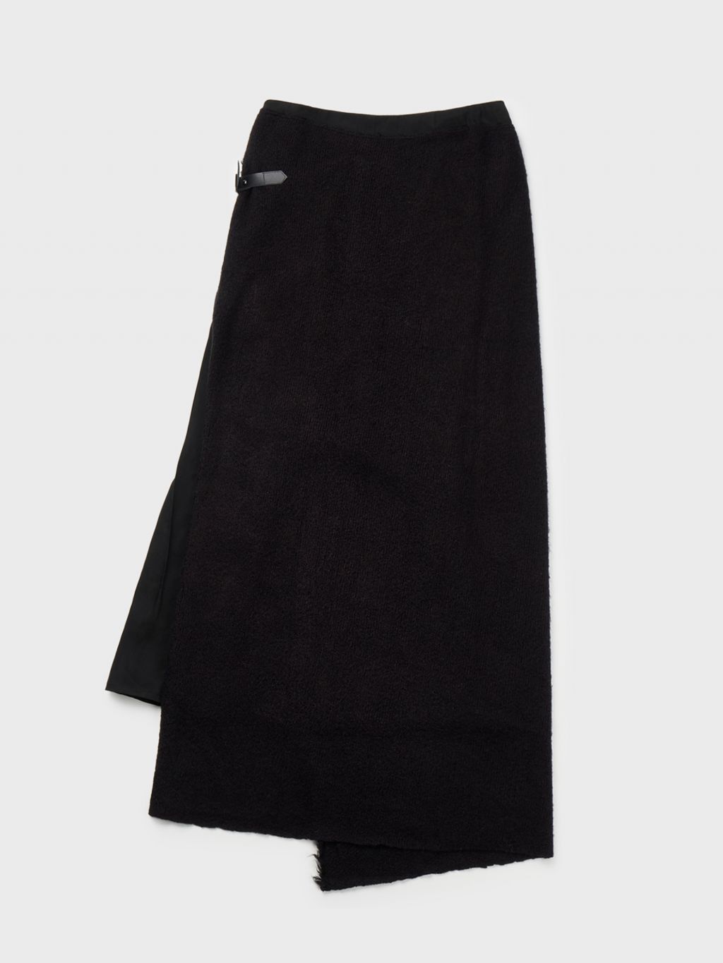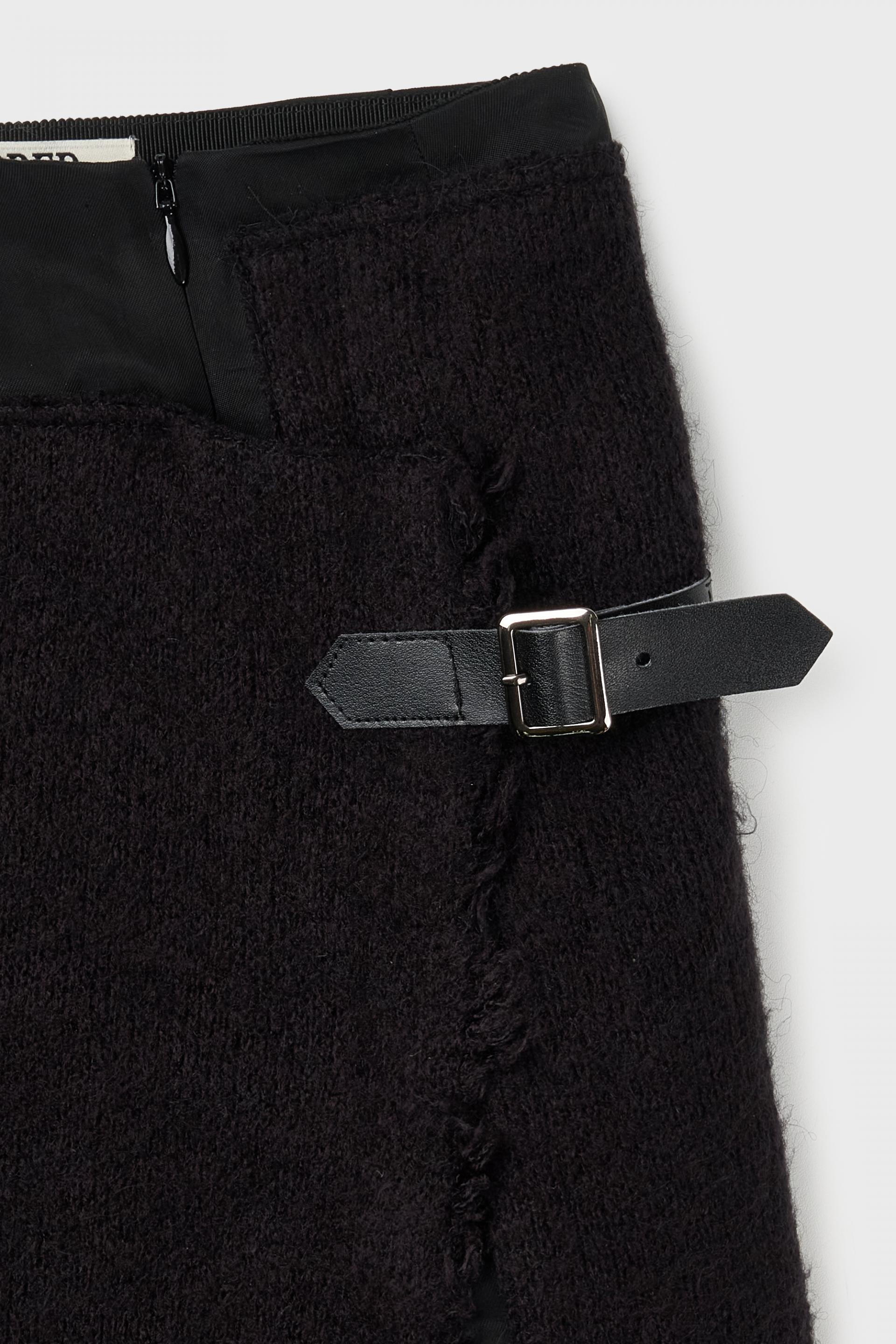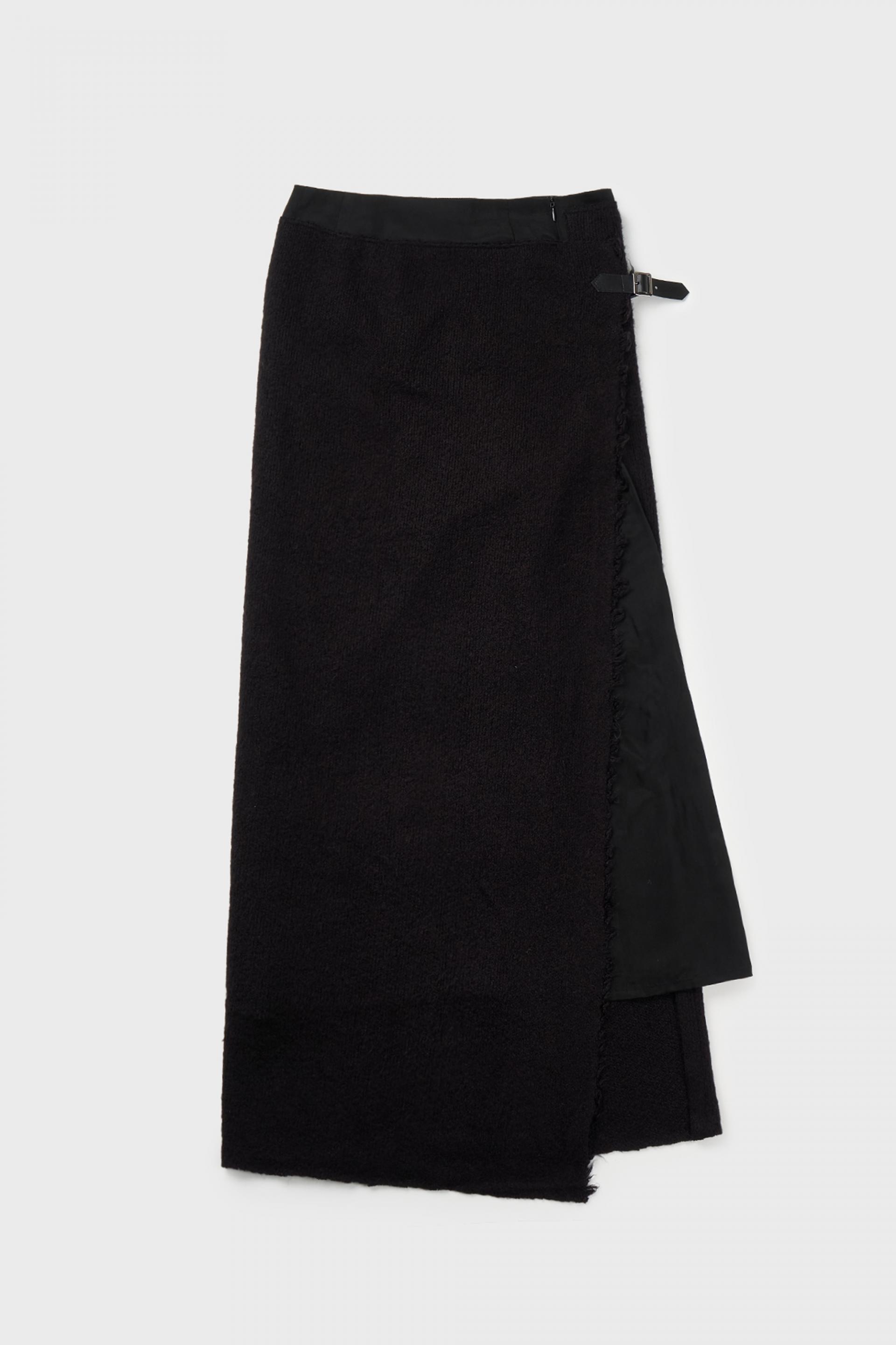 안쪽 스커트는 컨실 지퍼로 마감되며, 겉면 스커트는 가죽 벨트 장식으로 마감됩니다.