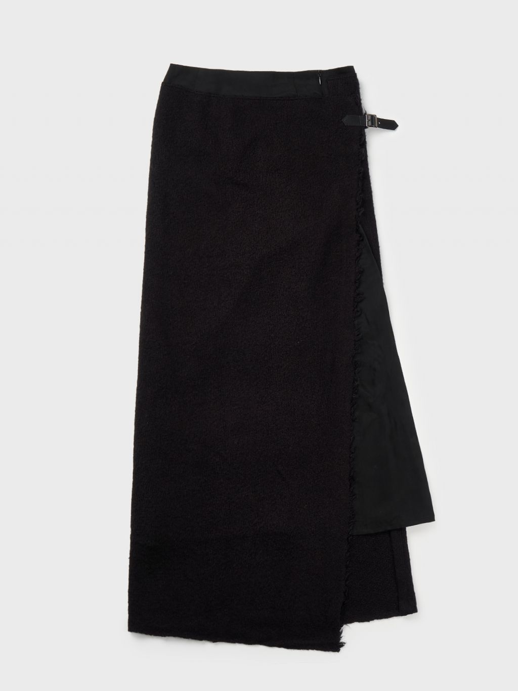 큐프라 소재의 맥시한 H라인 스커트 위로, 랩 형식으로 부착된 레이어드 스커트입니다.
