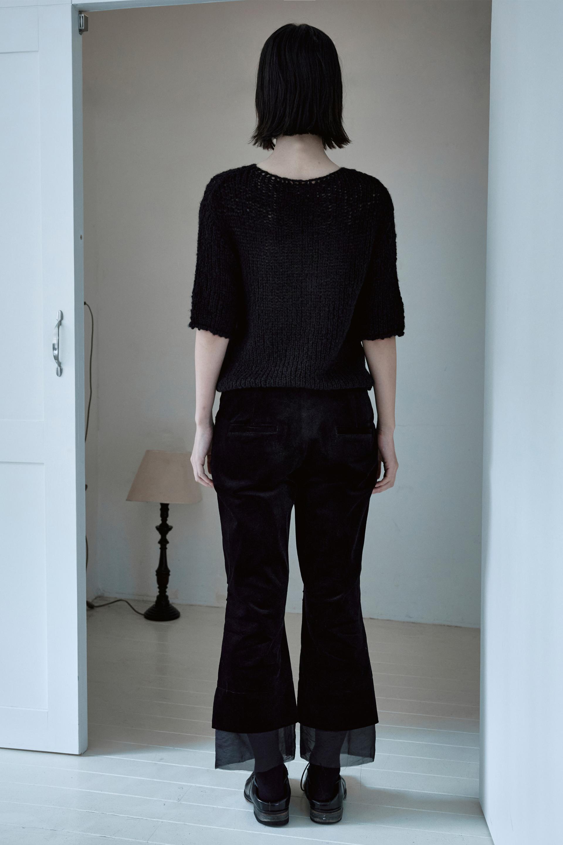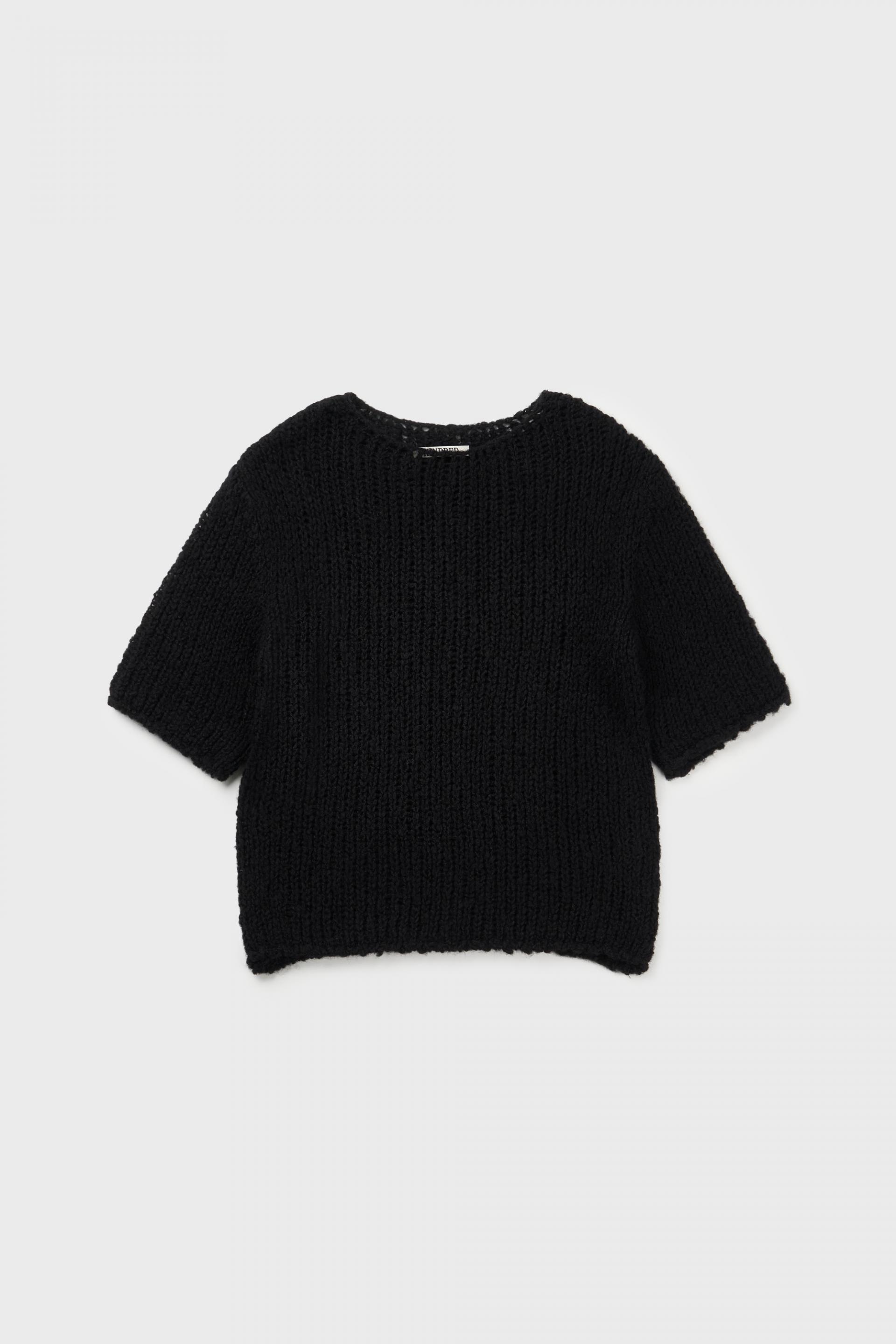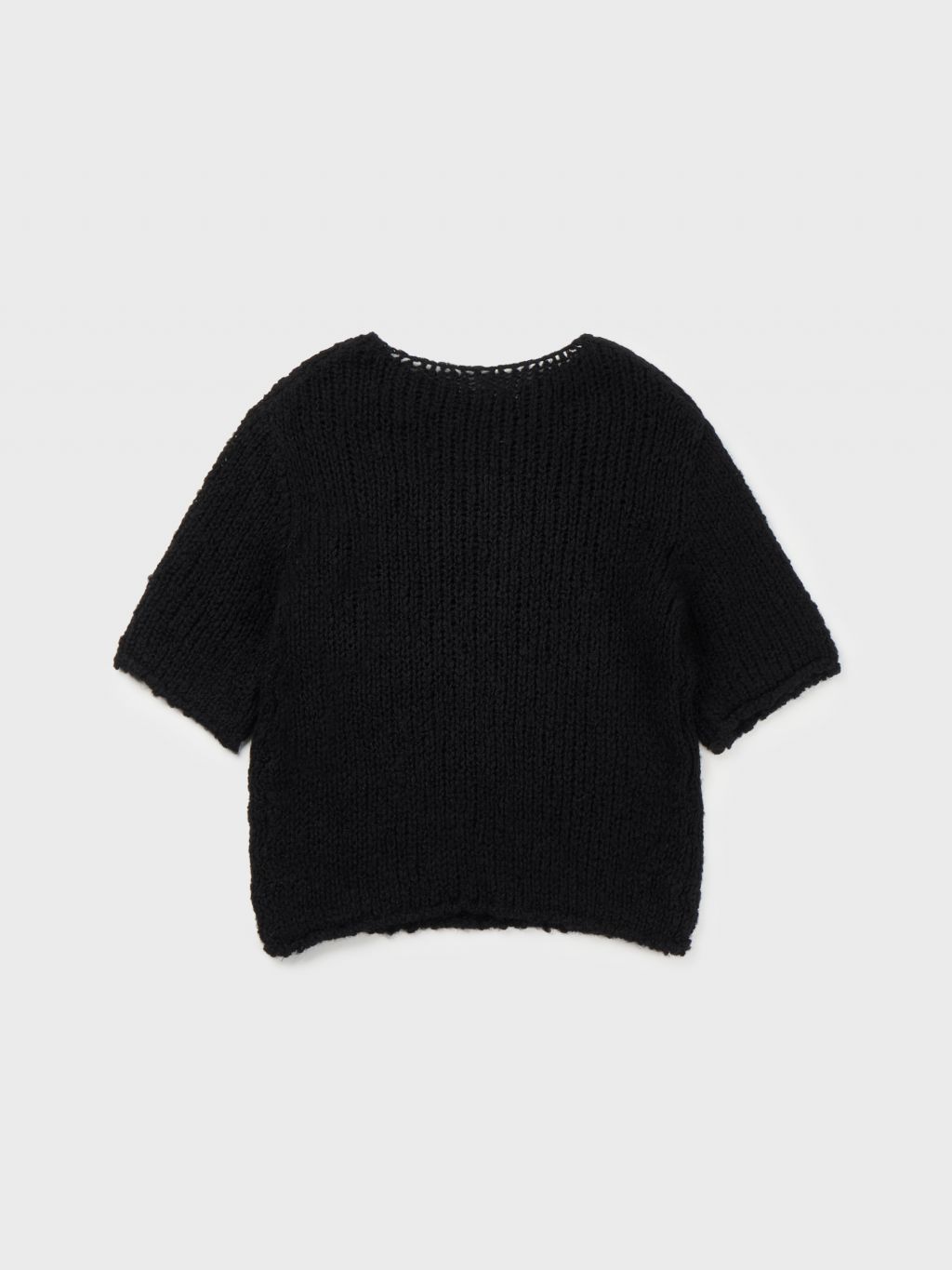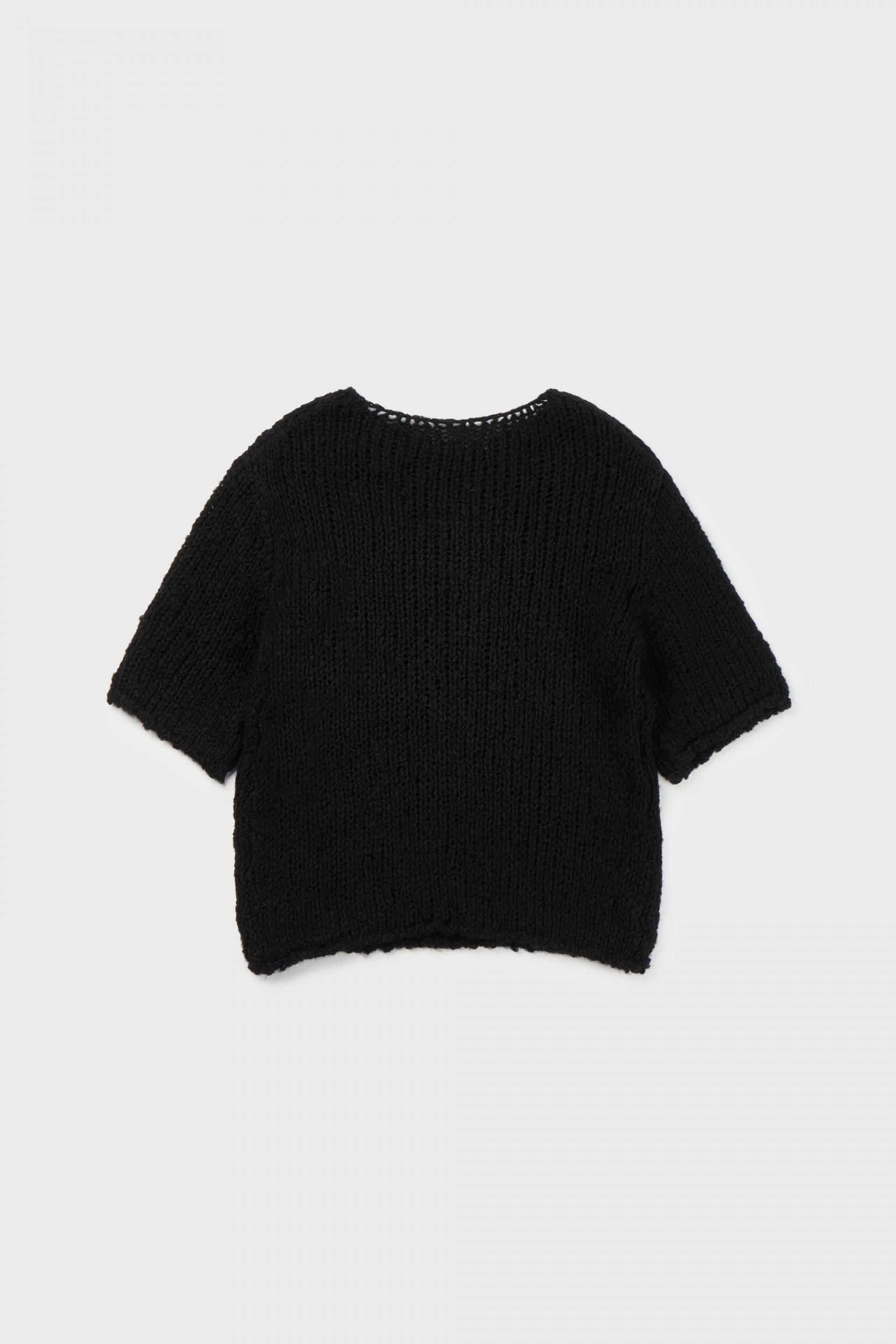 헤어리한 소재감의 울 원사를 사용하여 굵은 짜임으로 짜여진 반팔 소매의 니트 스웨터입니다.