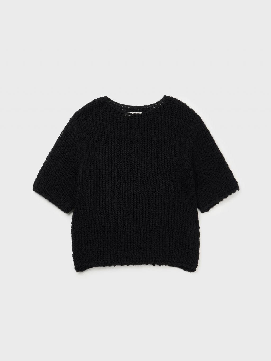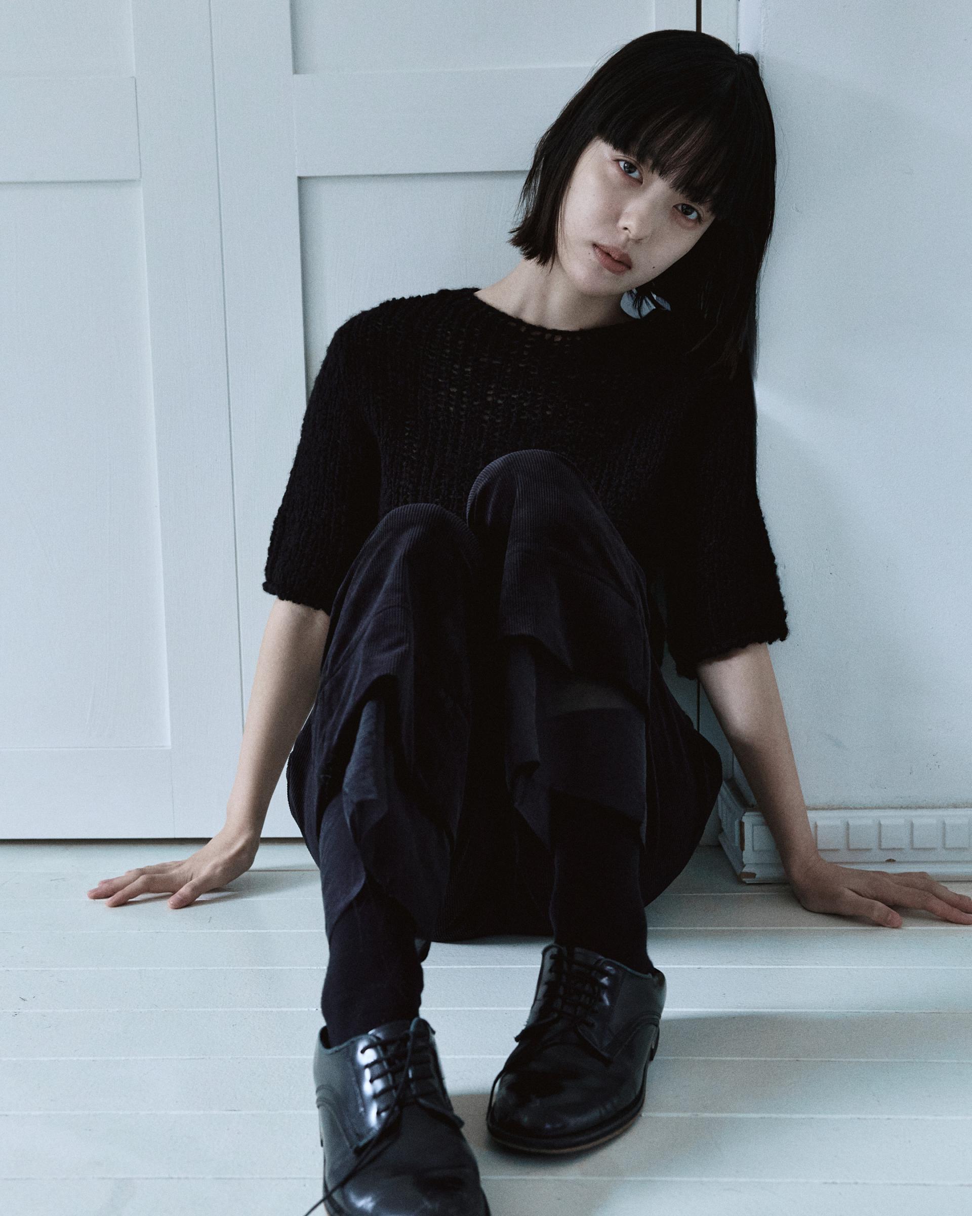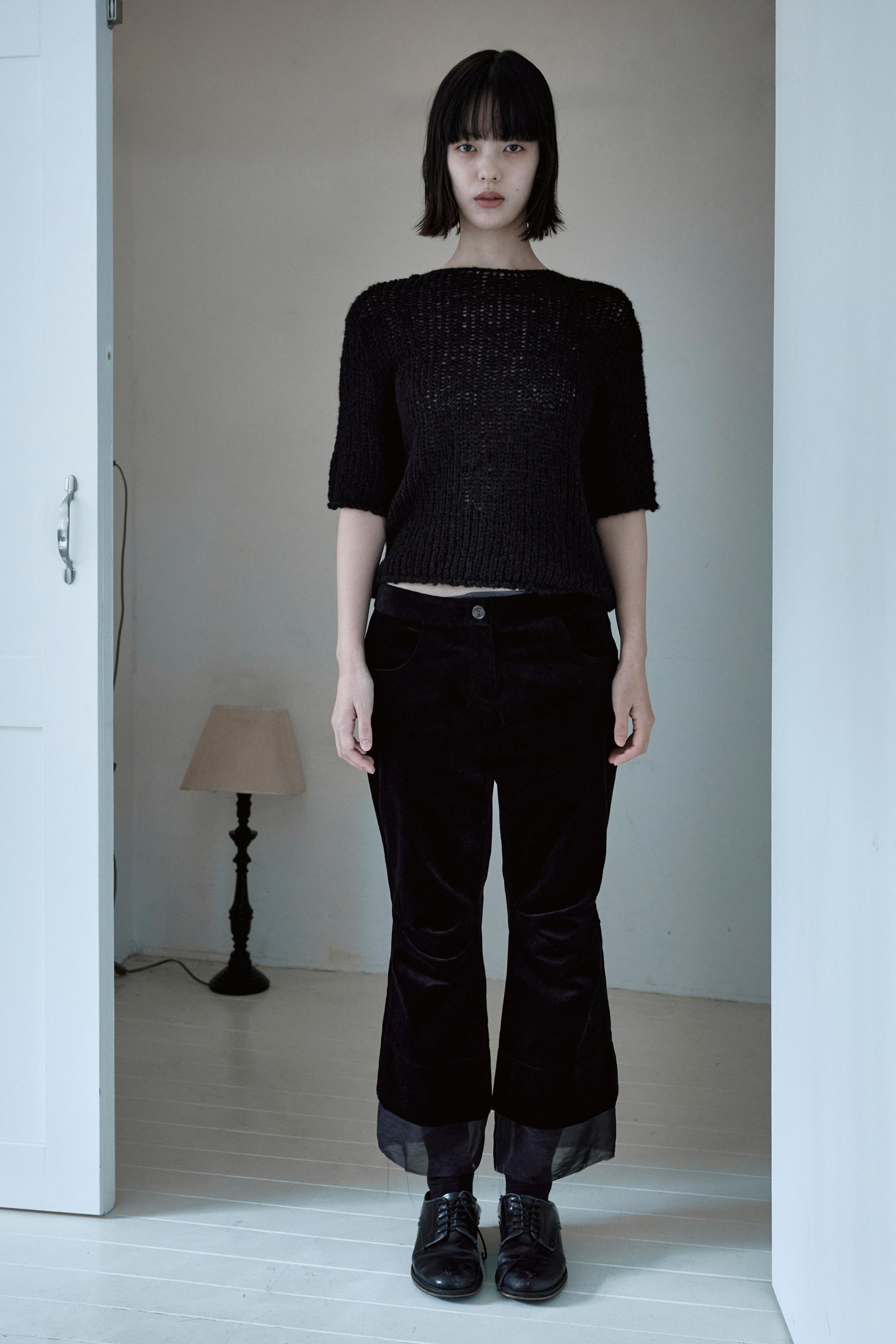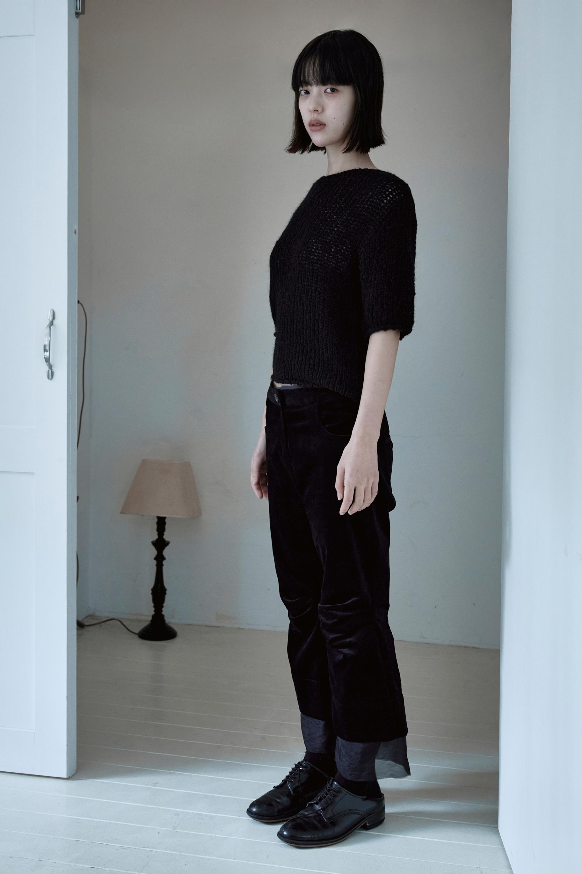 헤어리한 소재감의 울 원사를 사용하여 굵은 짜임으로 짜여진 반팔 소매의 니트 스웨터입니다.