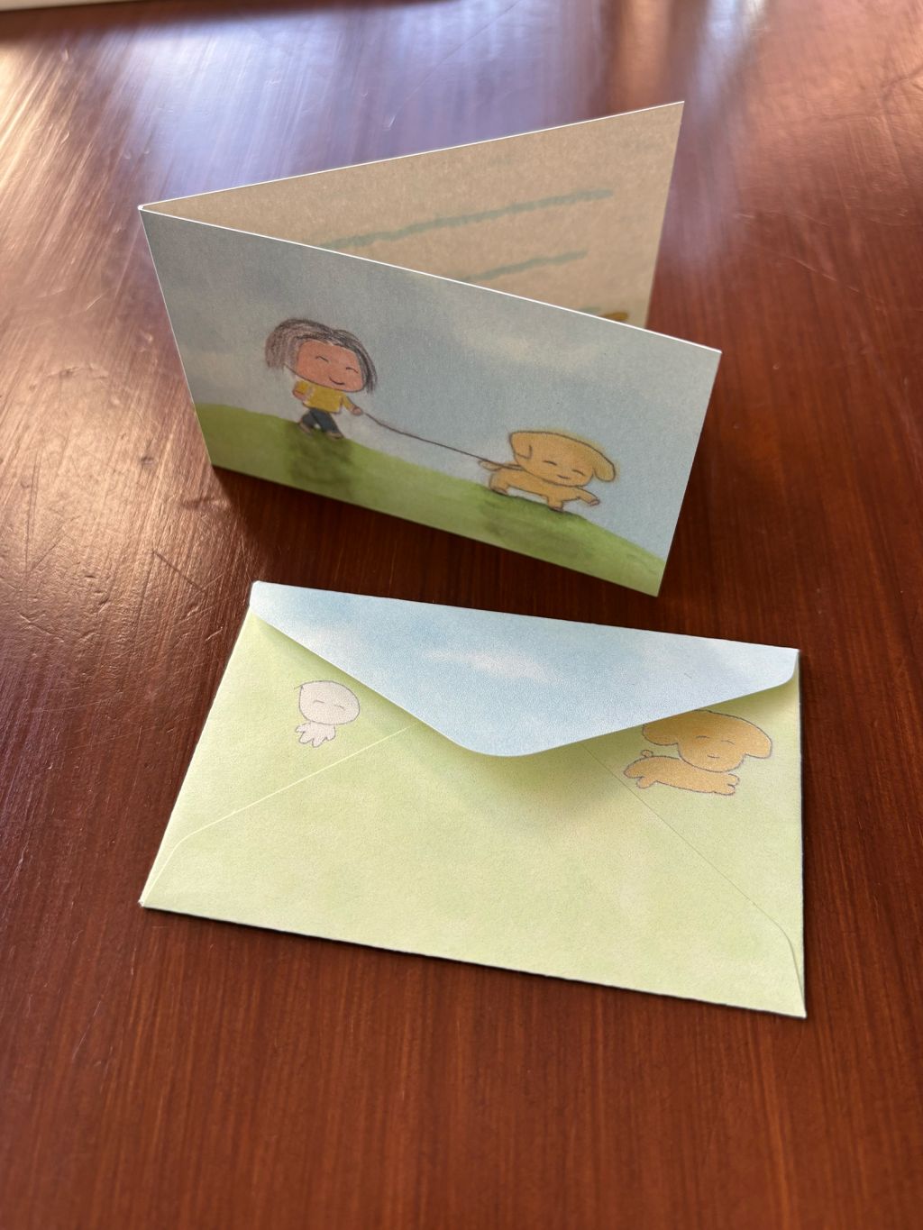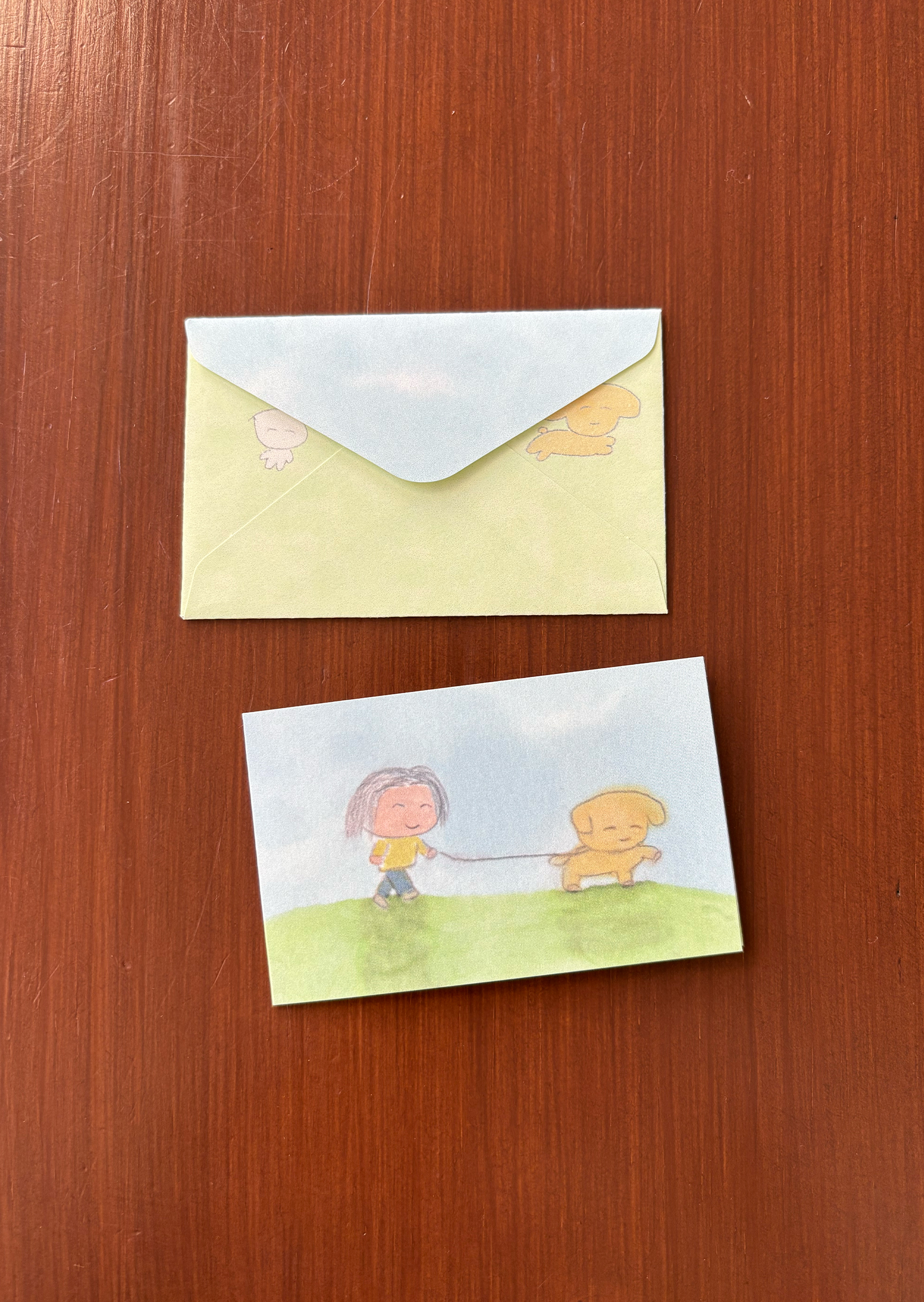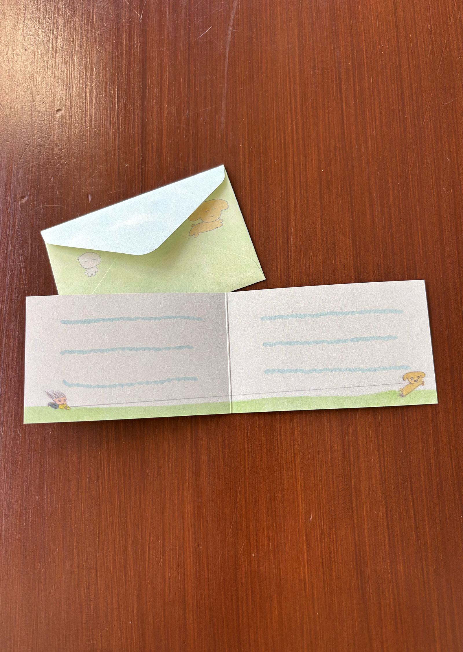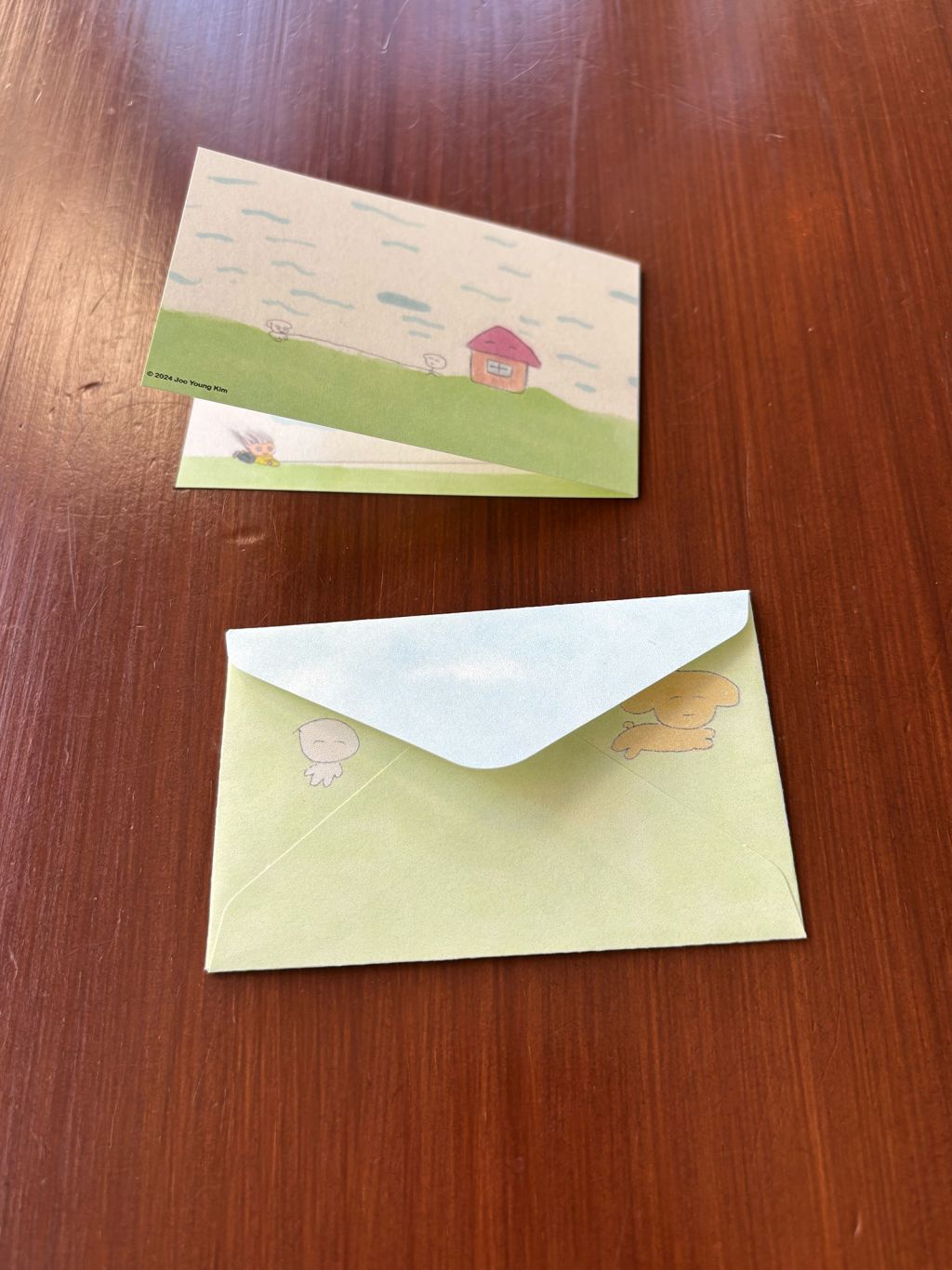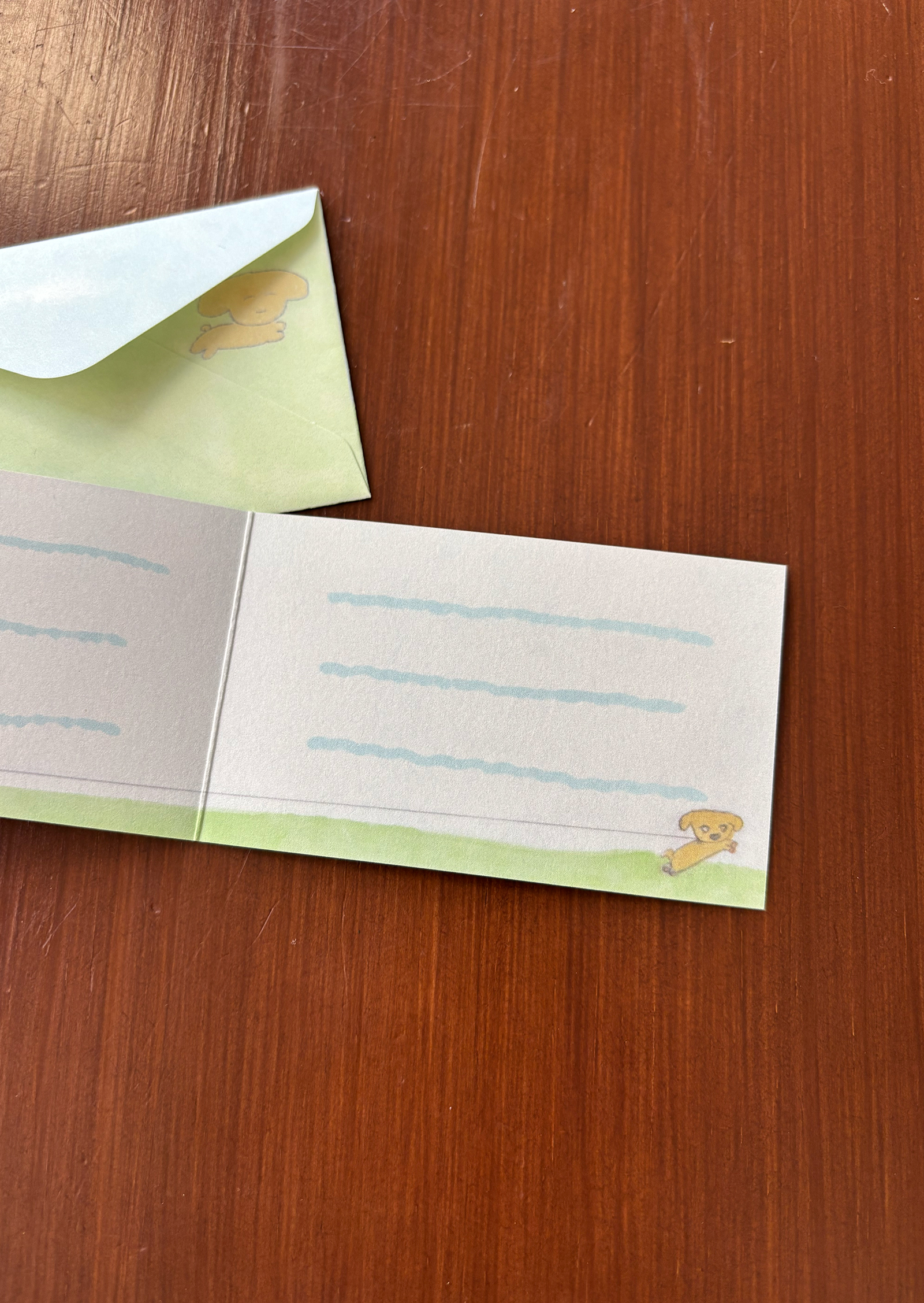 접지 카드를 펼치면 손편지를 작성할 공간이 있습니다. 편지 봉투에도 또 다른 사랑스러운 그림이 있어, 카드를 건네는 순간까지 기분 좋은 위트를 더해줍니다.