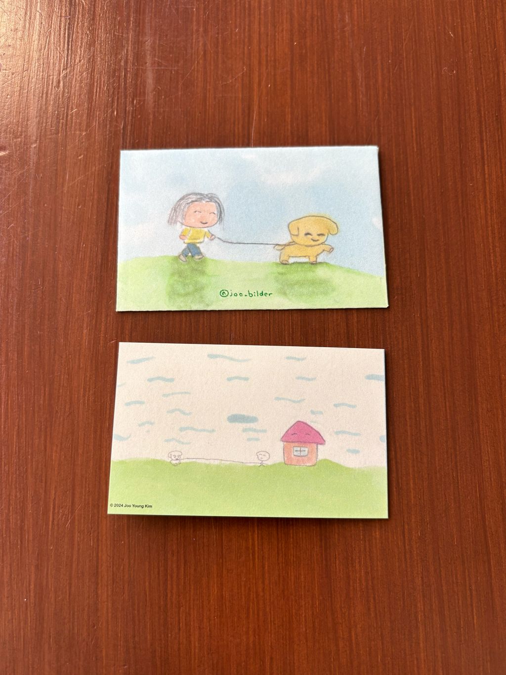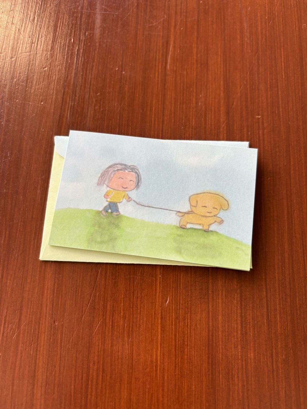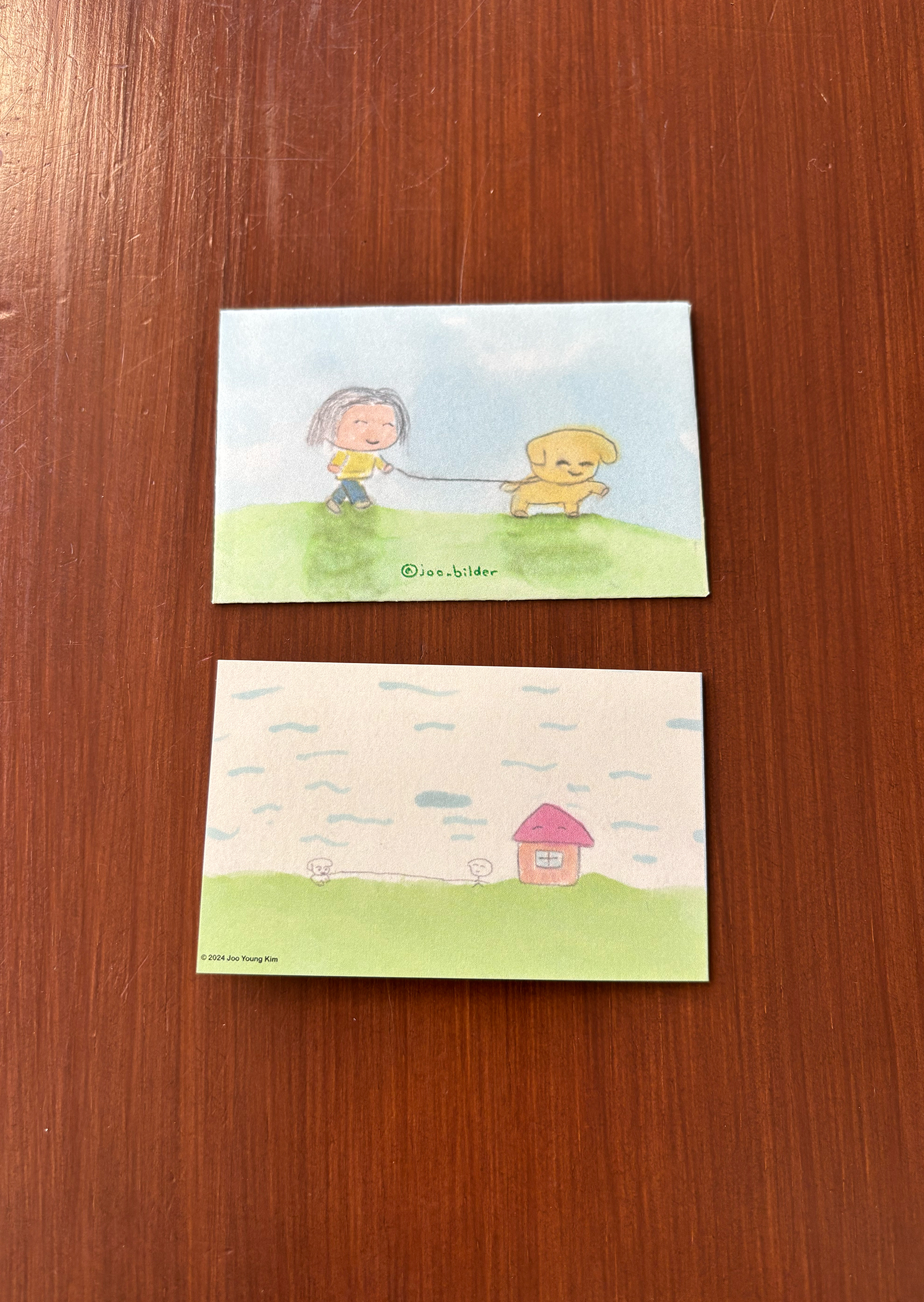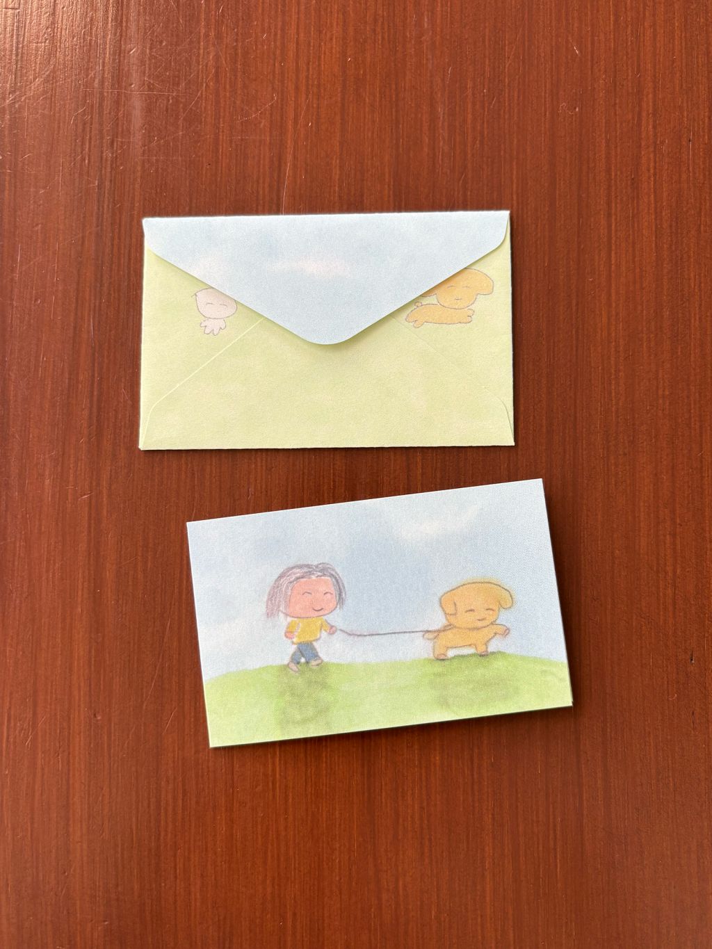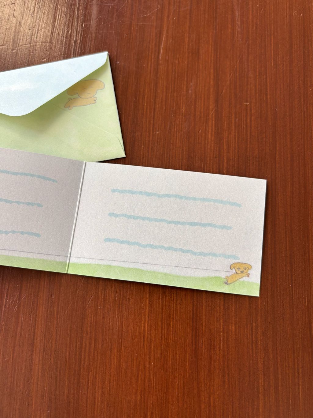 접지 카드를 펼치면 손편지를 작성할 공간이 있습니다. 편지 봉투에도 또 다른 사랑스러운 그림이 있어, 카드를 건네는 순간까지 기분 좋은 위트를 더해줍니다.