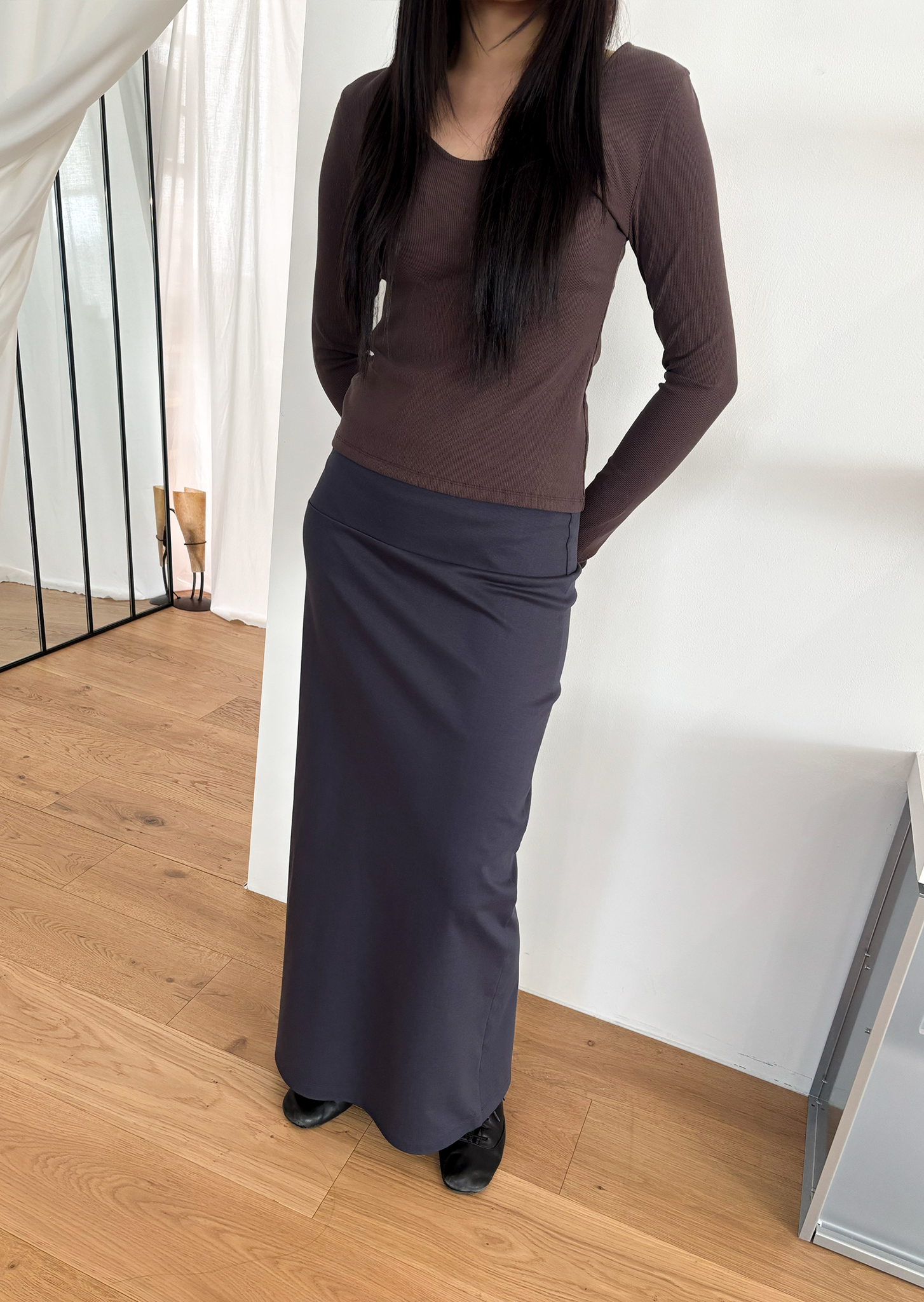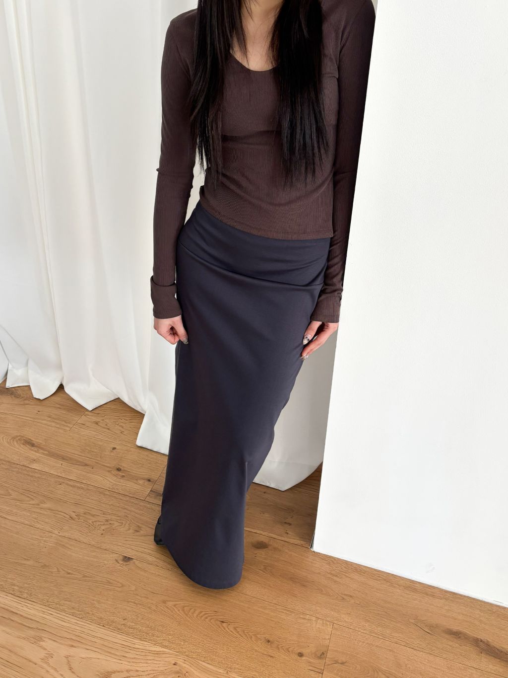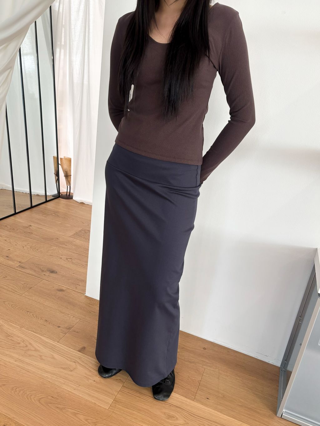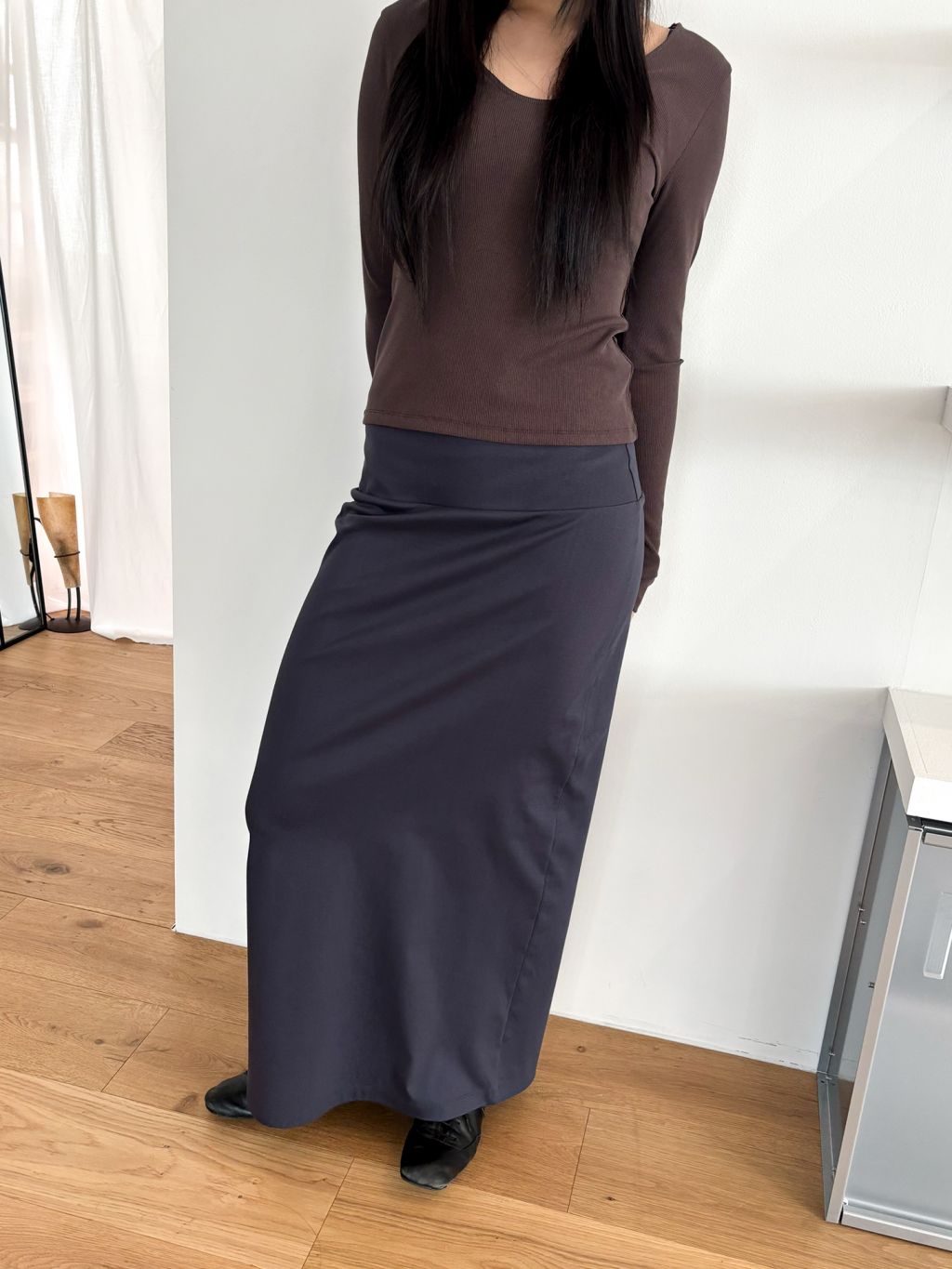 Guide. 이번 스커트는 키에 관계없이 동일한 핏이 유지되도록 두 가지 기장 옵션으로 준비했습니다. 160cm 이하인 분들께 추천드리는 스탠다드 옵션으로, 수선 번거로움 없이 발등 라인에서 깔끔하게 머물도록 했어요. 160cm 이상인 분들께는 맥시 옵션을 추천드려요. 시중의 스커트가 늘 짧아 아쉬웠던 분들은 이 스커트를 눈여겨봐 주세요. 이 두 가지 옵션은 기장만 6cm 차이를 두었습니다.