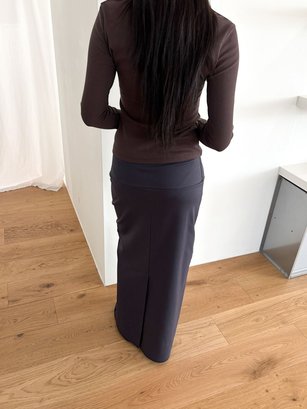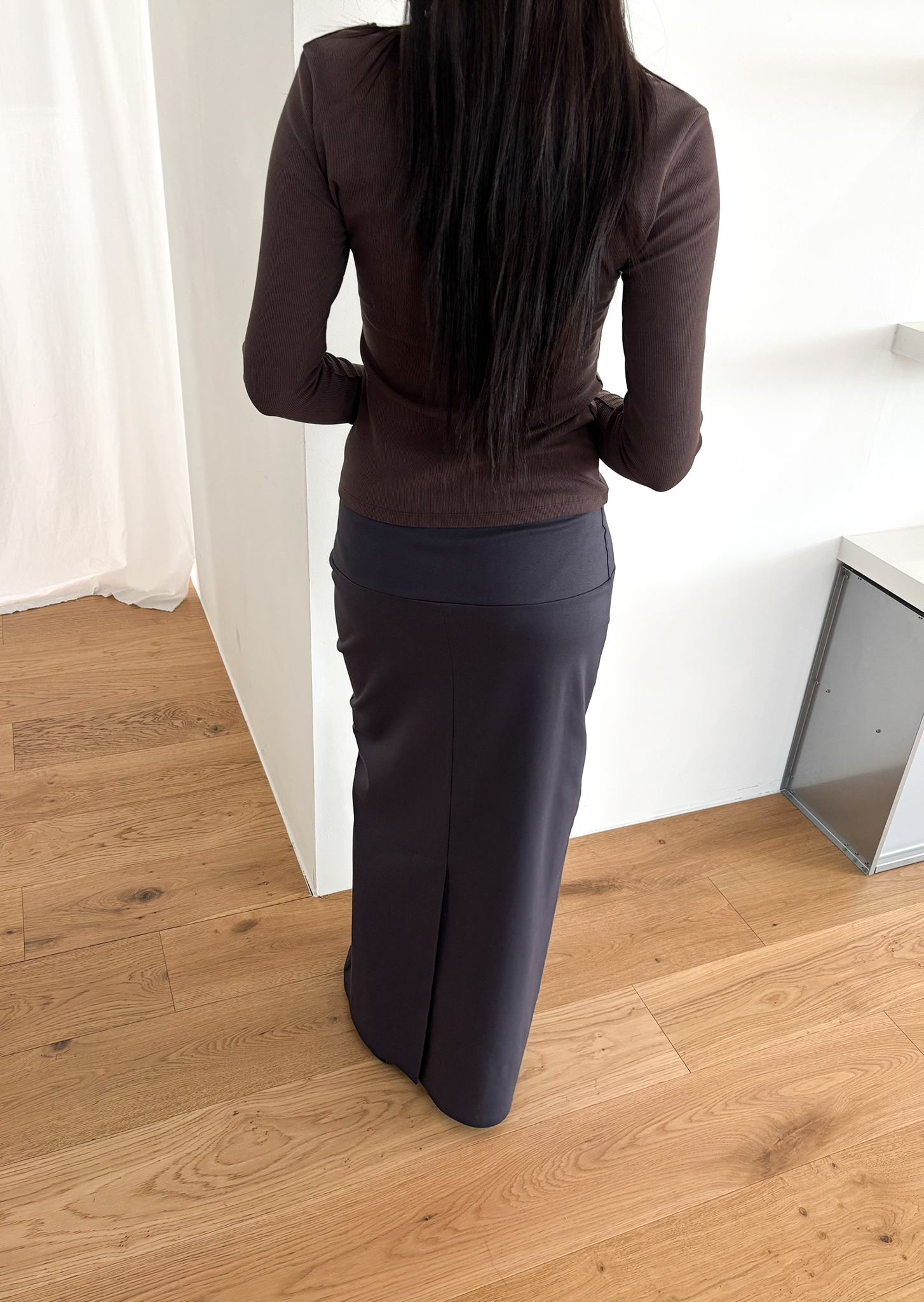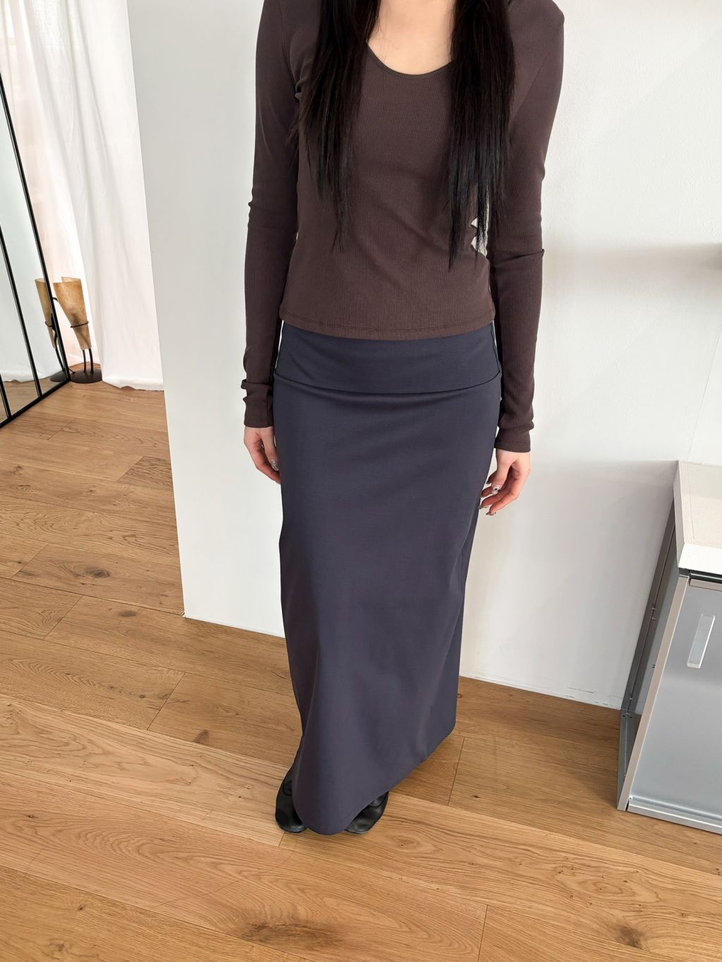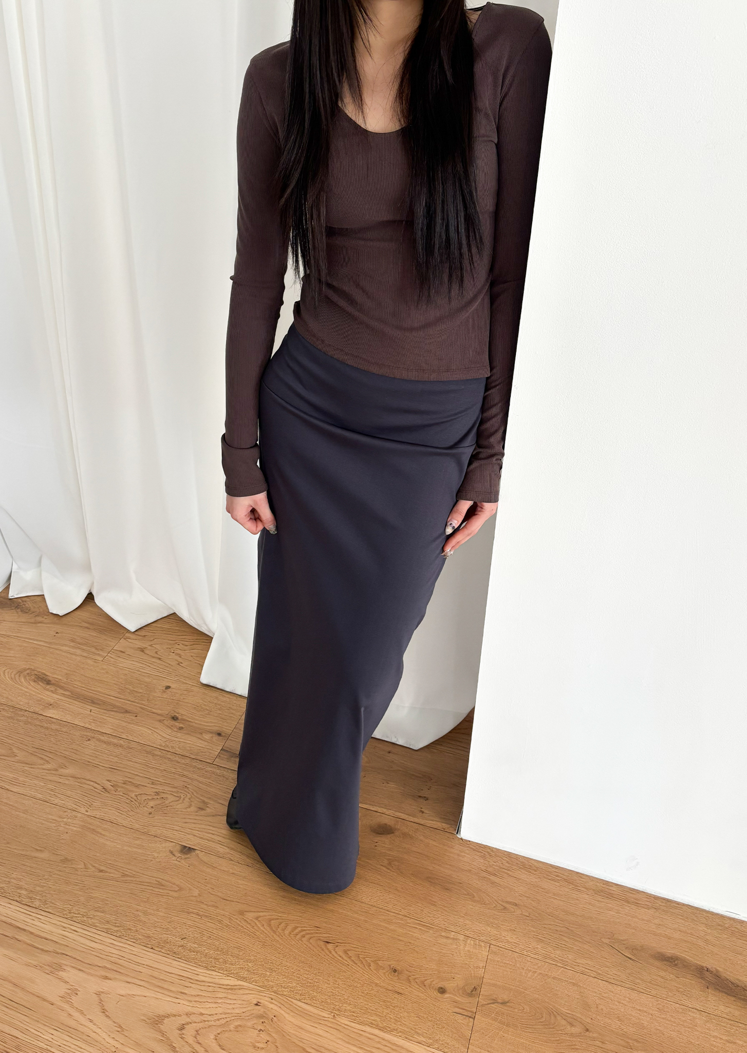 Guide. 이번 스커트는 키에 관계없이 동일한 핏이 유지되도록 두 가지 기장 옵션으로 준비했습니다. 160cm 이하인 분들께 추천드리는 스탠다드 옵션으로, 수선 번거로움 없이 발등 라인에서 깔끔하게 머물도록 했어요. 160cm 이상인 분들께는 맥시 옵션을 추천드려요. 시중의 스커트가 늘 짧아 아쉬웠던 분들은 이 스커트를 눈여겨봐 주세요. 이 두 가지 옵션은 기장만 6cm 차이를 두었습니다.