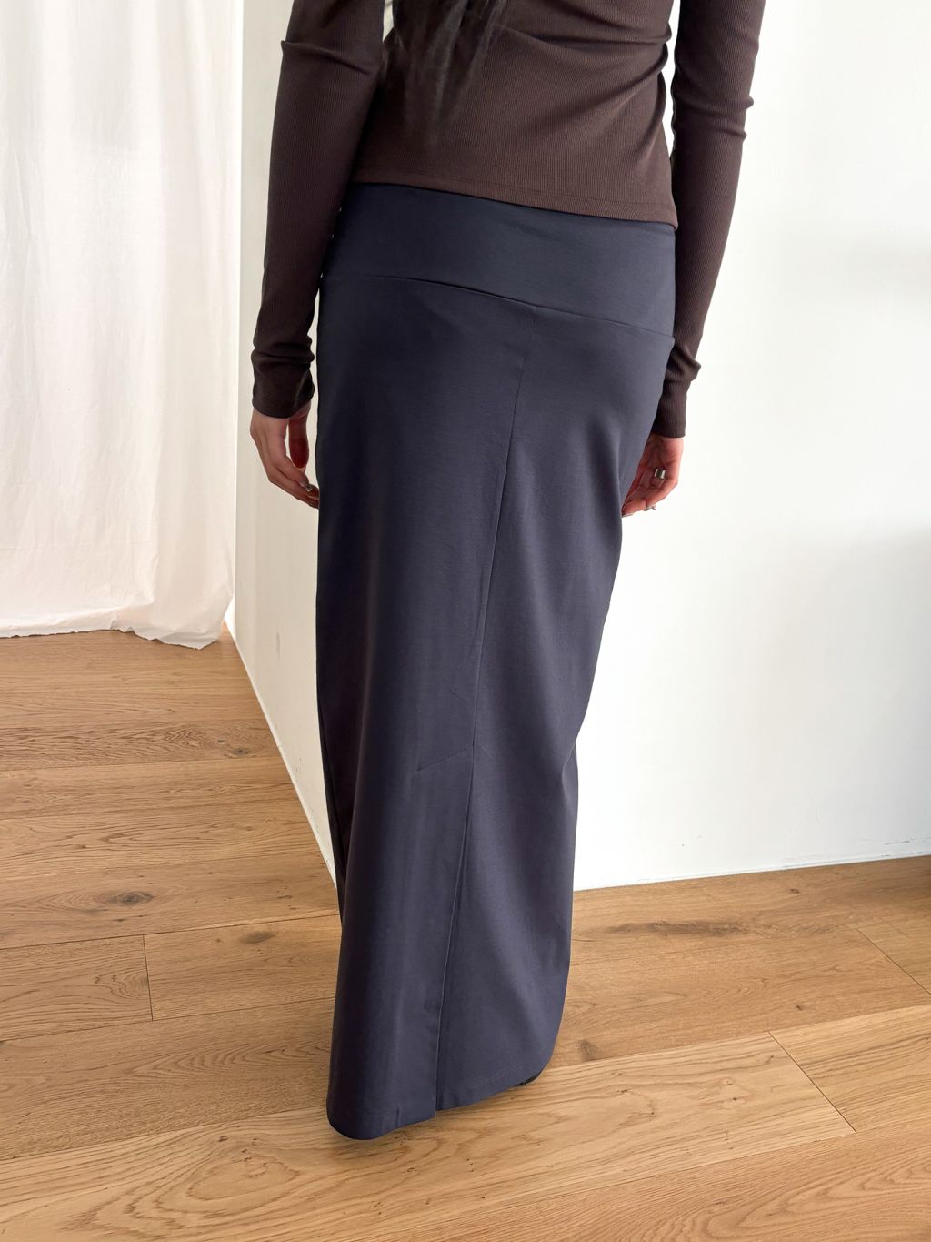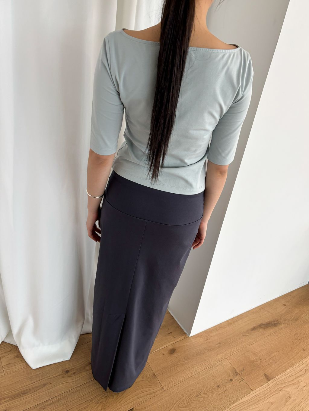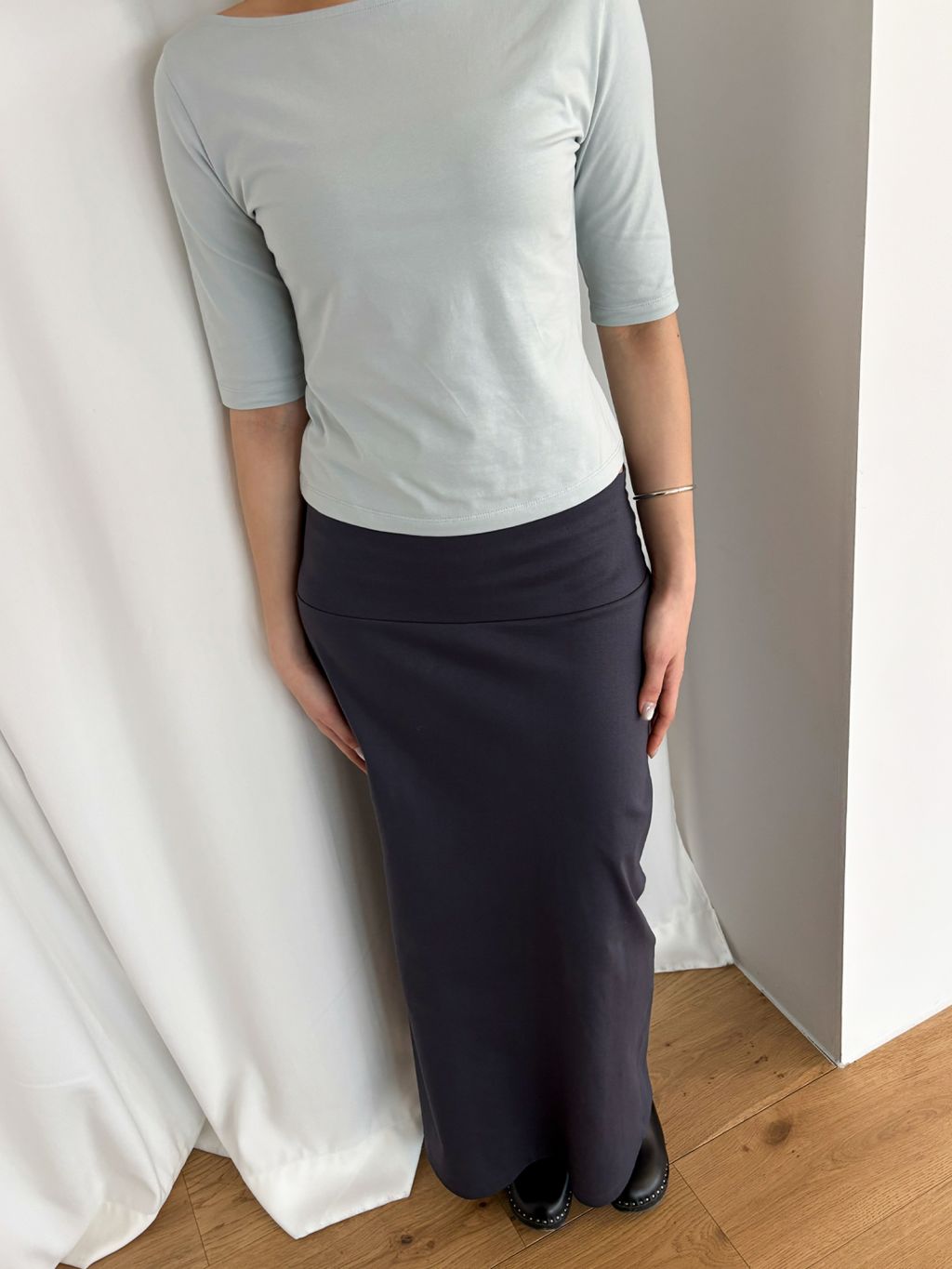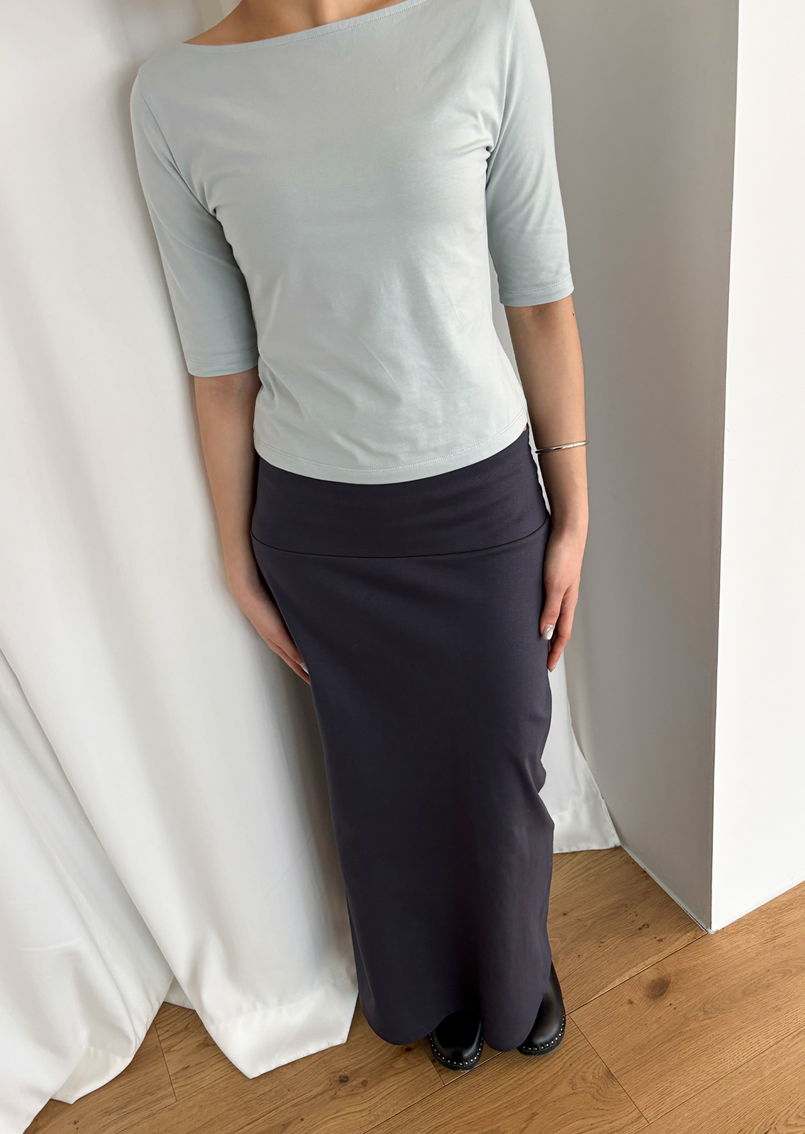 와이드한 밴딩의 구조적인 디테일이 돋보이는 스트레이트 스커트. 특별한 장식을 곁들이지 않아도, 맥시한 기장감이 자연스레 눈길을 끕니다.