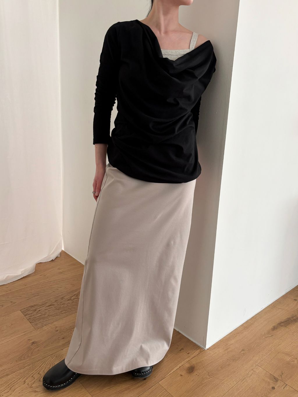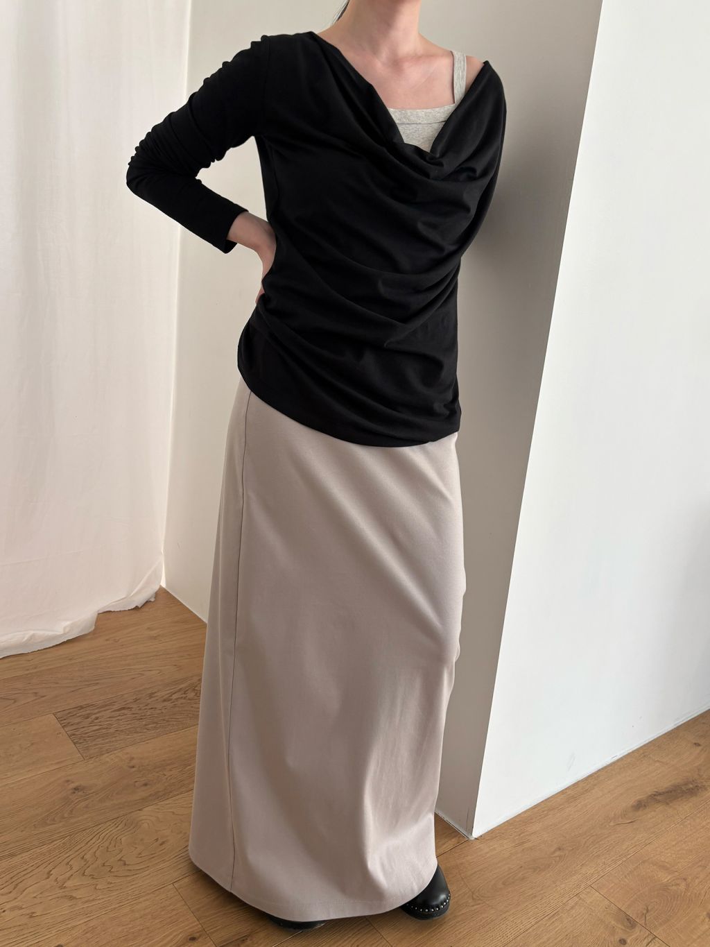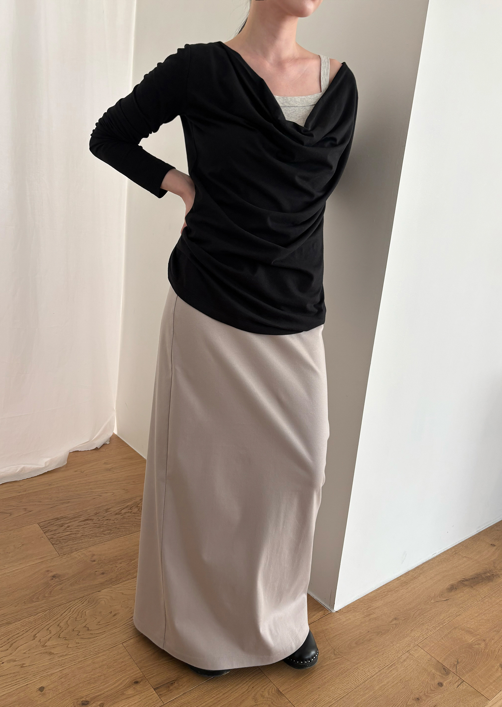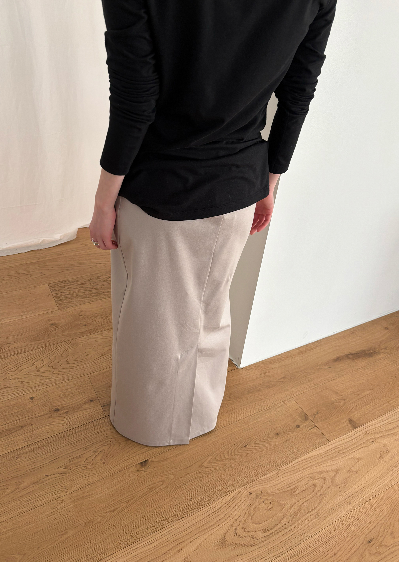 Guide. 이번 스커트는 키에 관계없이 동일한 핏이 유지되도록 두 가지 기장 옵션으로 준비했습니다. 160cm 이하인 분들께 추천드리는 스탠다드 옵션으로, 수선 번거로움 없이 발등 라인에서 깔끔하게 머물도록 했어요. 160cm 이상인 분들께는 맥시 옵션을 추천드려요. 시중의 스커트가 늘 짧아 아쉬웠던 분들은 이 스커트를 눈여겨봐 주세요. 이 두 가지 옵션은 기장만 6cm 차이를 두었습니다.
