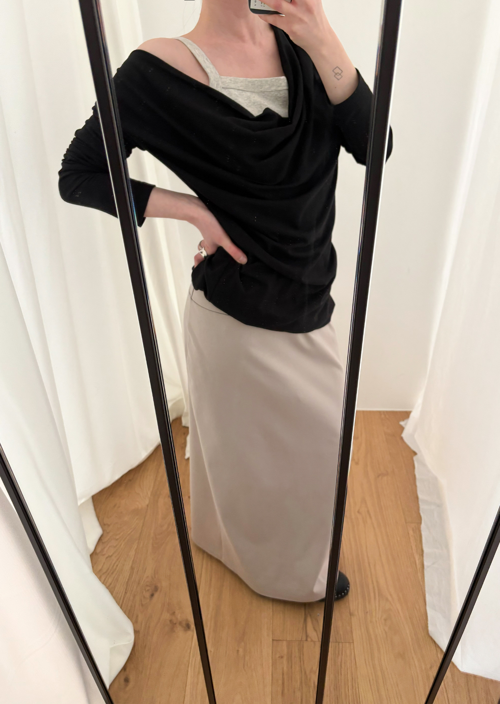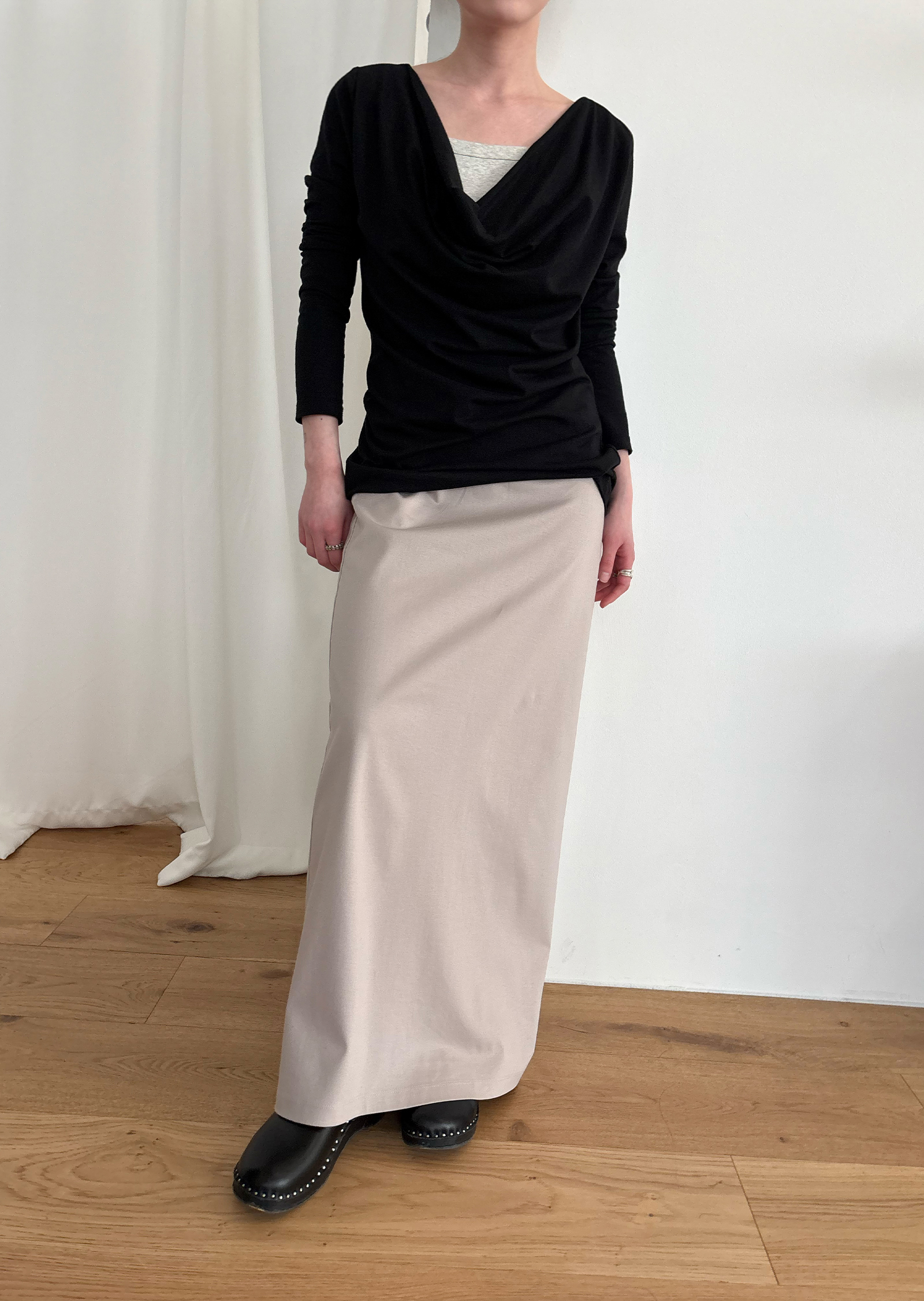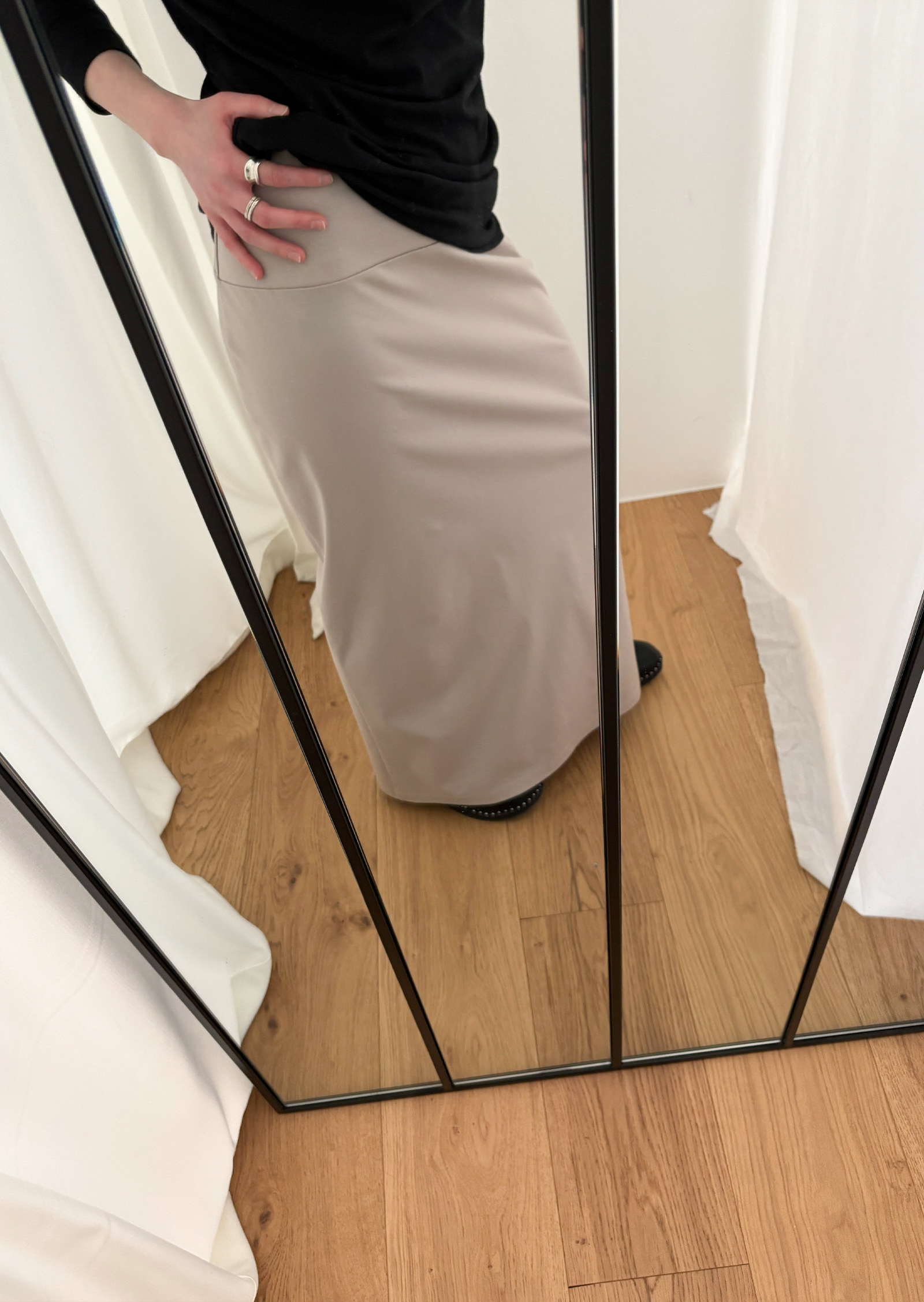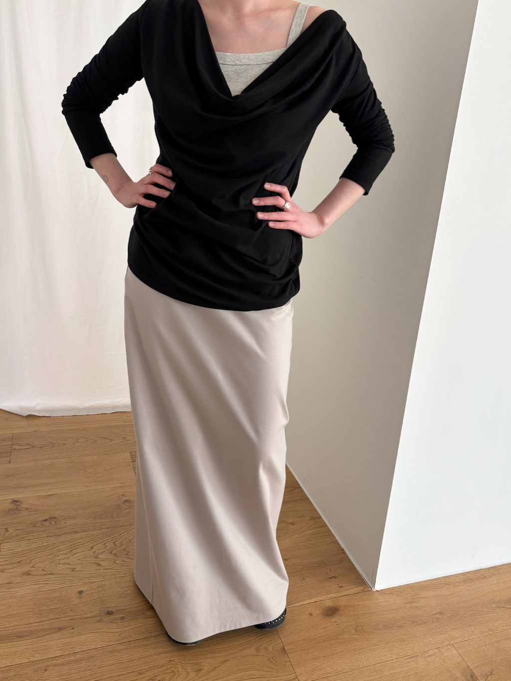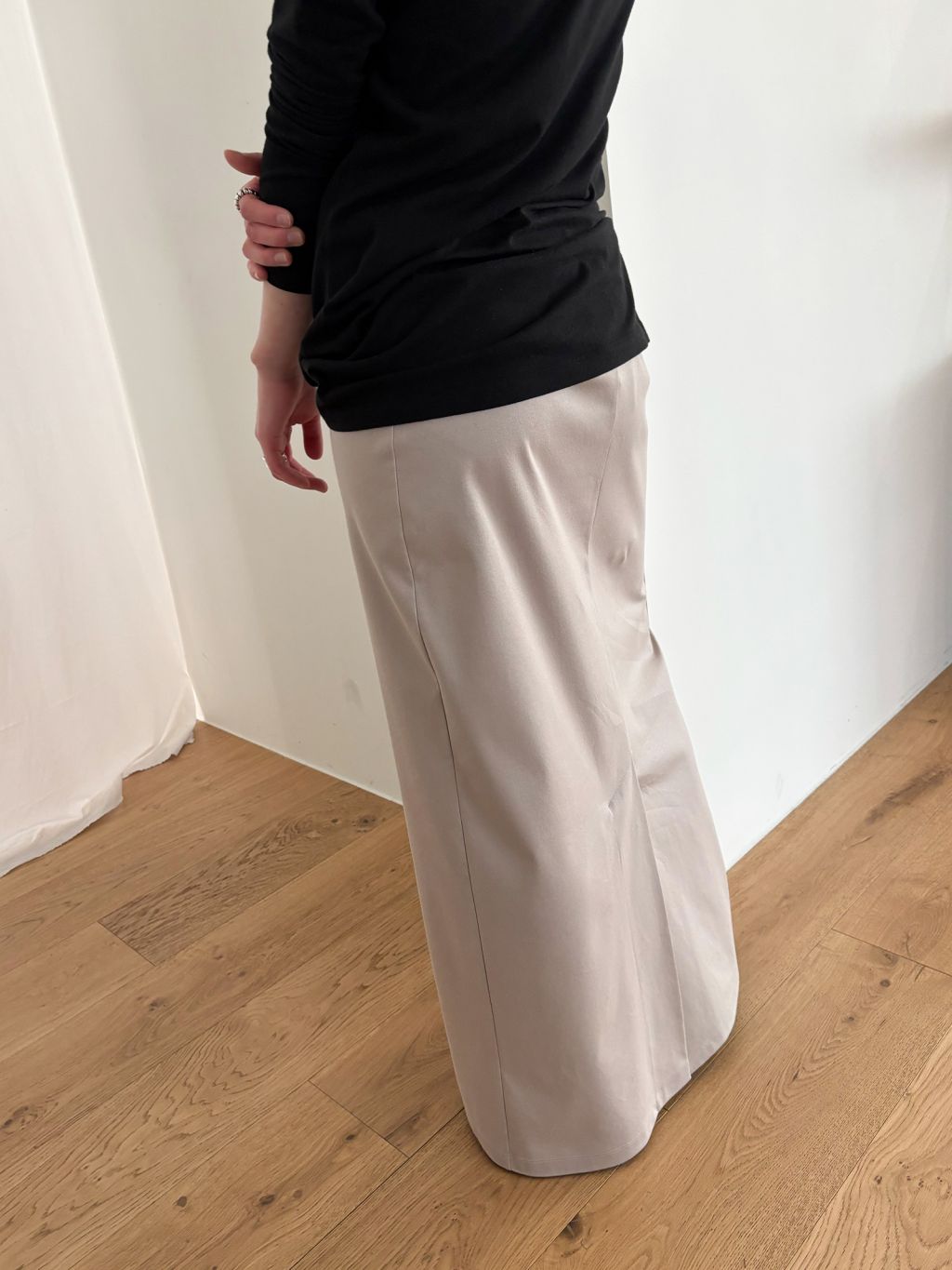 Guide. 이번 스커트는 키에 관계없이 동일한 핏이 유지되도록 두 가지 기장 옵션으로 준비했습니다. 160cm 이하인 분들께 추천드리는 스탠다드 옵션으로, 수선 번거로움 없이 발등 라인에서 깔끔하게 머물도록 했어요. 160cm 이상인 분들께는 맥시 옵션을 추천드려요. 시중의 스커트가 늘 짧아 아쉬웠던 분들은 이 스커트를 눈여겨봐 주세요. 이 두 가지 옵션은 기장만 6cm 차이를 두었습니다.
