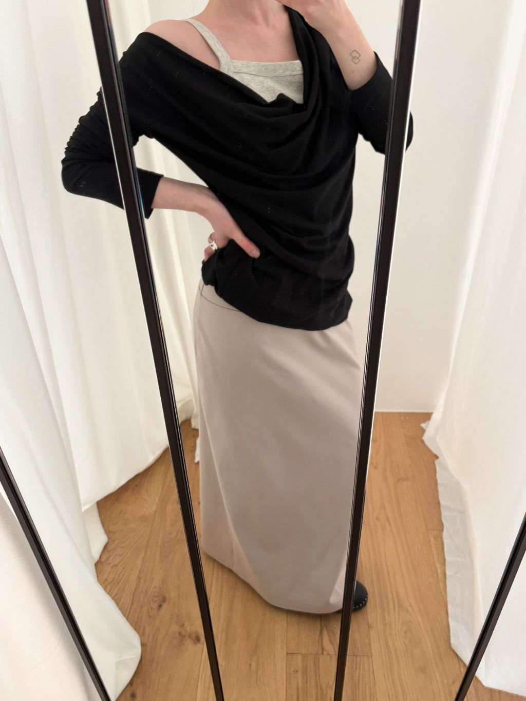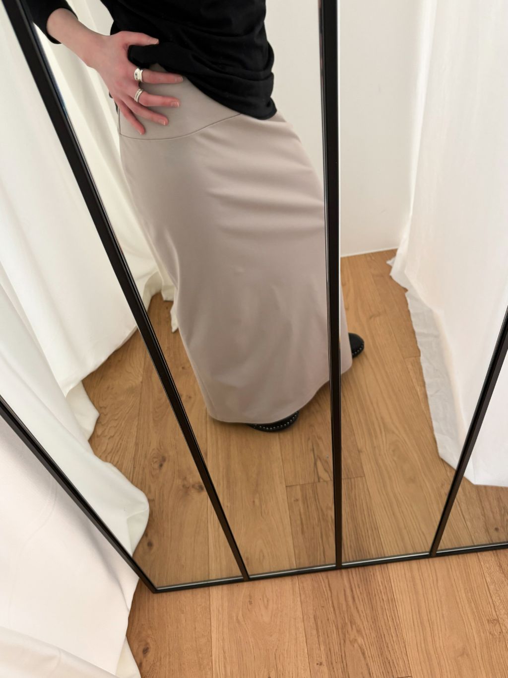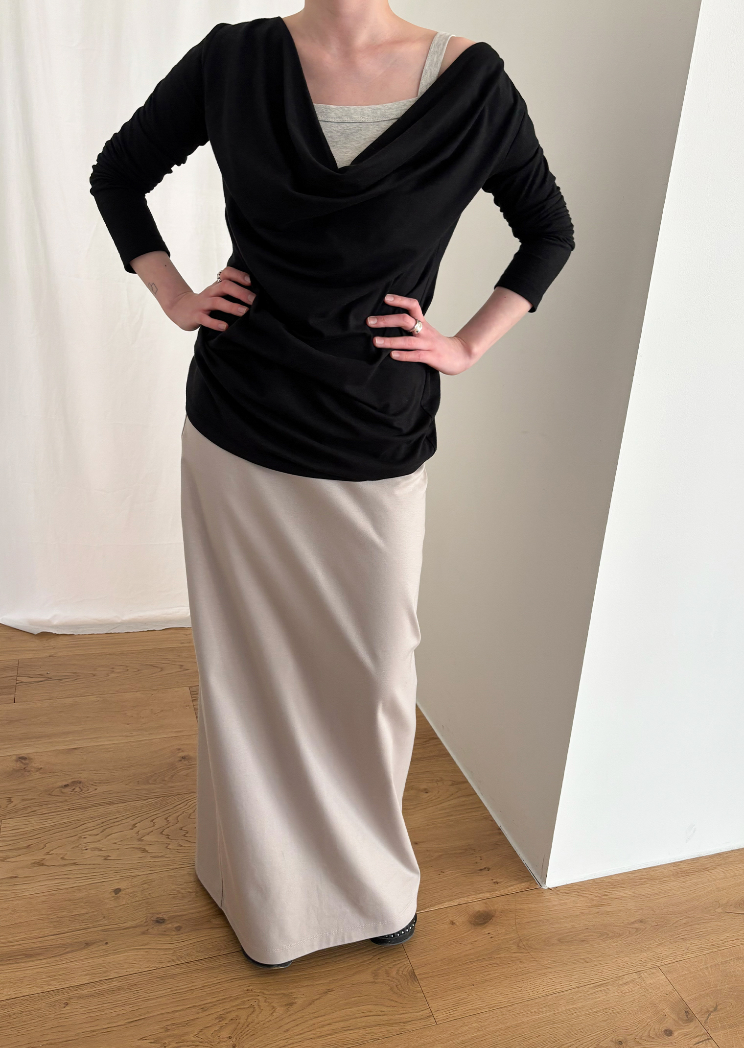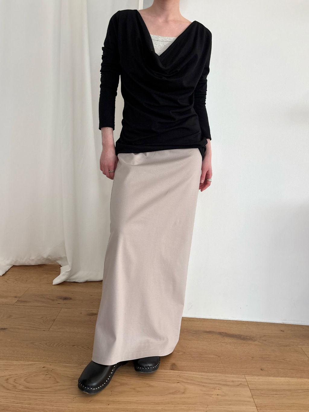 Guide. 이번 스커트는 키에 관계없이 동일한 핏이 유지되도록 두 가지 기장 옵션으로 준비했습니다. 160cm 이하인 분들께 추천드리는 스탠다드 옵션으로, 수선 번거로움 없이 발등 라인에서 깔끔하게 머물도록 했어요. 160cm 이상인 분들께는 맥시 옵션을 추천드려요. 시중의 스커트가 늘 짧아 아쉬웠던 분들은 이 스커트를 눈여겨봐 주세요. 이 두 가지 옵션은 기장만 6cm 차이를 두었습니다.
