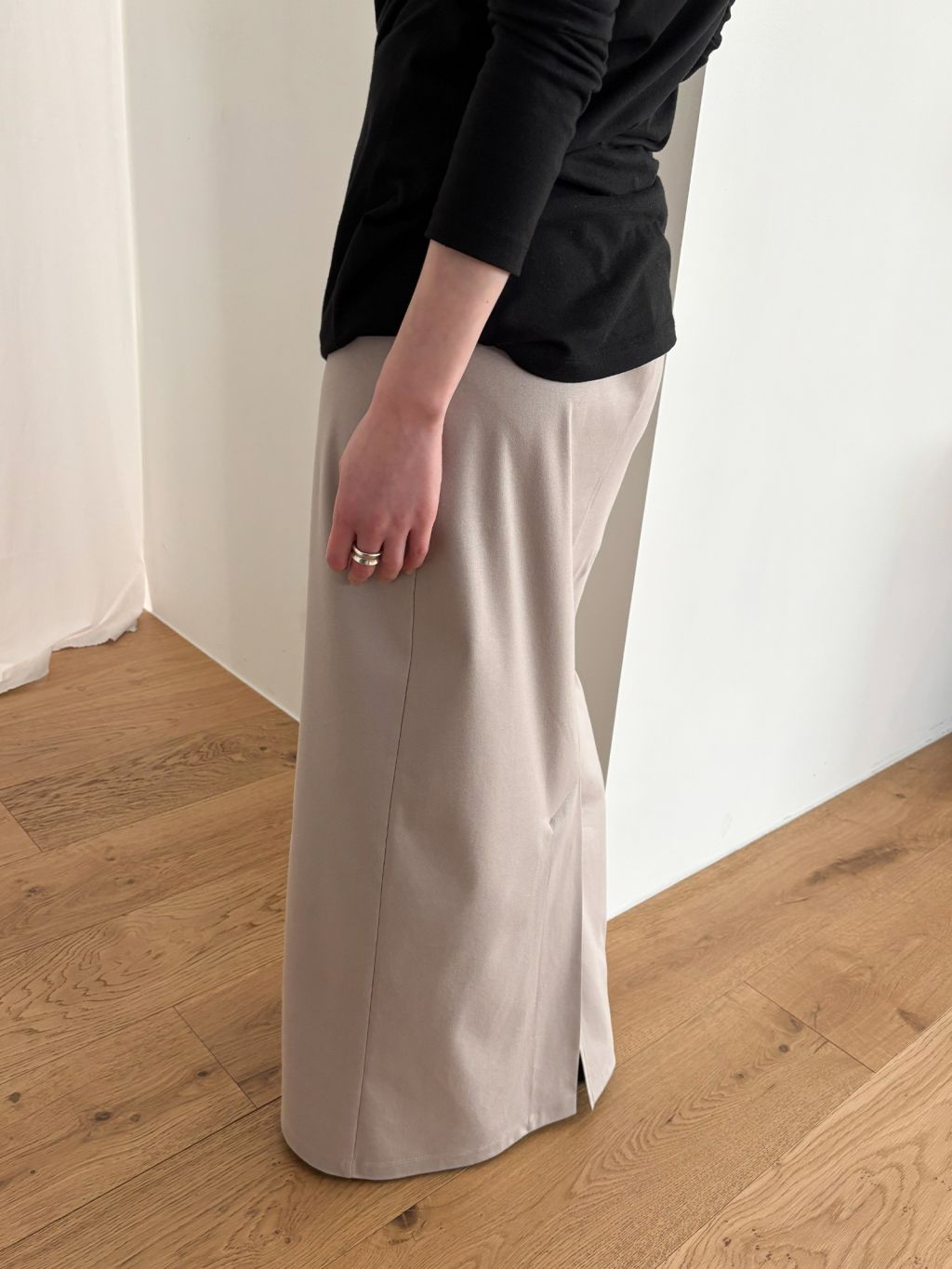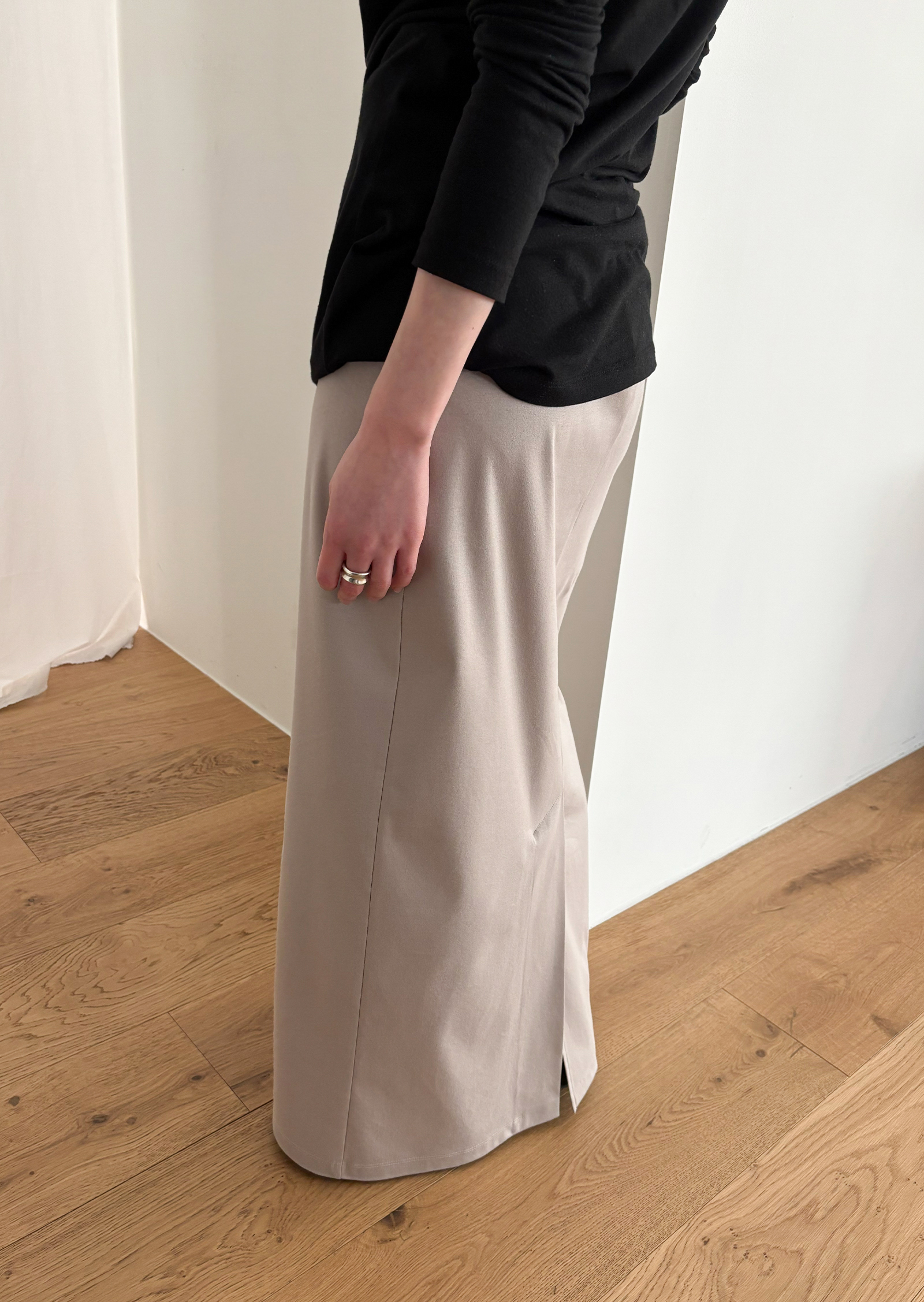 부드러운 텍스쳐와 넓은 밴딩으로 편안한 착용감을 주고, 종아리 실루엣을 조심스레 드러내는 깊이감의 슬릿은 자연스러운 움직임을 돕습니다.