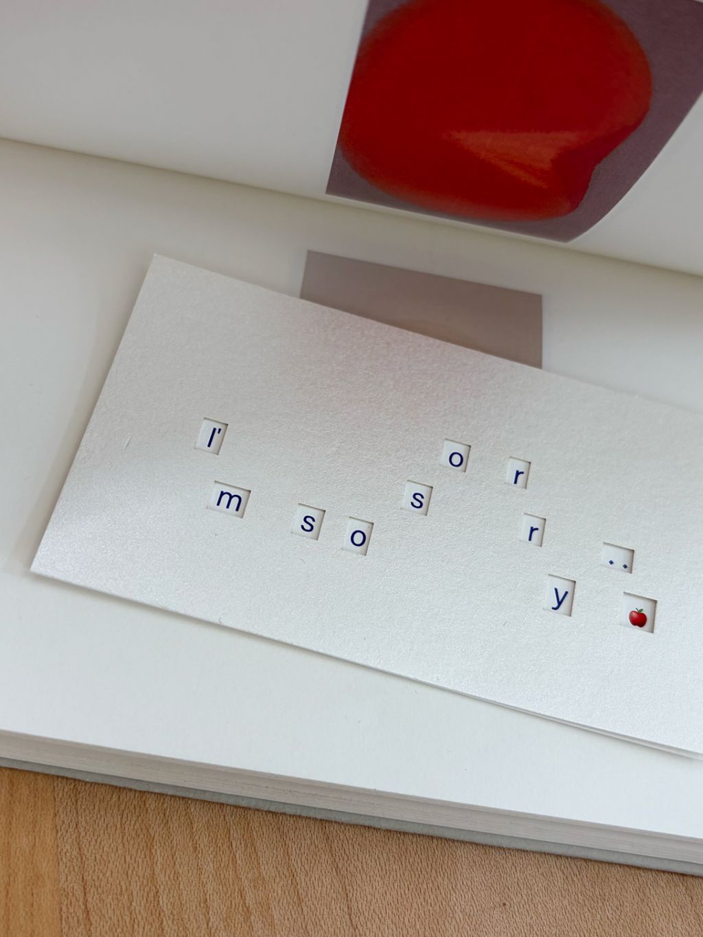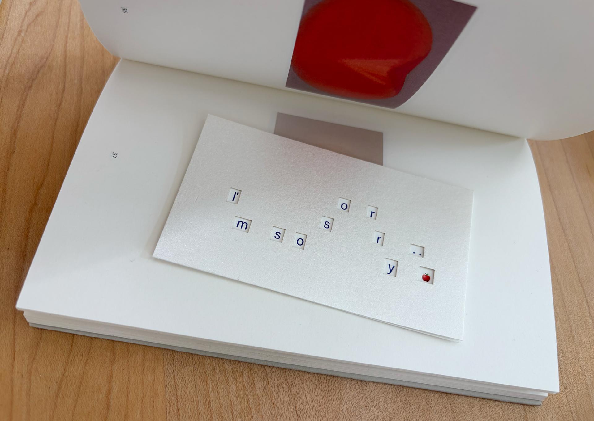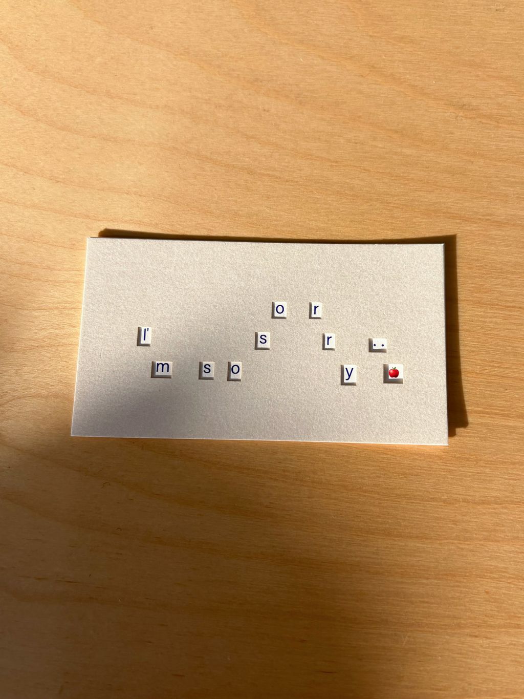 암호처럼 쓰인 알파벳 카드 위에 카드를 겹치면 I'm so sorry 글자가 나타납니다.