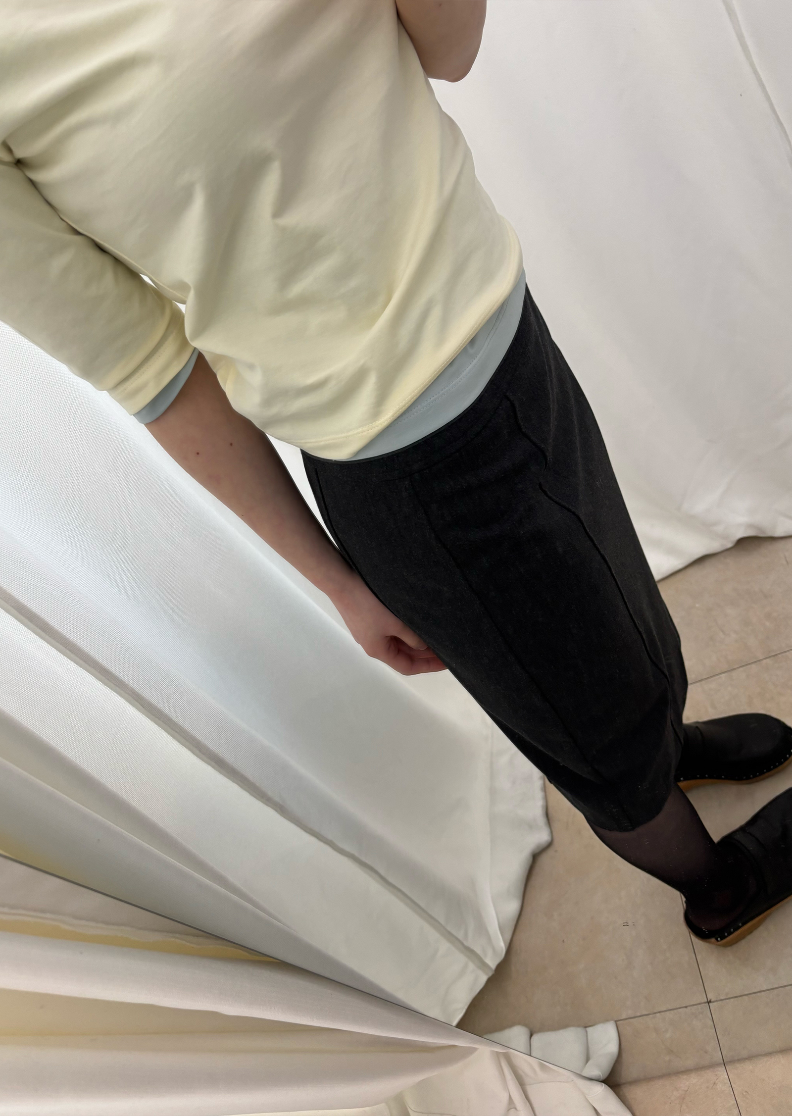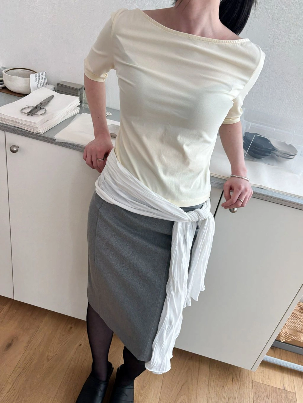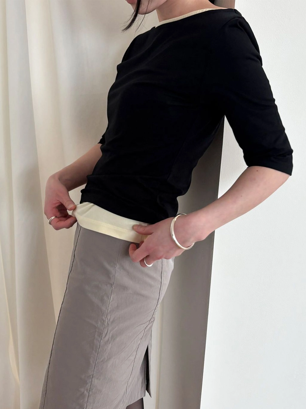 바디에 과하게 붙지 않아 보디 라인을 자연스레 따르는 듯해 부담 없이 착용됩니다.
