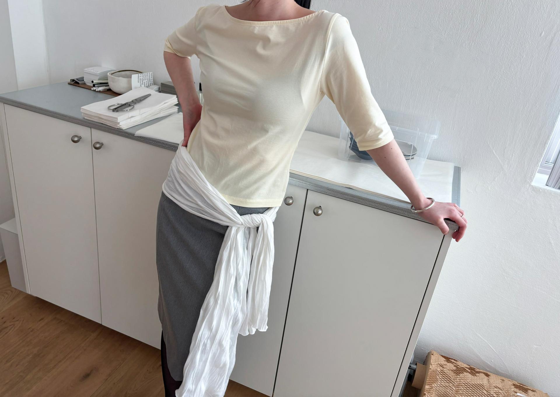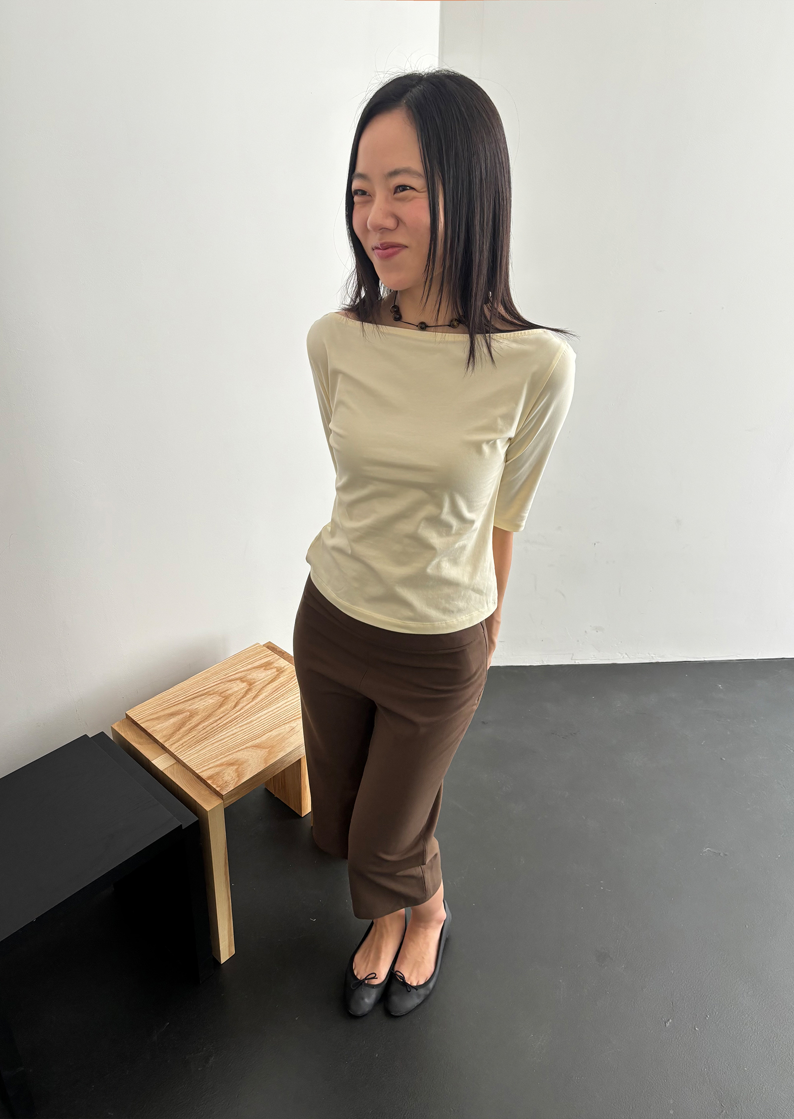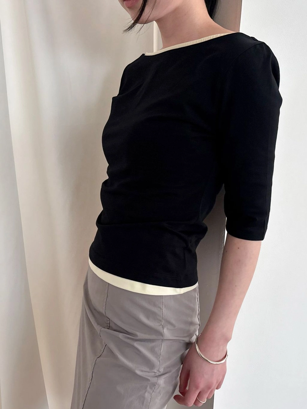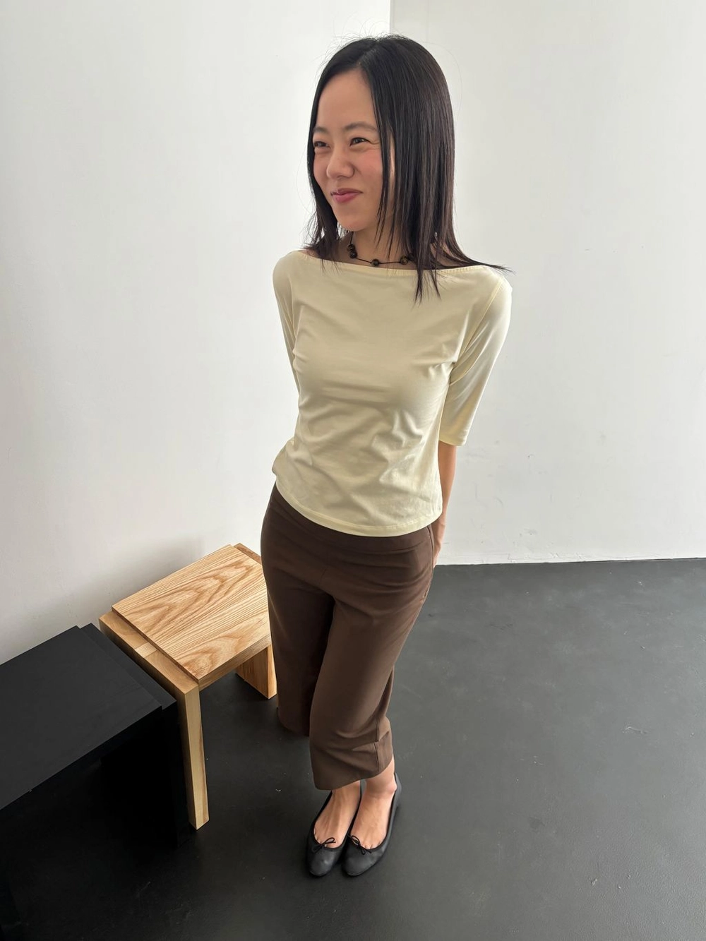 군더더기 없는 보트넥 라인은 자연스레 쇄골을 노출해 내추럴한 포인트가 됩니다.