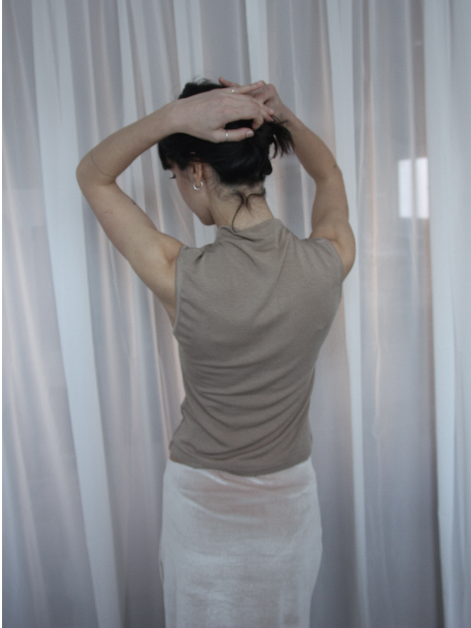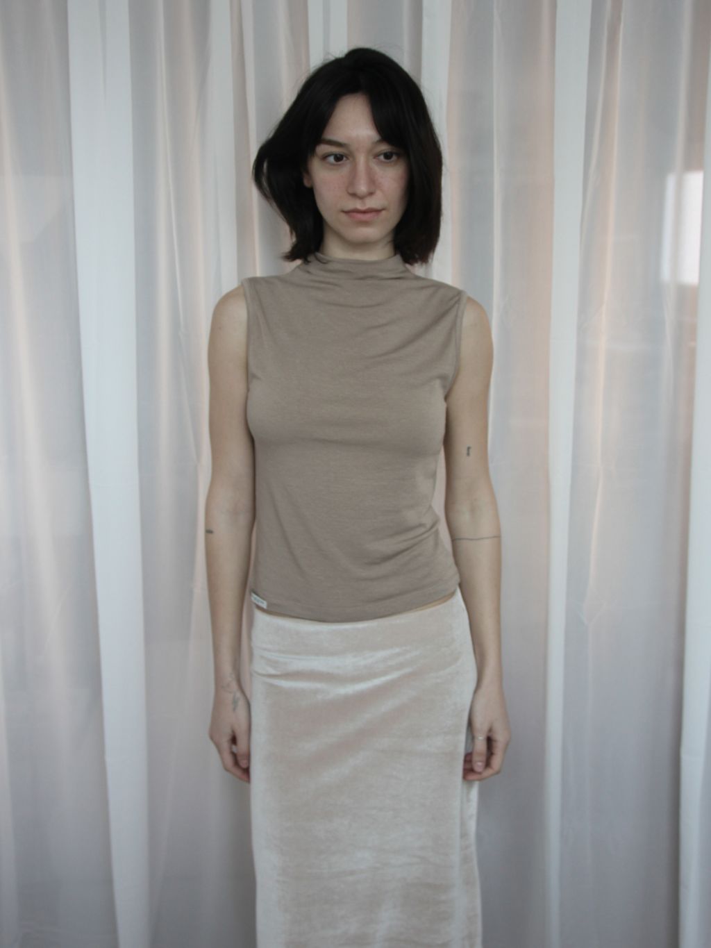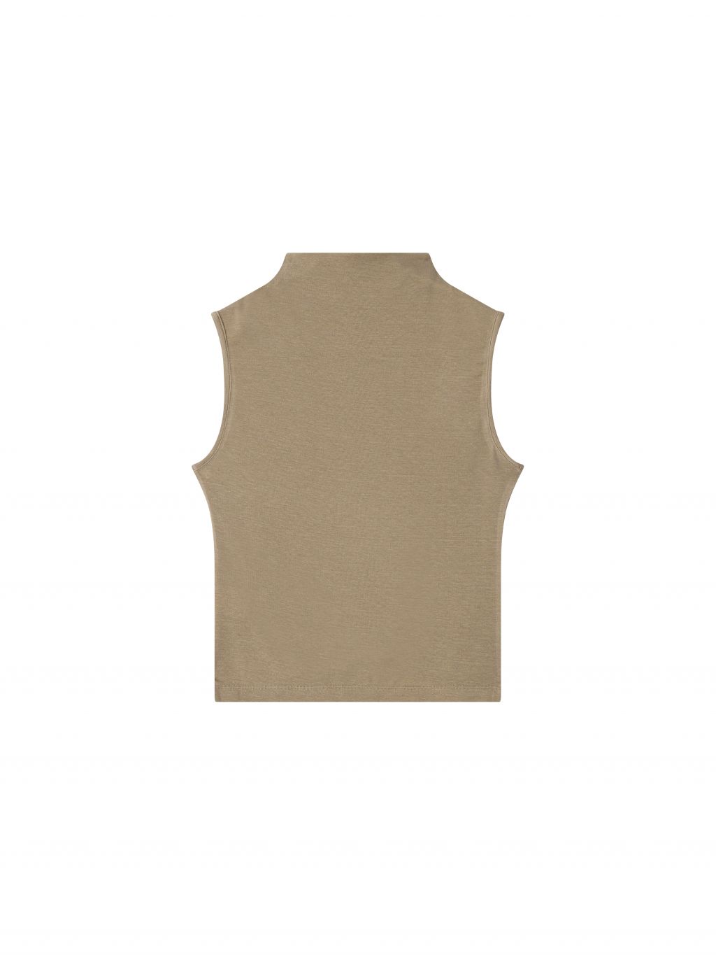 부드러운 톤의 토프 컬러로 담백하고 안정된 무드를 완성하는 슬리브리스 탑입니다.