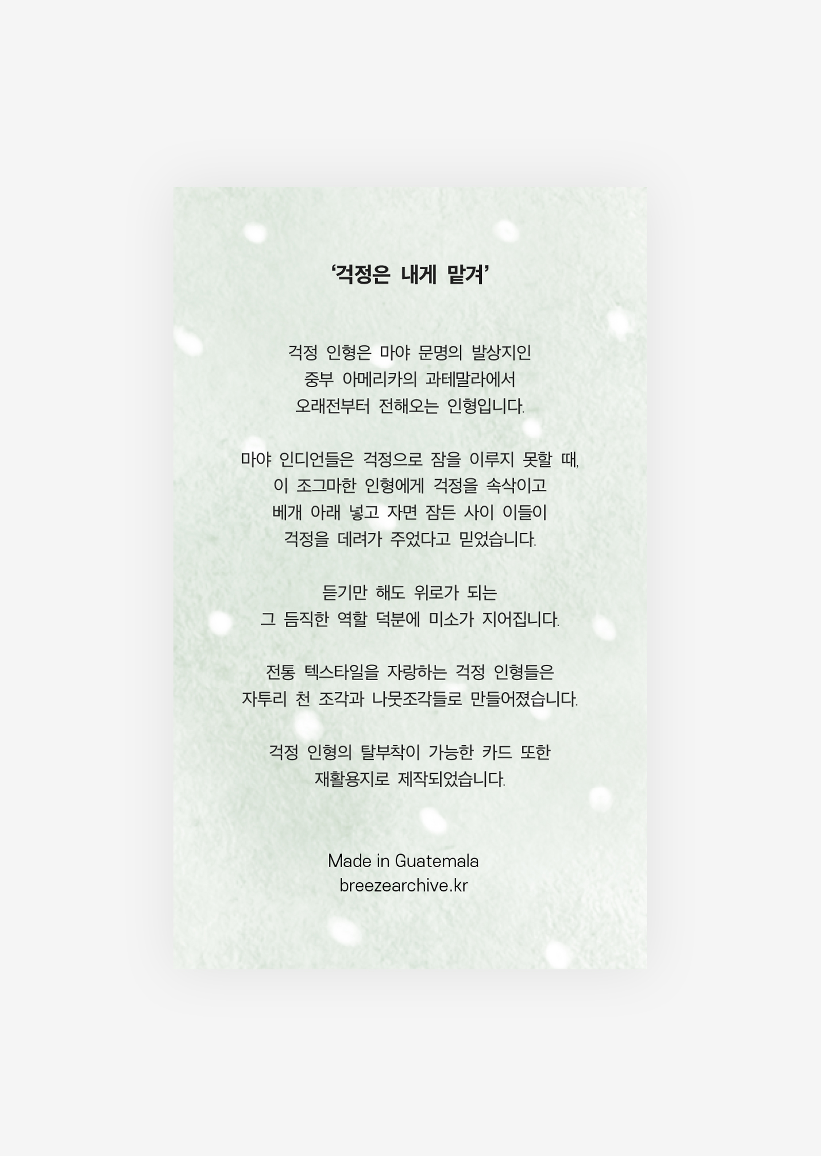 걱정 인형 1명 구매 시, 걱정 인형의 유래가 기재된 작은 메세지 카드 1장과 스티커가 동봉됩니다.