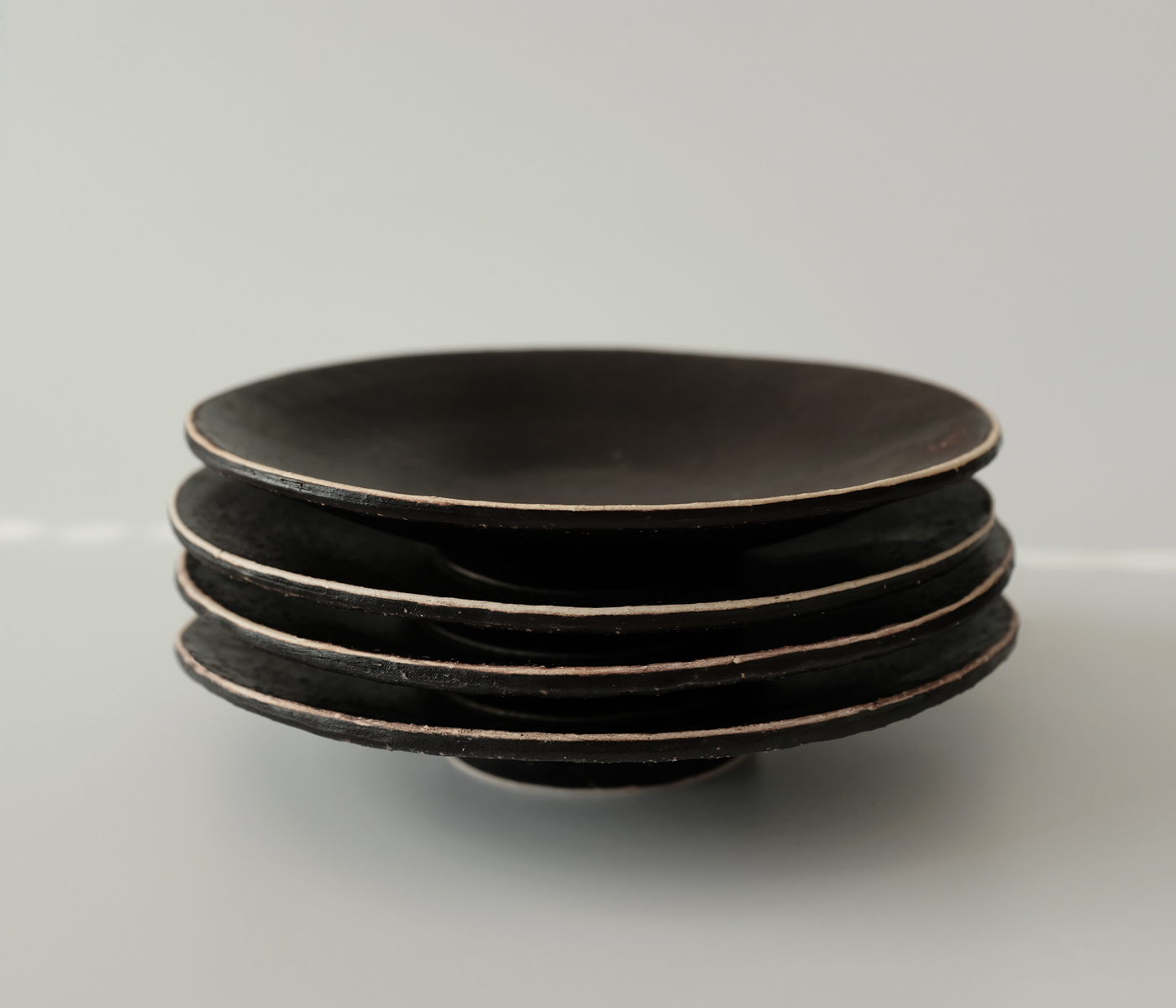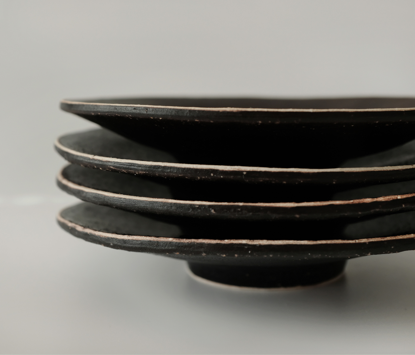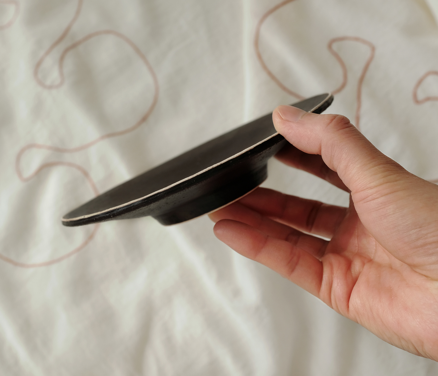 오돌토돌한 표면에 검은색 유약을 입히고 테두리를 닦아내어 하얀 라인이 생겼습니다.