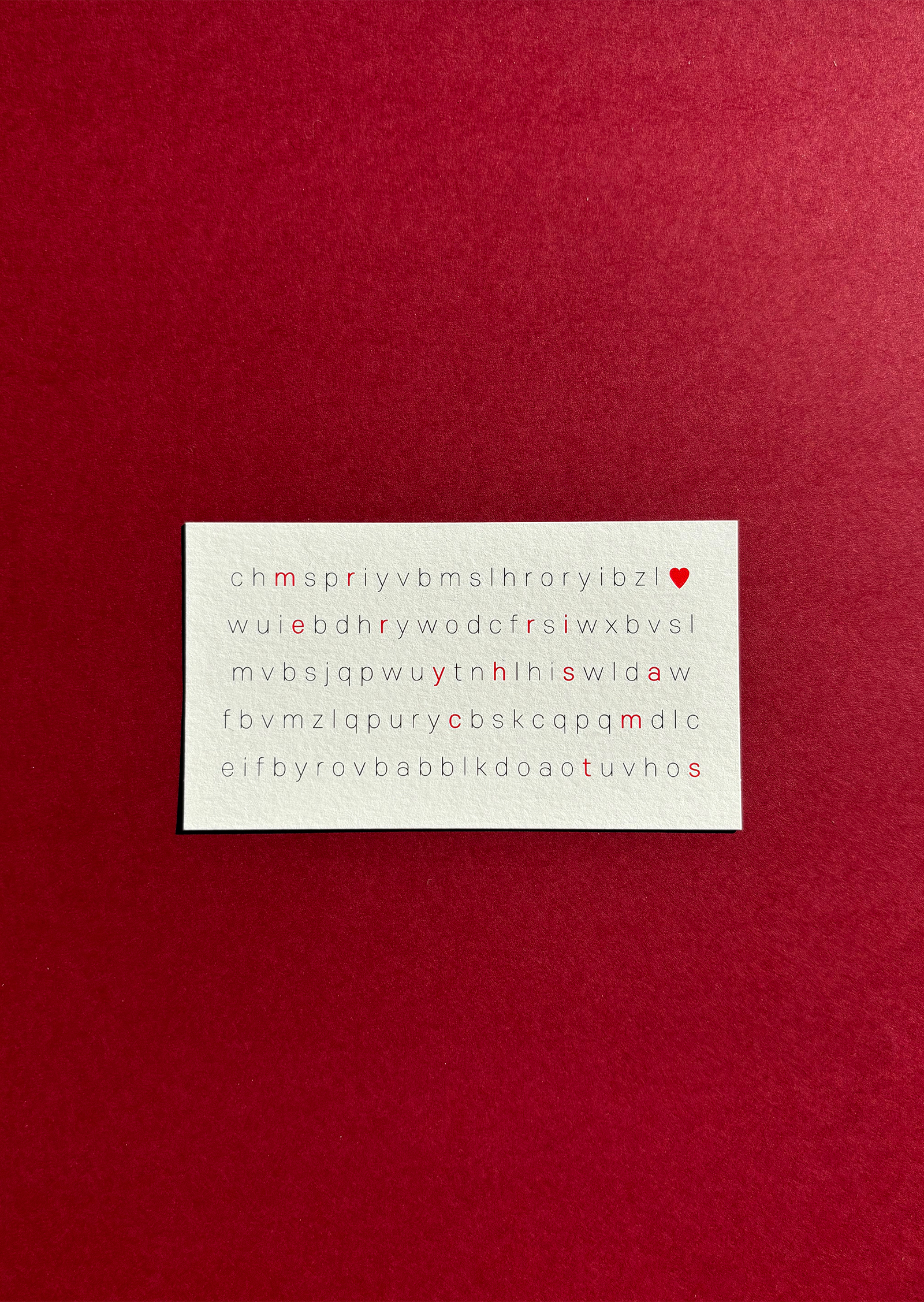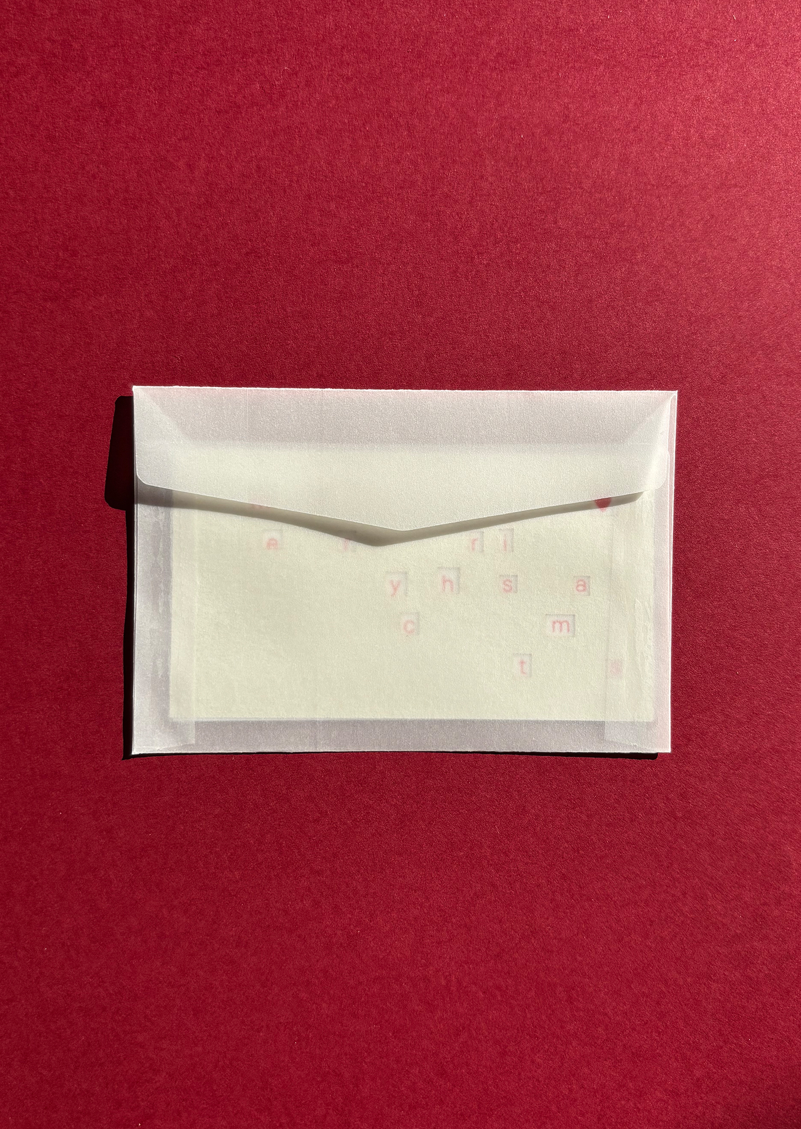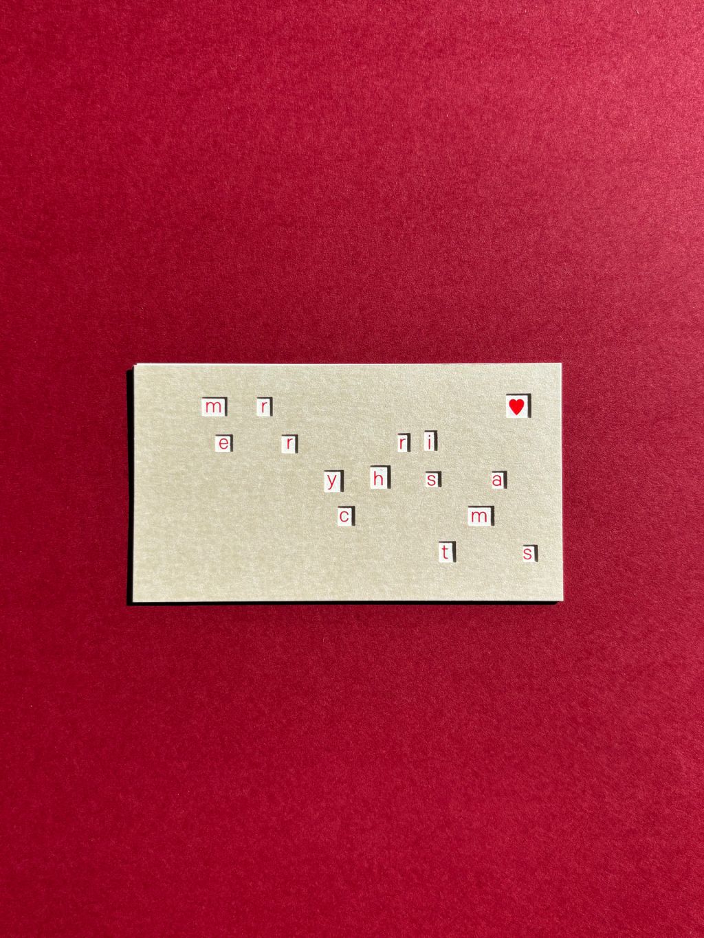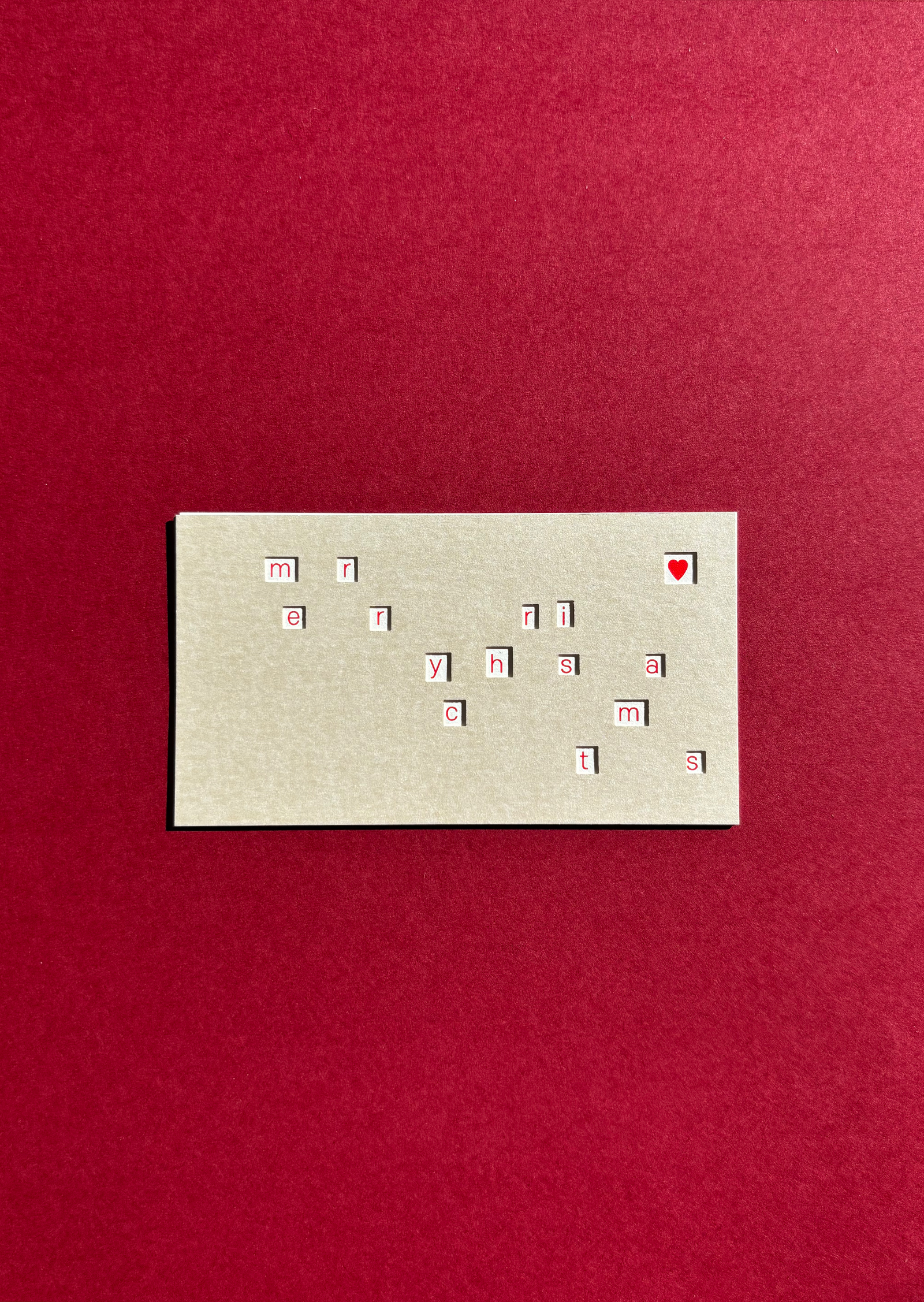 암호처럼 쓰인 알파벳 카드 위에 카드를 겹치면 Merry Christmas 글자가 나타납니다.